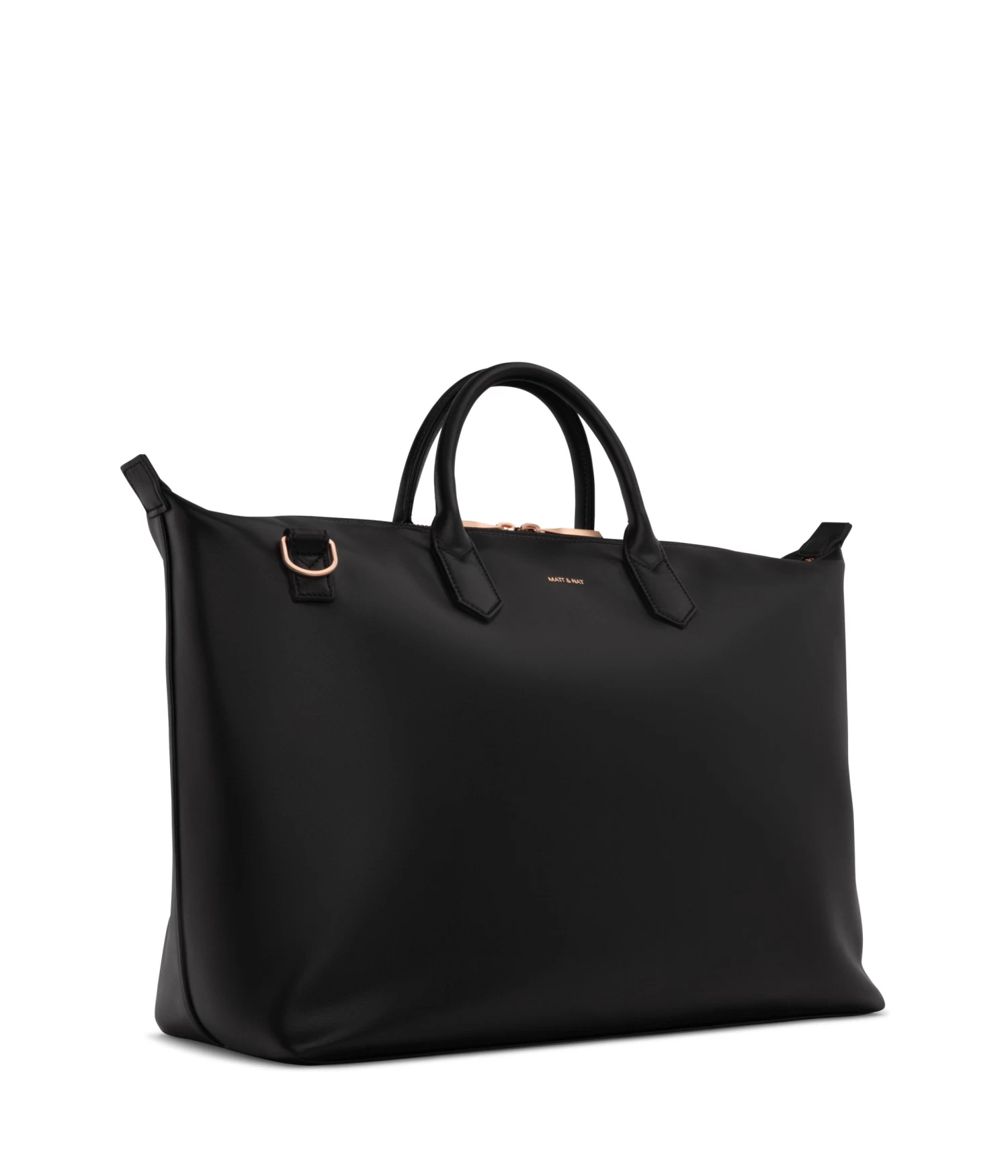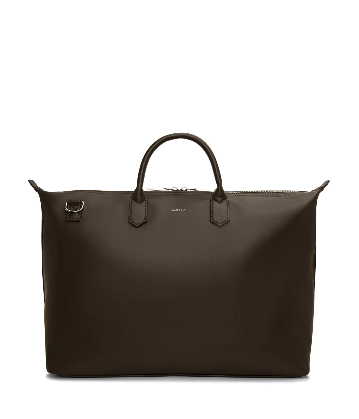 Weekender bag with two-way metal zip closure at top and tab detail at the zipper ends. Comes with a removable and adjustable crossbody strap.
