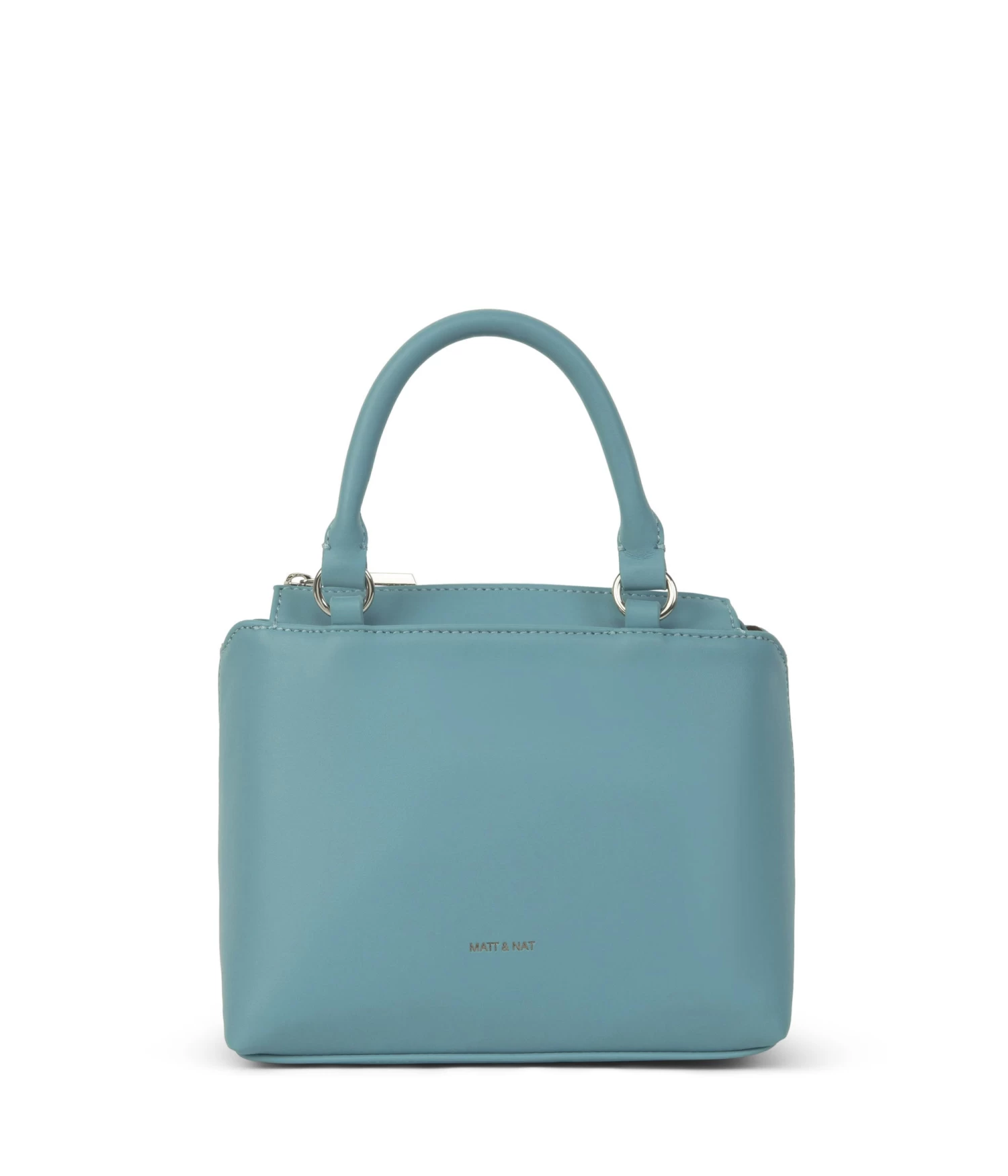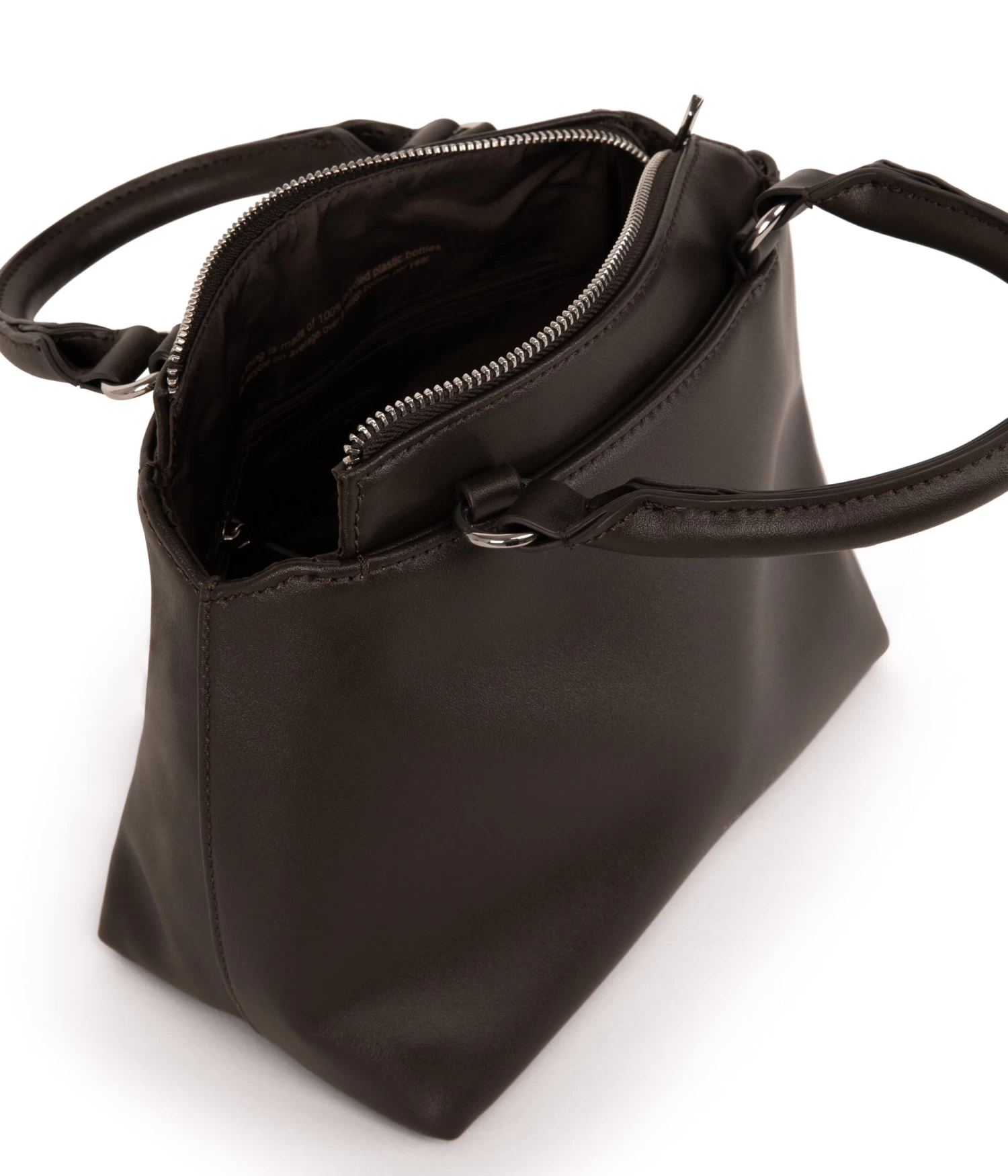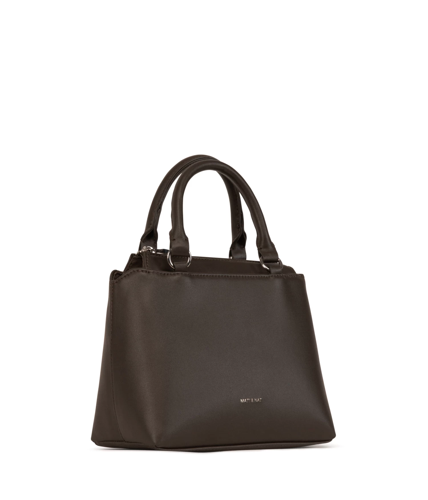 Small satchel with zip closure, handles to hand-carry, and a detachable and adjustable crossbody strap.