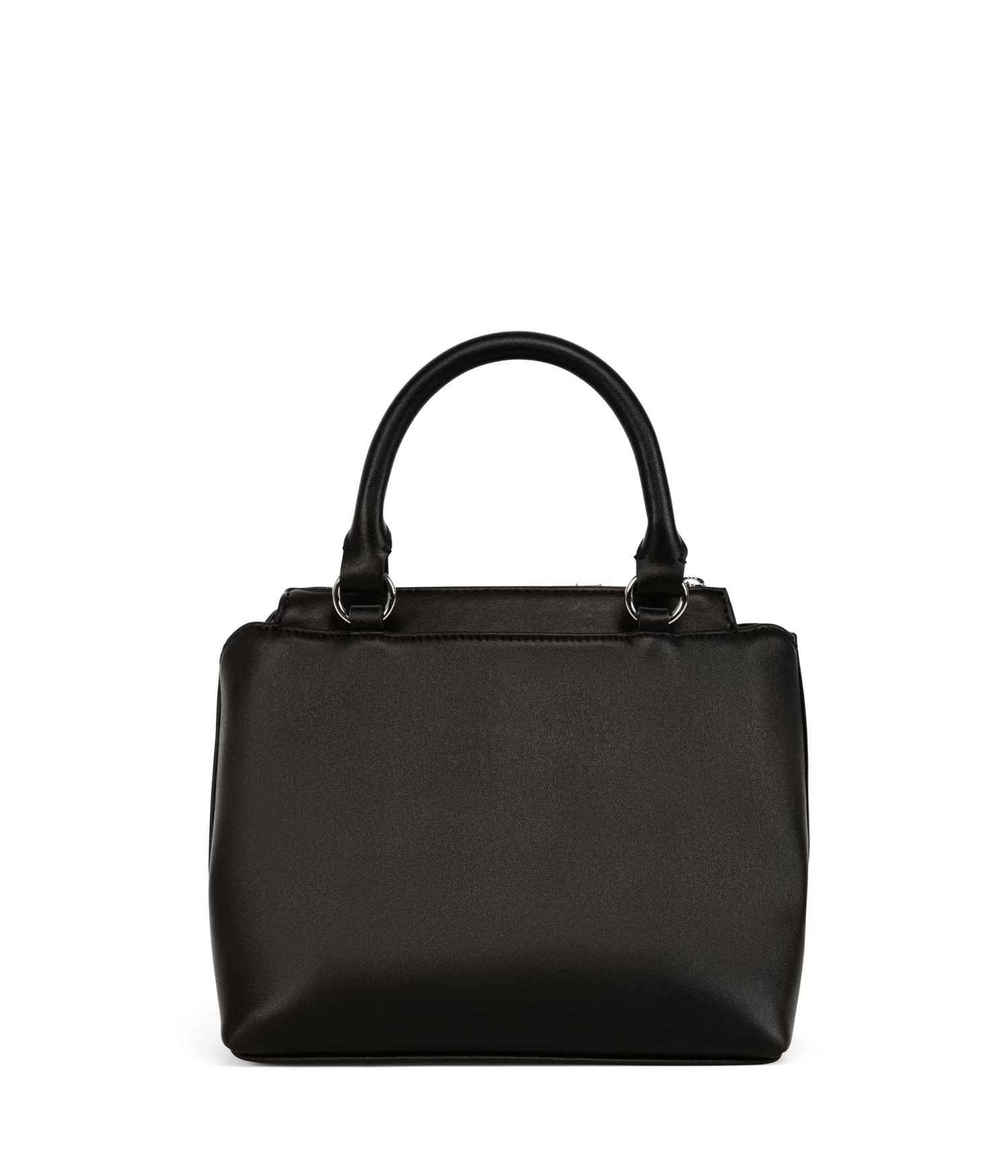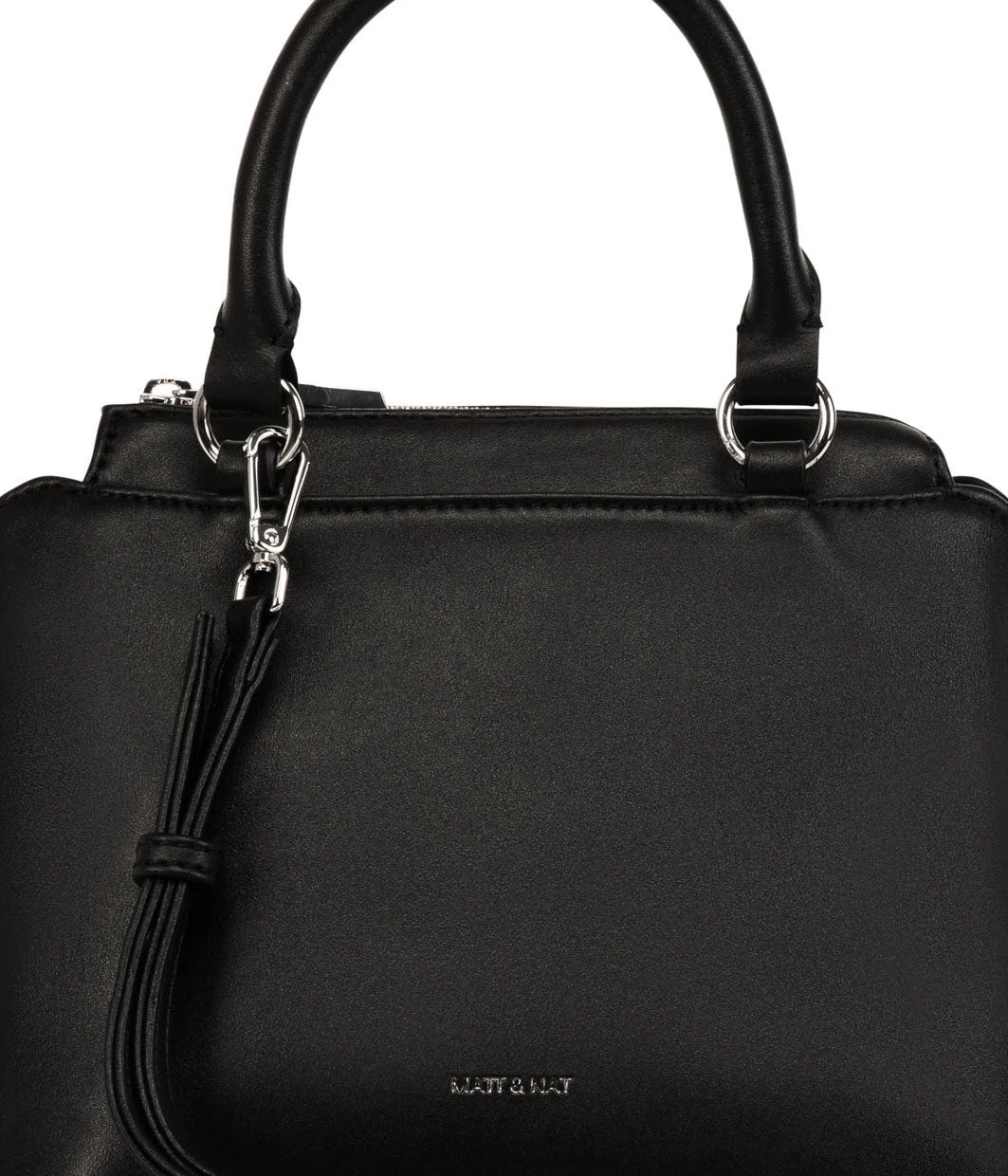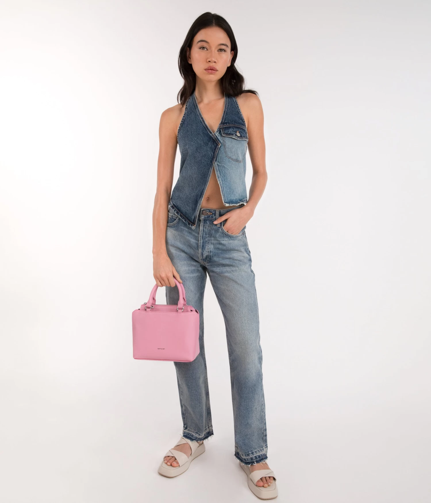 Small satchel with zip closure, handles to hand-carry, and a detachable and adjustable crossbody strap.