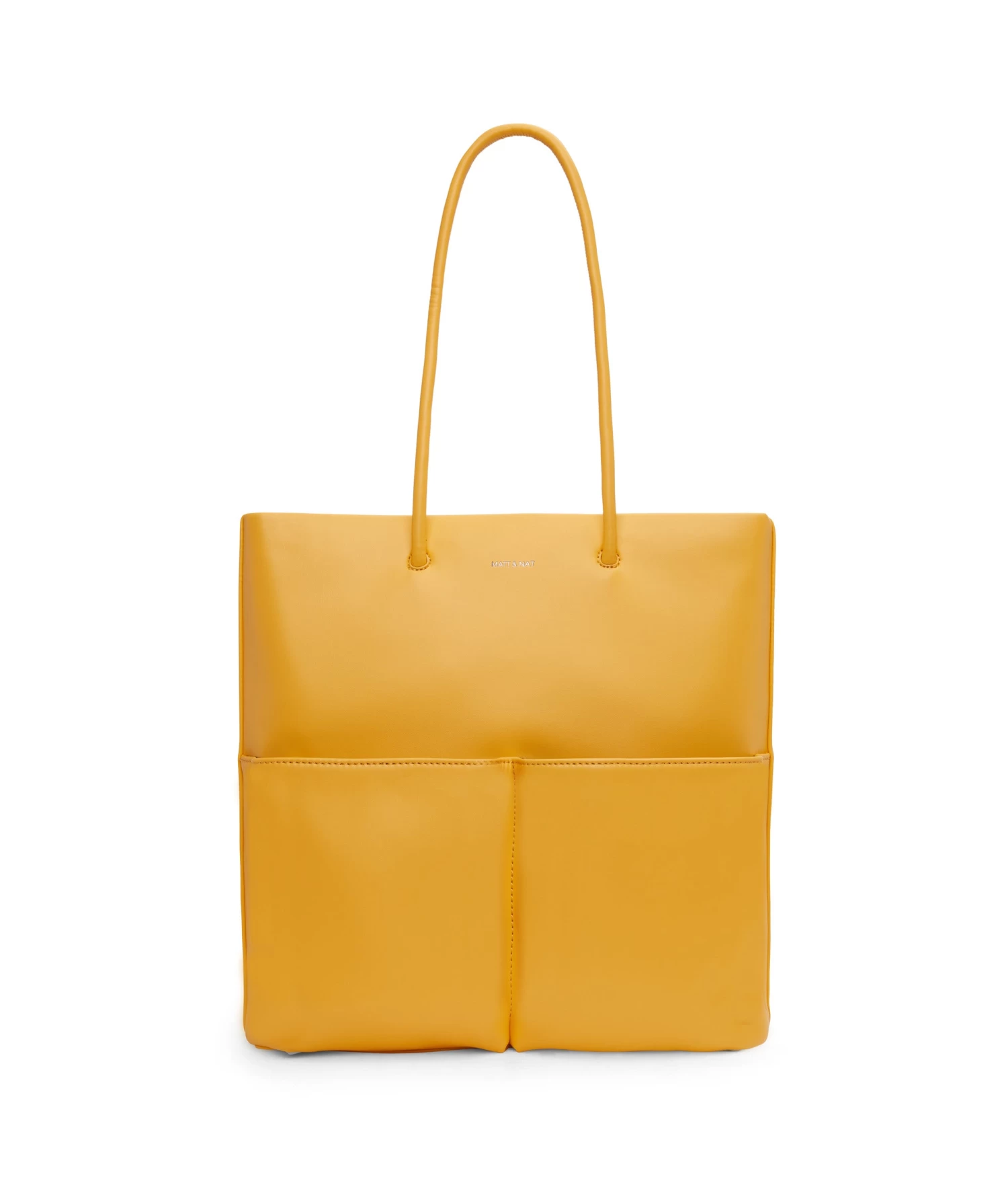 Tote with skinny tubular handles, main compartment with zip closure, 1 front pocket with zip closure and 1 front pocket with magnetic snap closure.