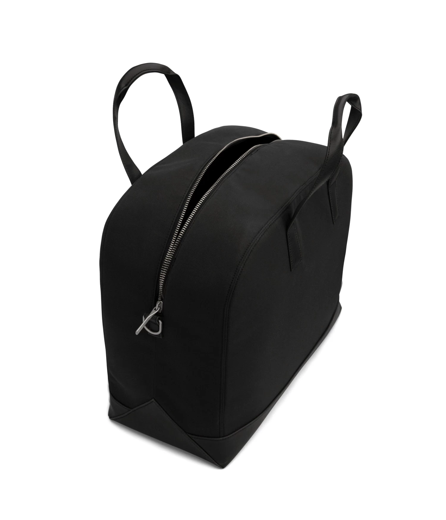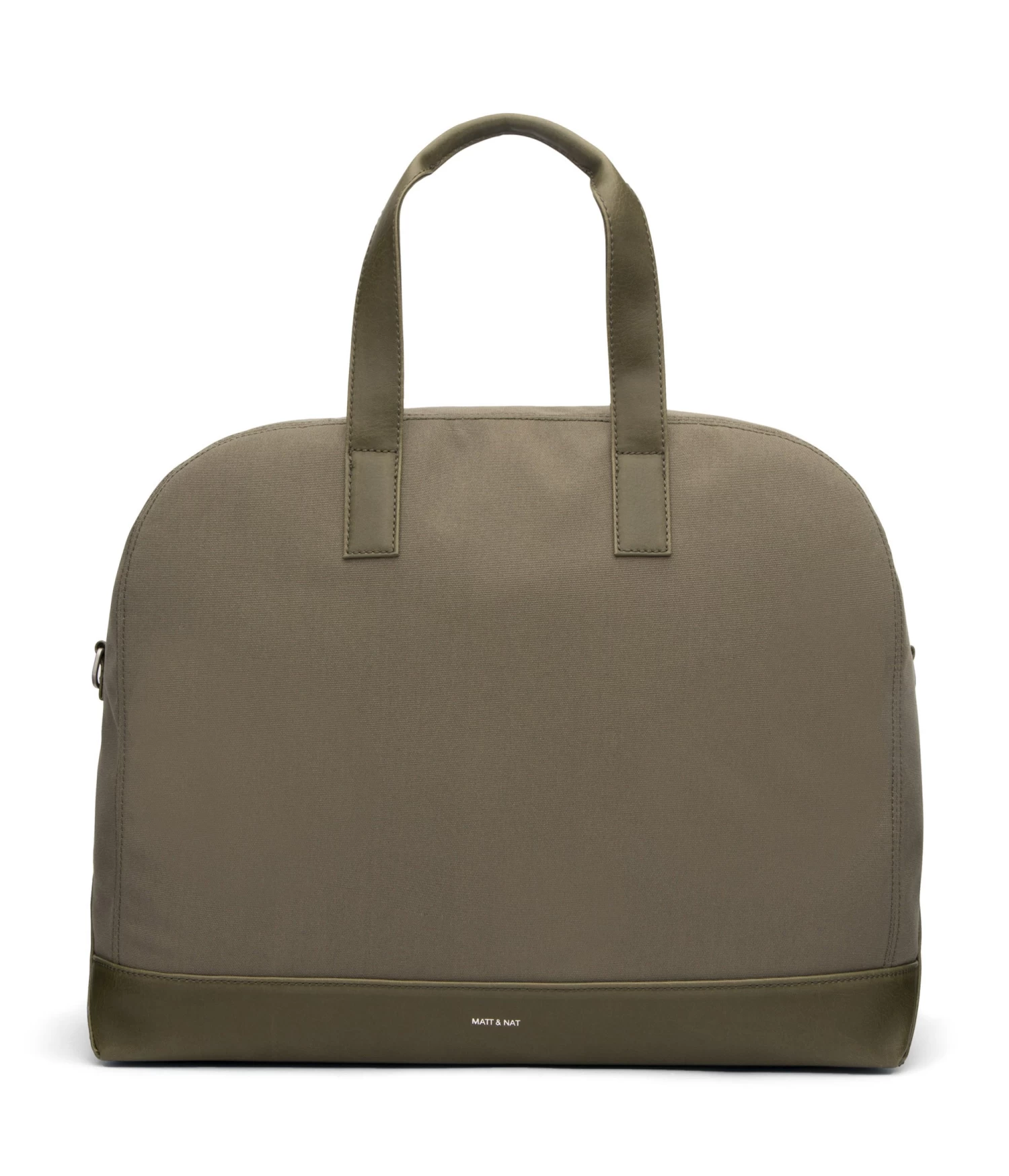 Weekender bag with adjustable and removable crossbody strap. Top main zipper closure.