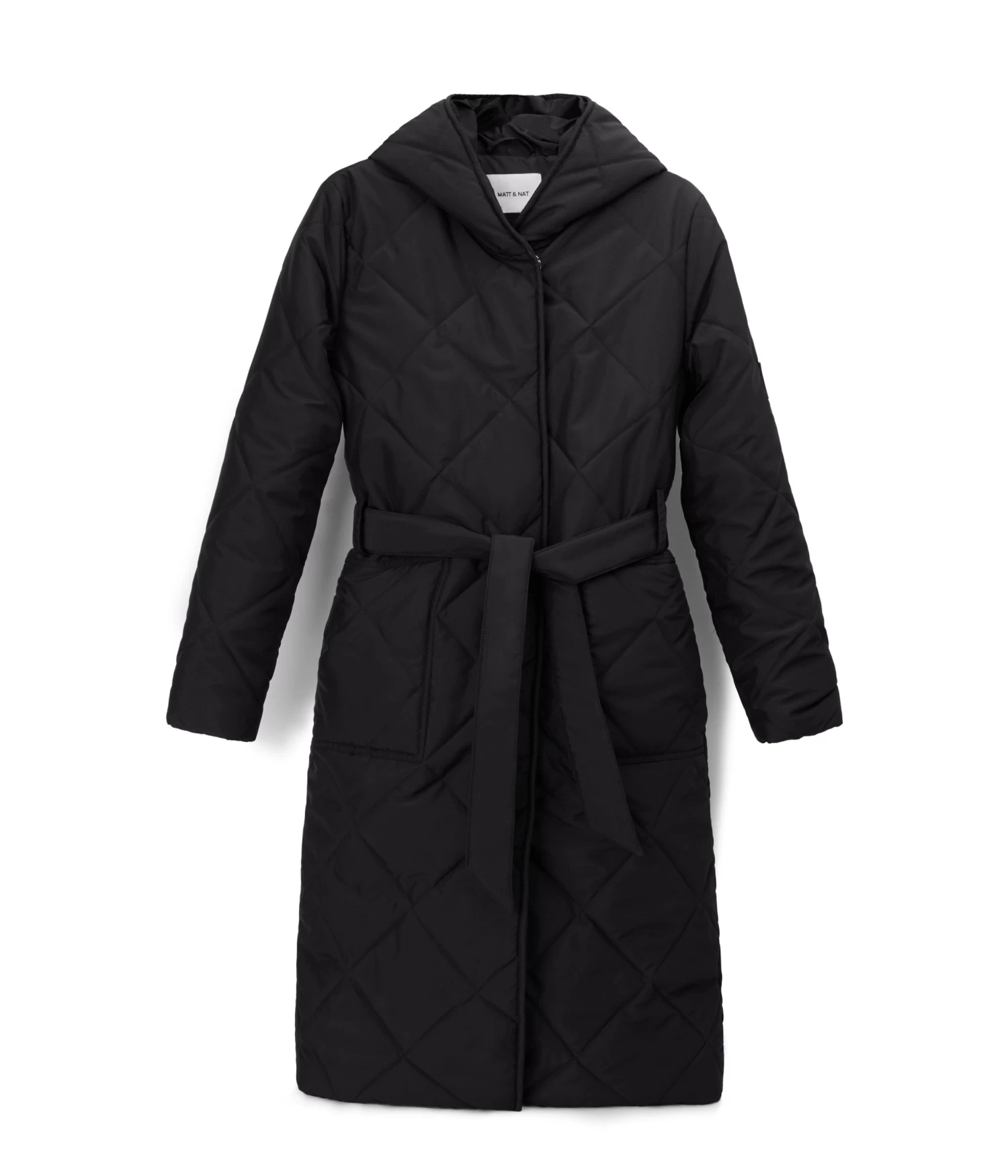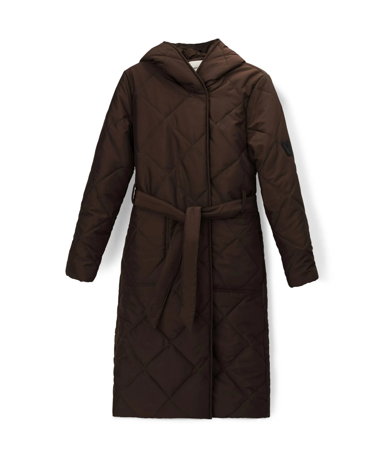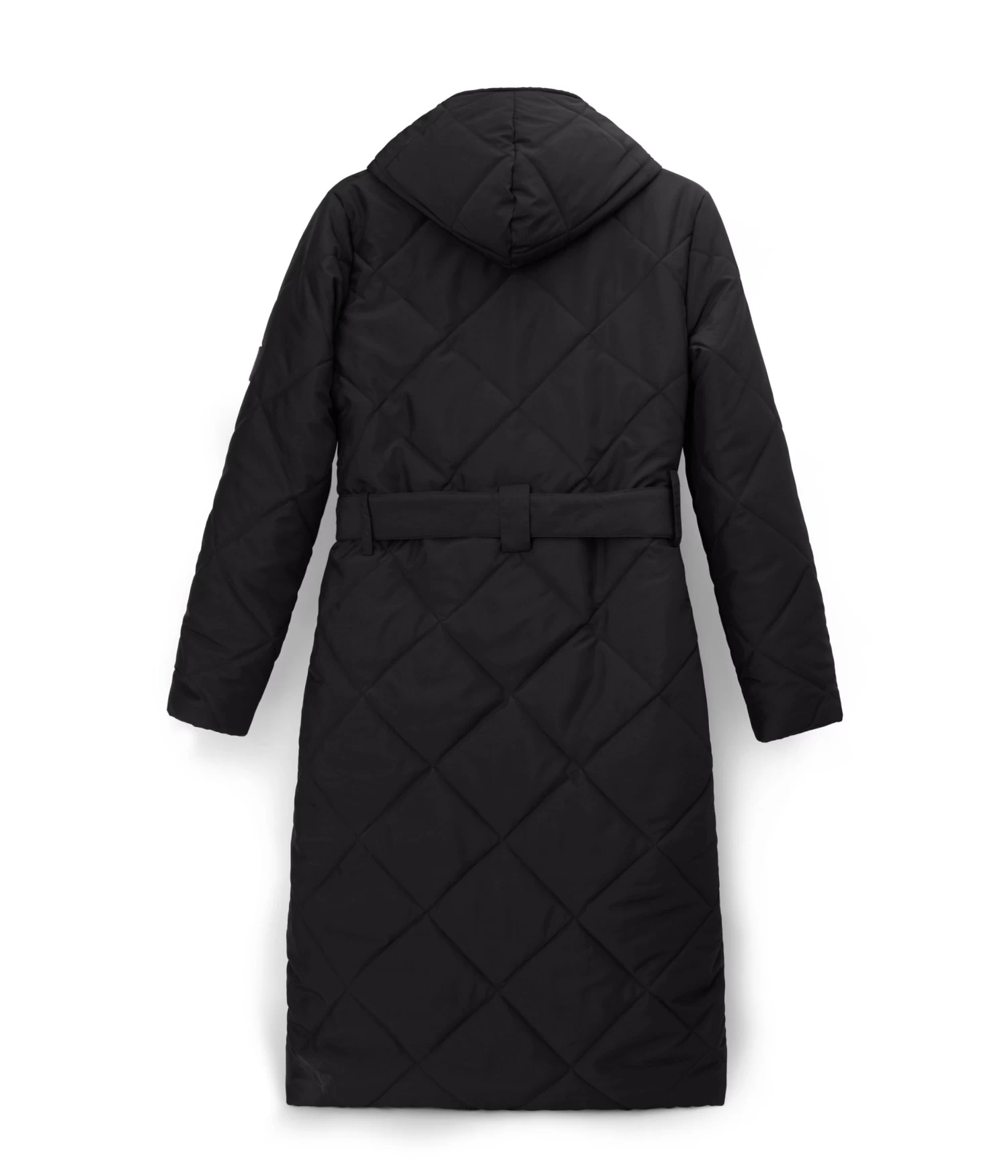 Quilted recycled jacket with long sleeves, non-removable hood, padded patch pockets, 2 hidden snap closures with self tie-belt, and an internal chest pocket.