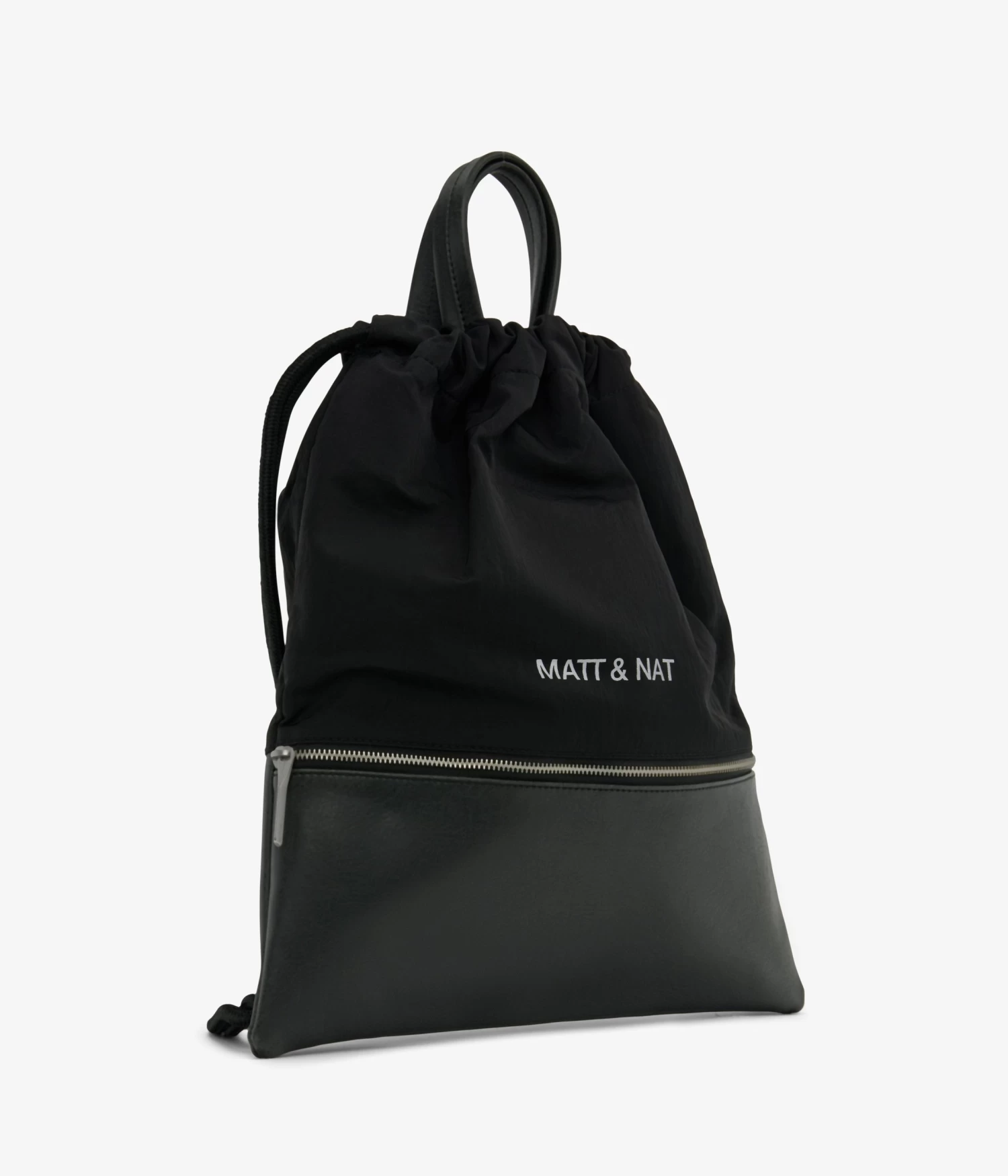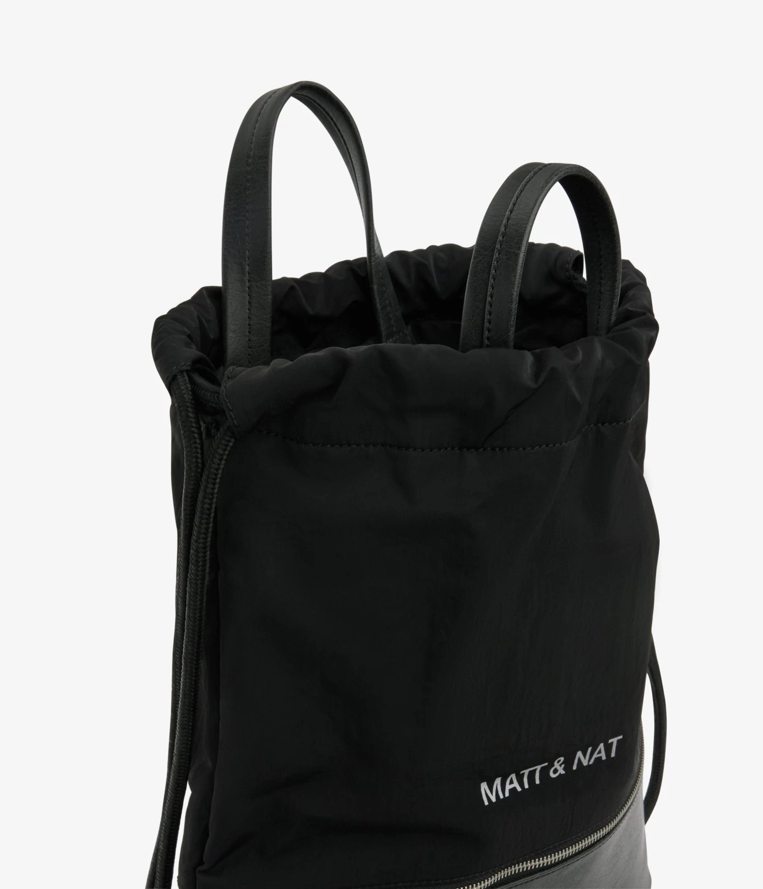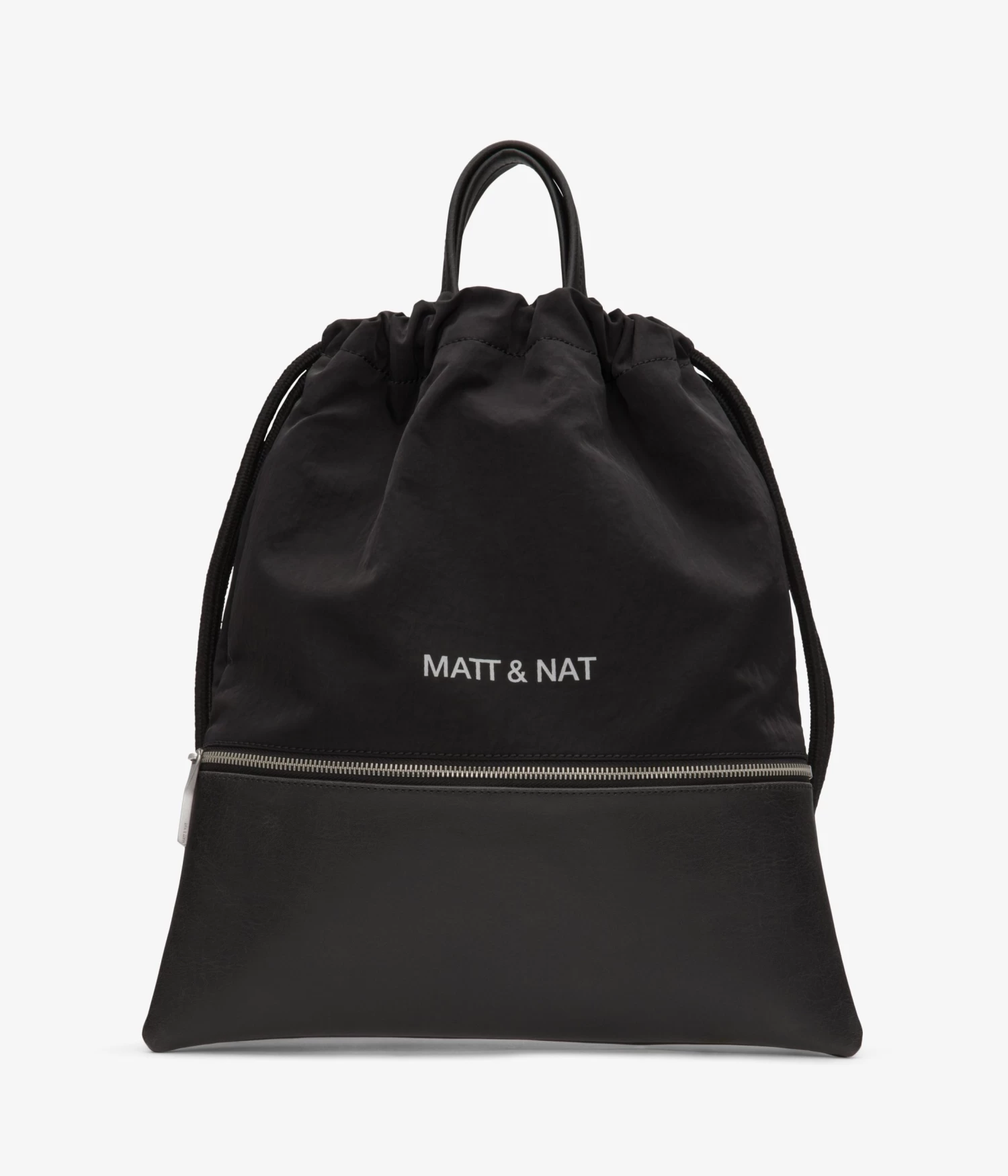 Drawstring backpack with front zipper pocket.