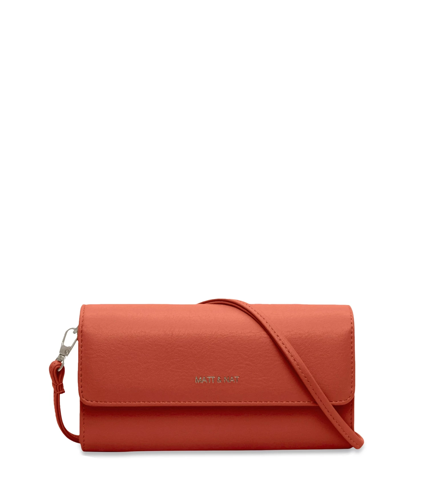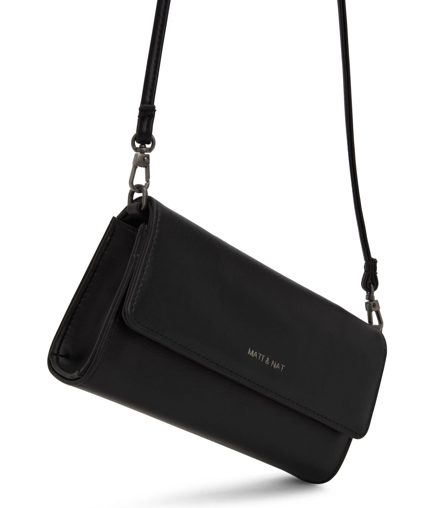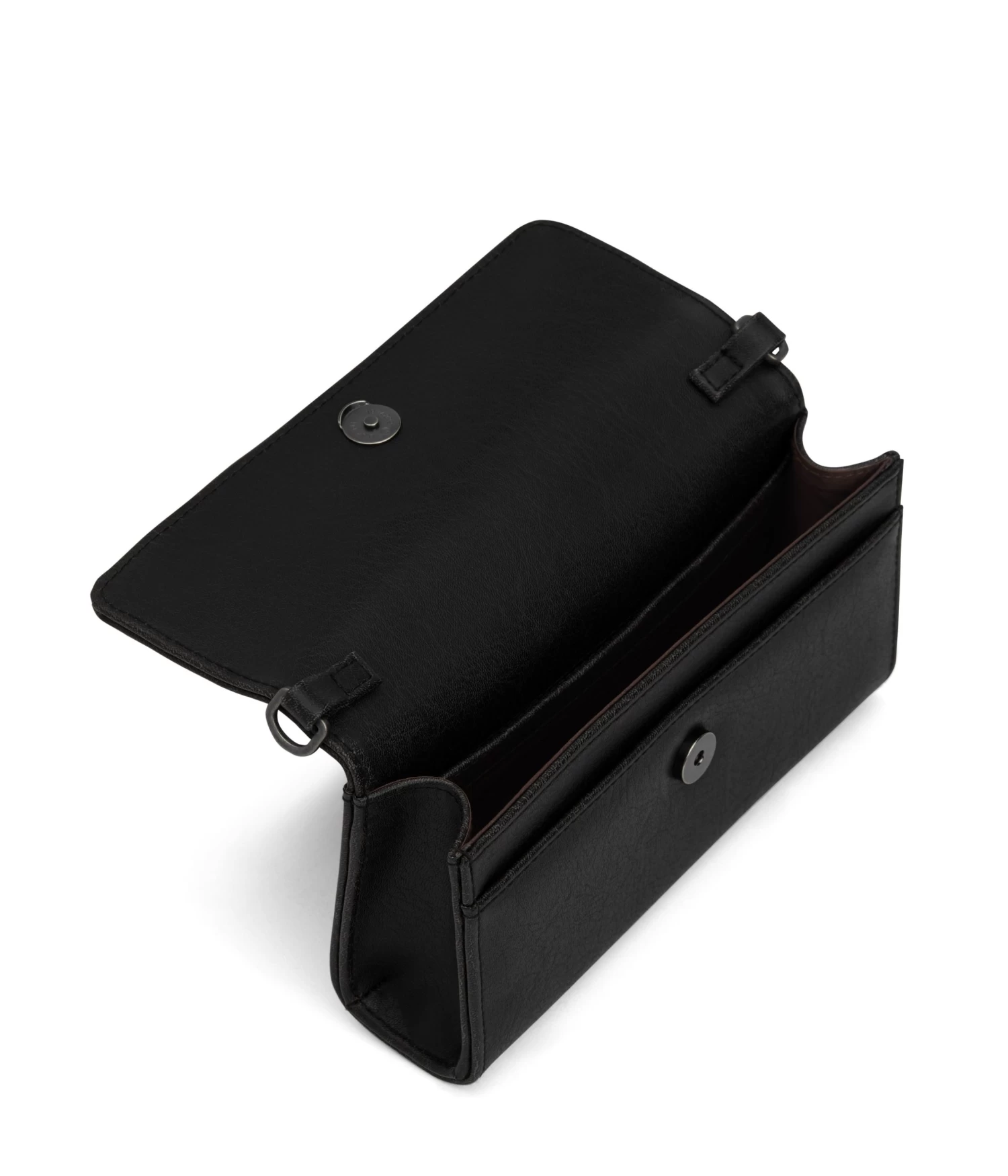 Structured crossbody bag with a detachable strap. Top flap with magnetic snap closure. Slip pocket on front and back of bag. Fits an iPhone 11 Pro Max.
