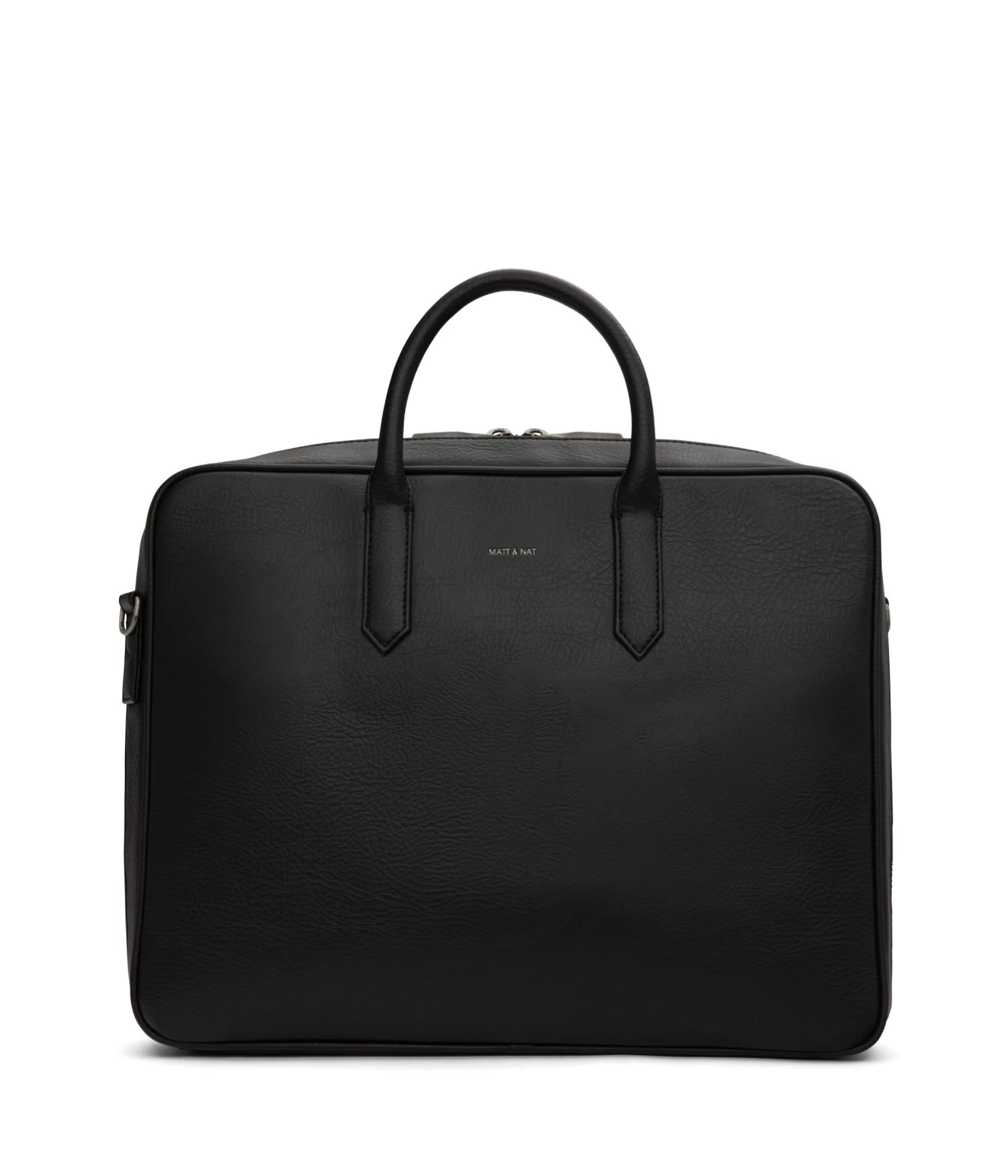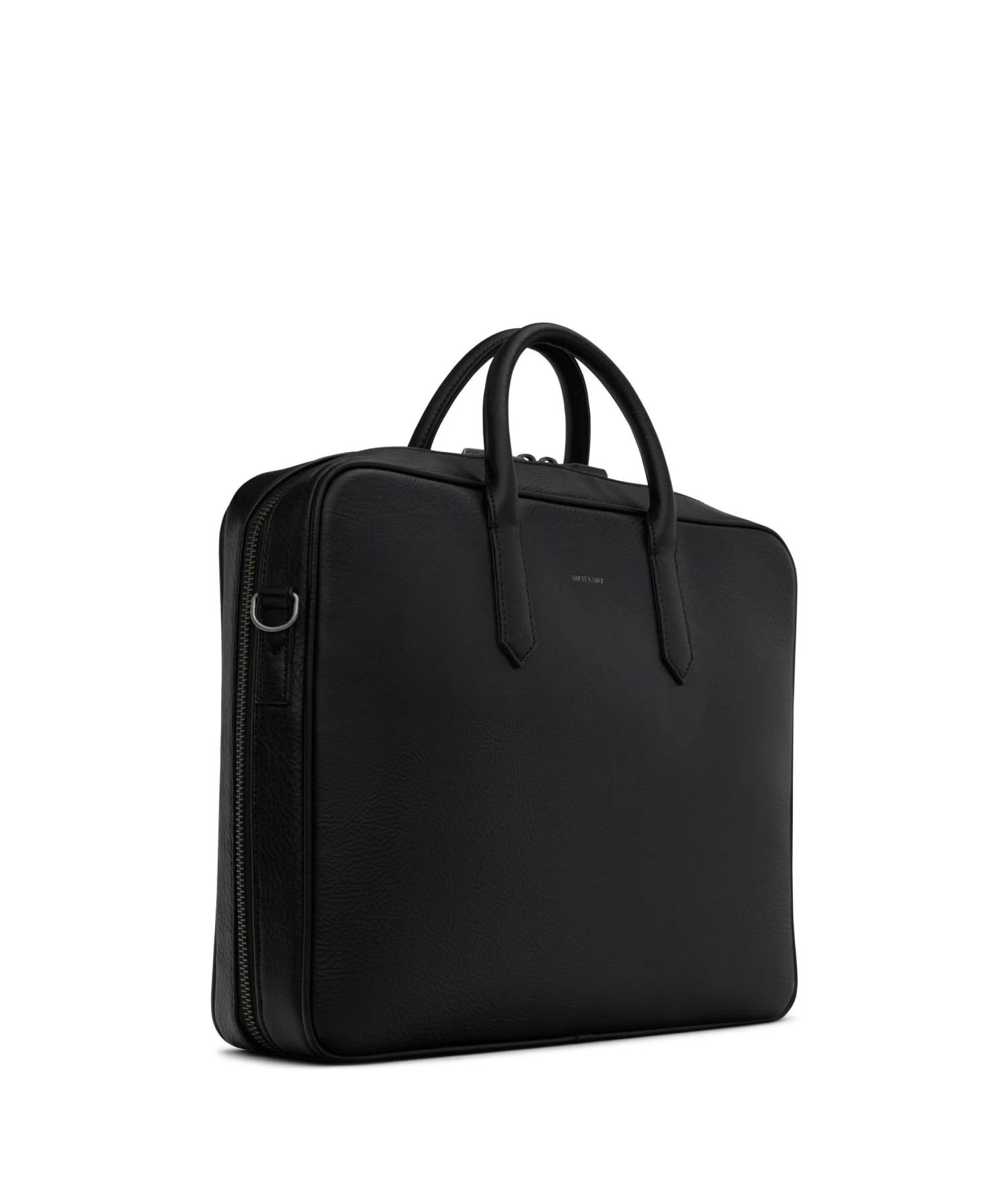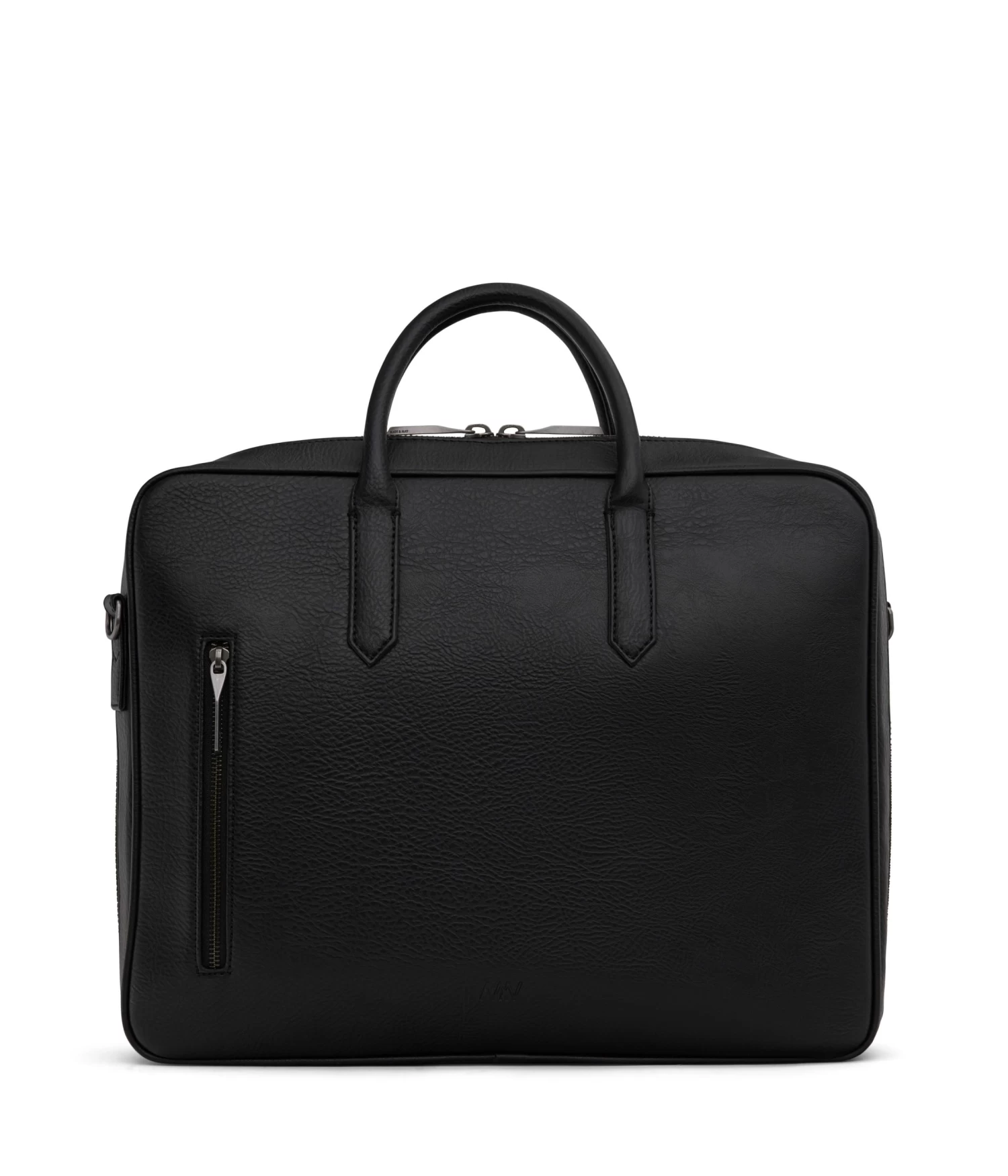 Briefcase with two-way metal zip closure that extends to bottom gusset. Tubular handles. Metal zip pocket on exterior back. Comes with a removable and adjustable crossbody strap with a standard shoulder patch. Fits a 15” laptop.