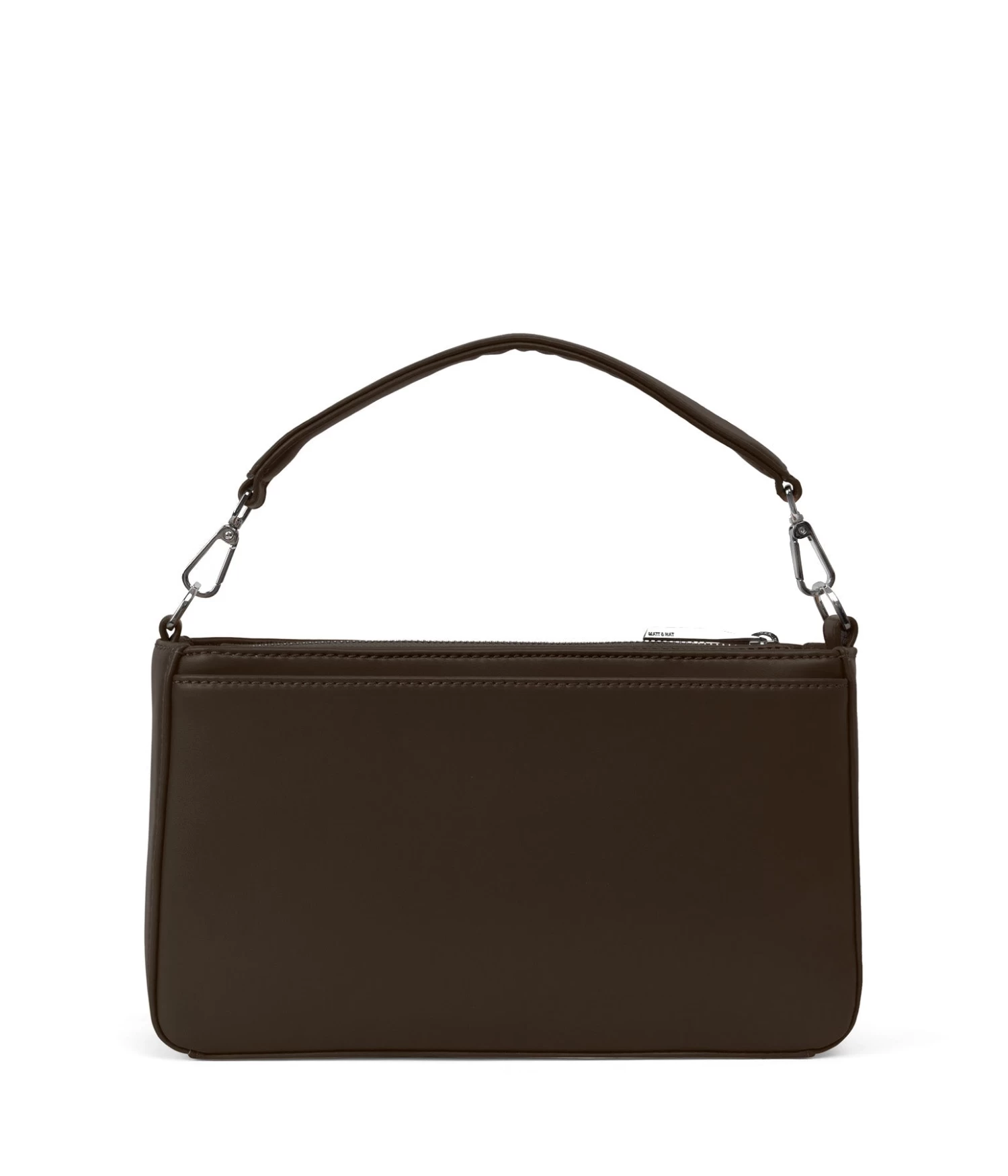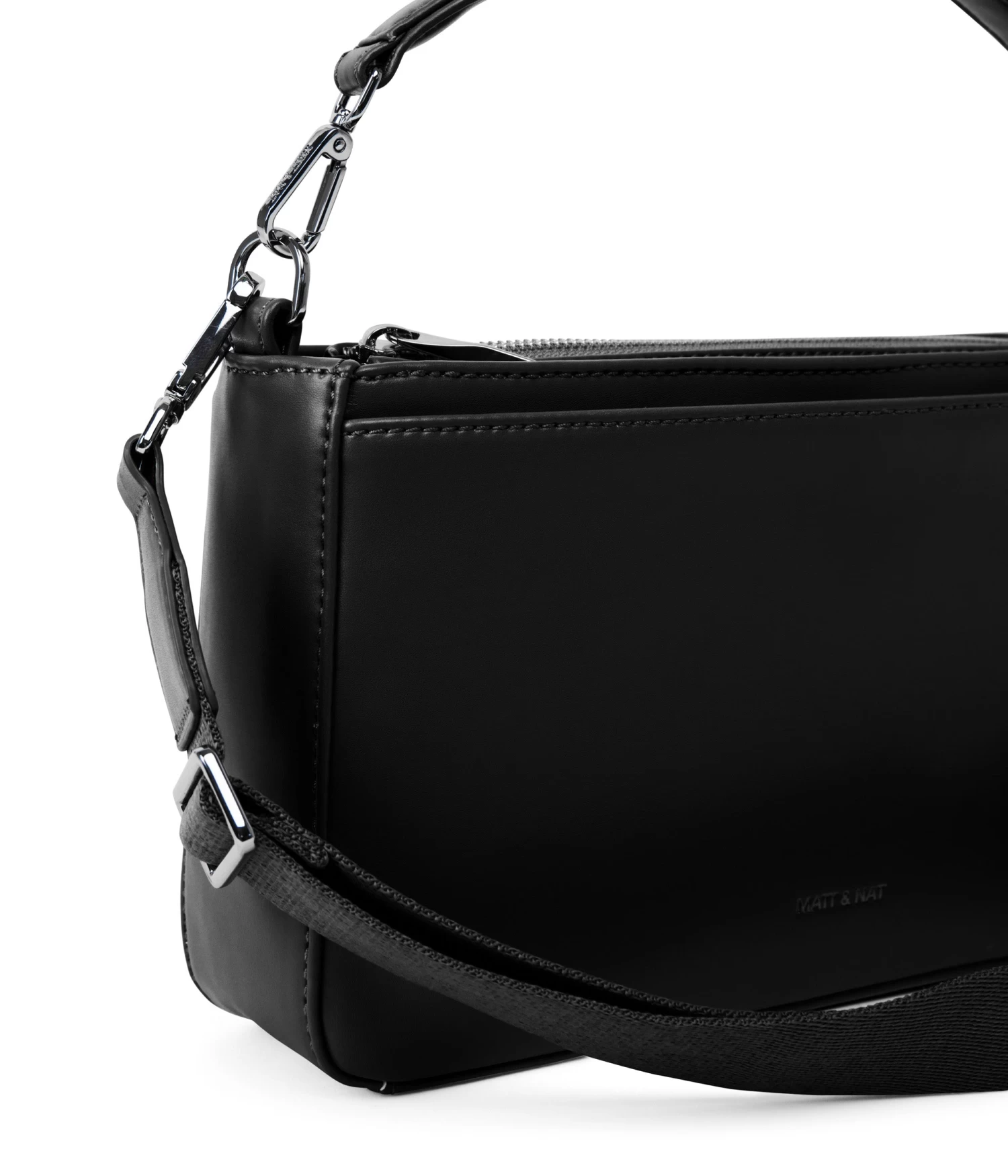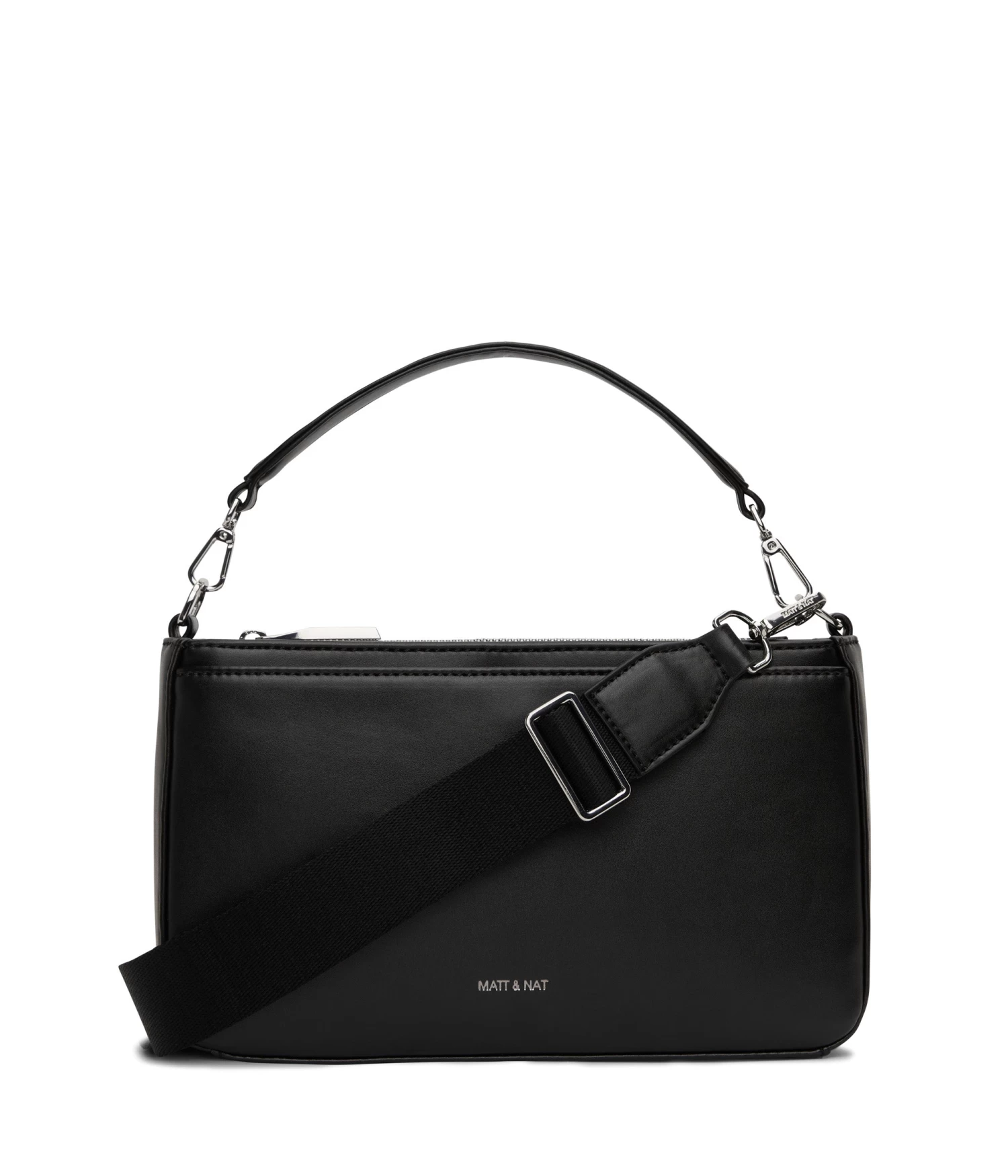 Convertible crossbody/shoulder bag with a detachable and adjustable webbing strap, a detachable top handle to hand-carry, zip closure at the main compartment, and front and back slip pockets with snap closure.