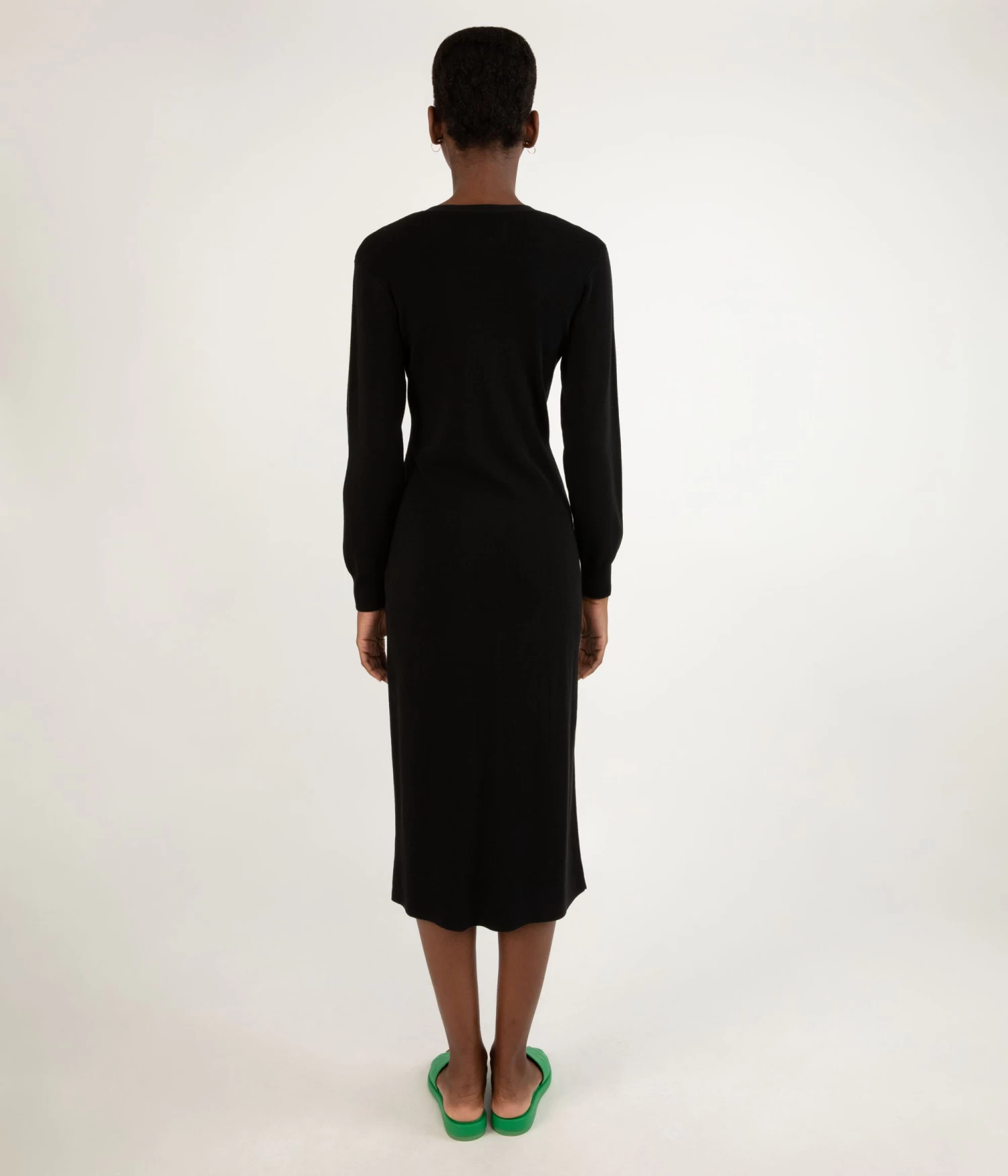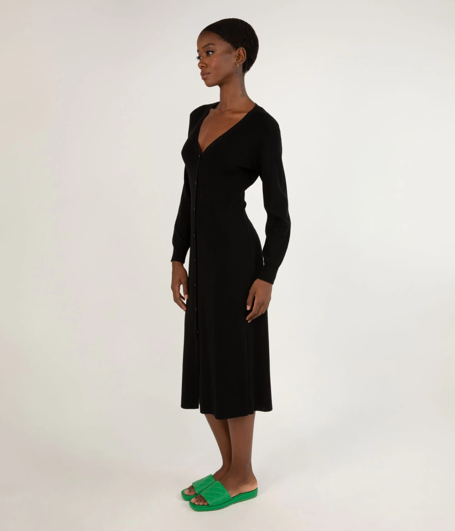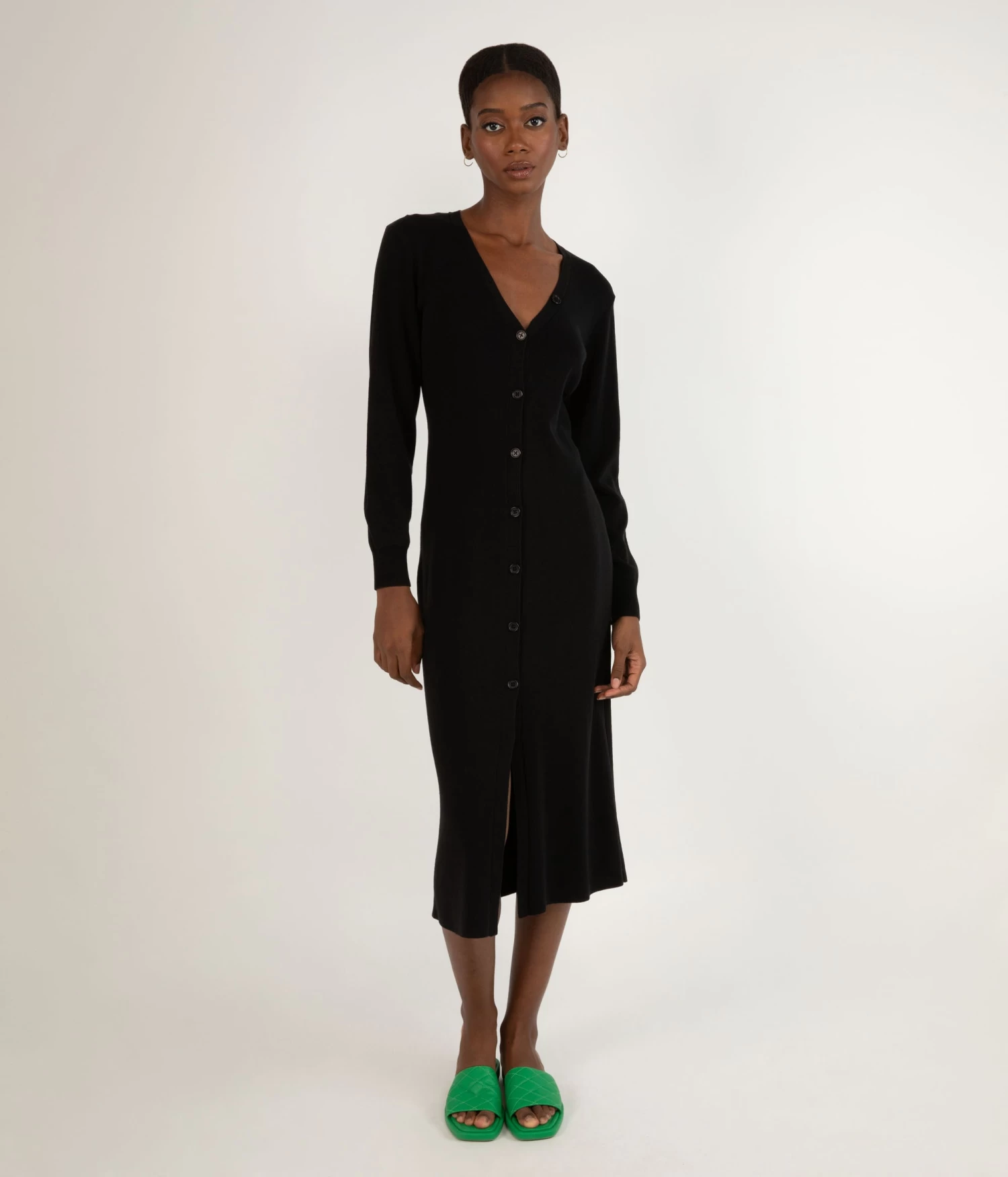 Long sleeve button front longline cardigan with v-neck and ribbed cuff finish.