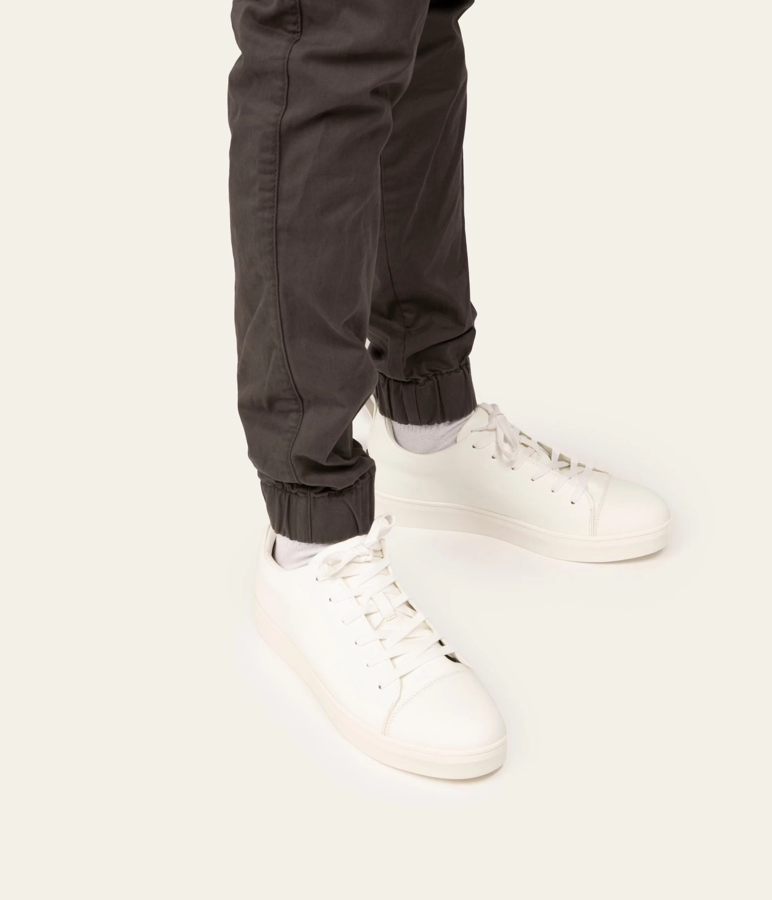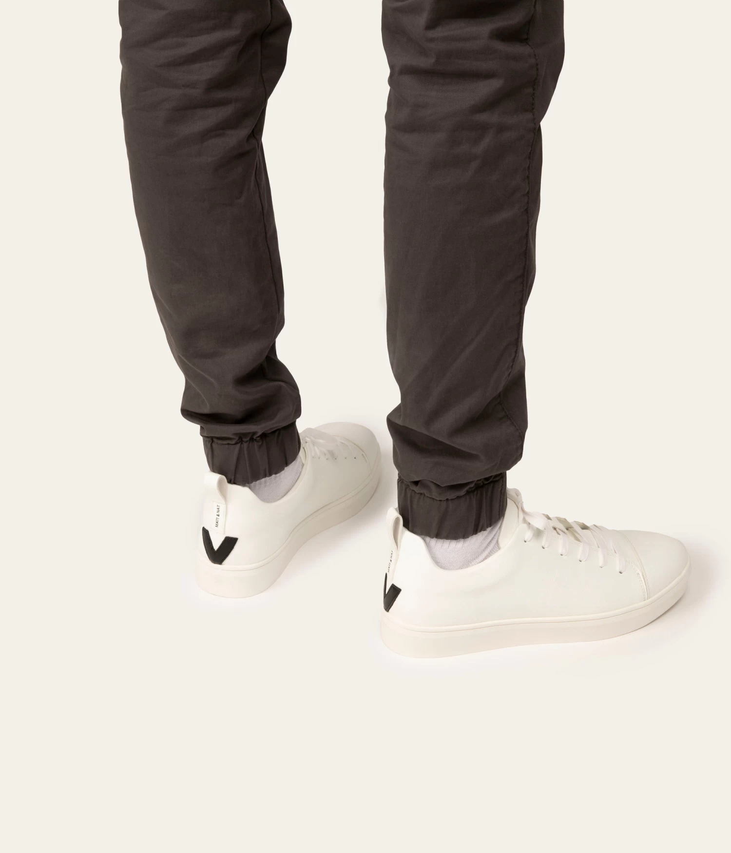 Men’s modern sneaker with simple upper and V logo detail at the back counter.