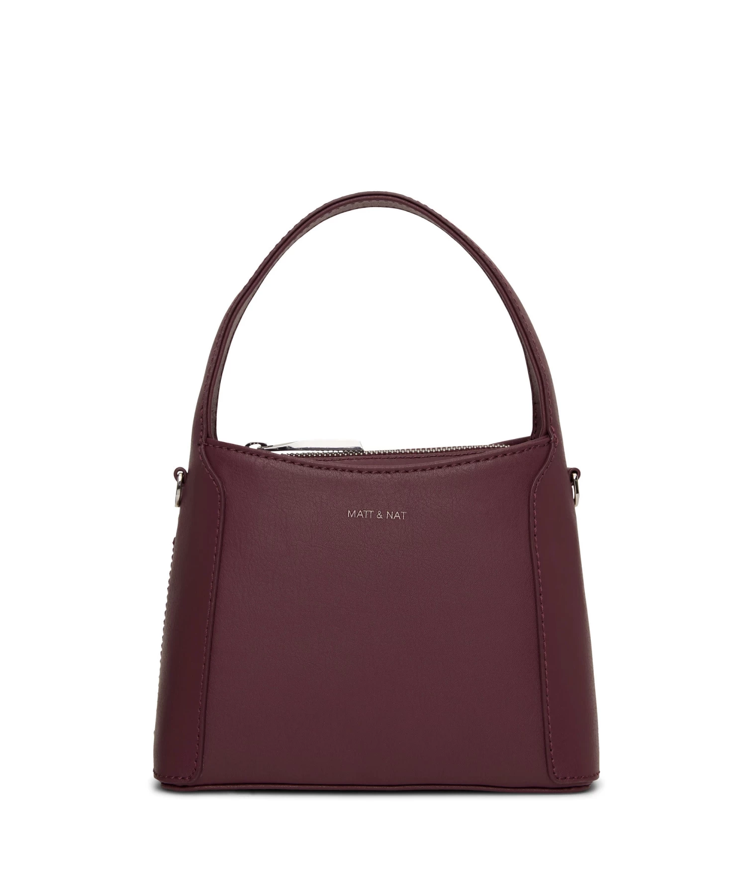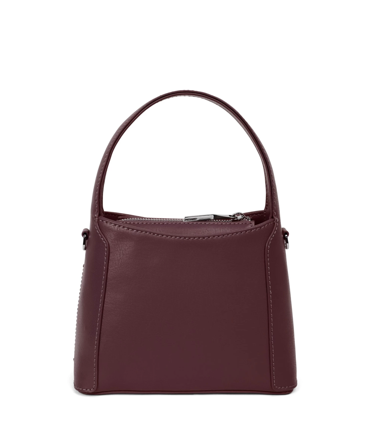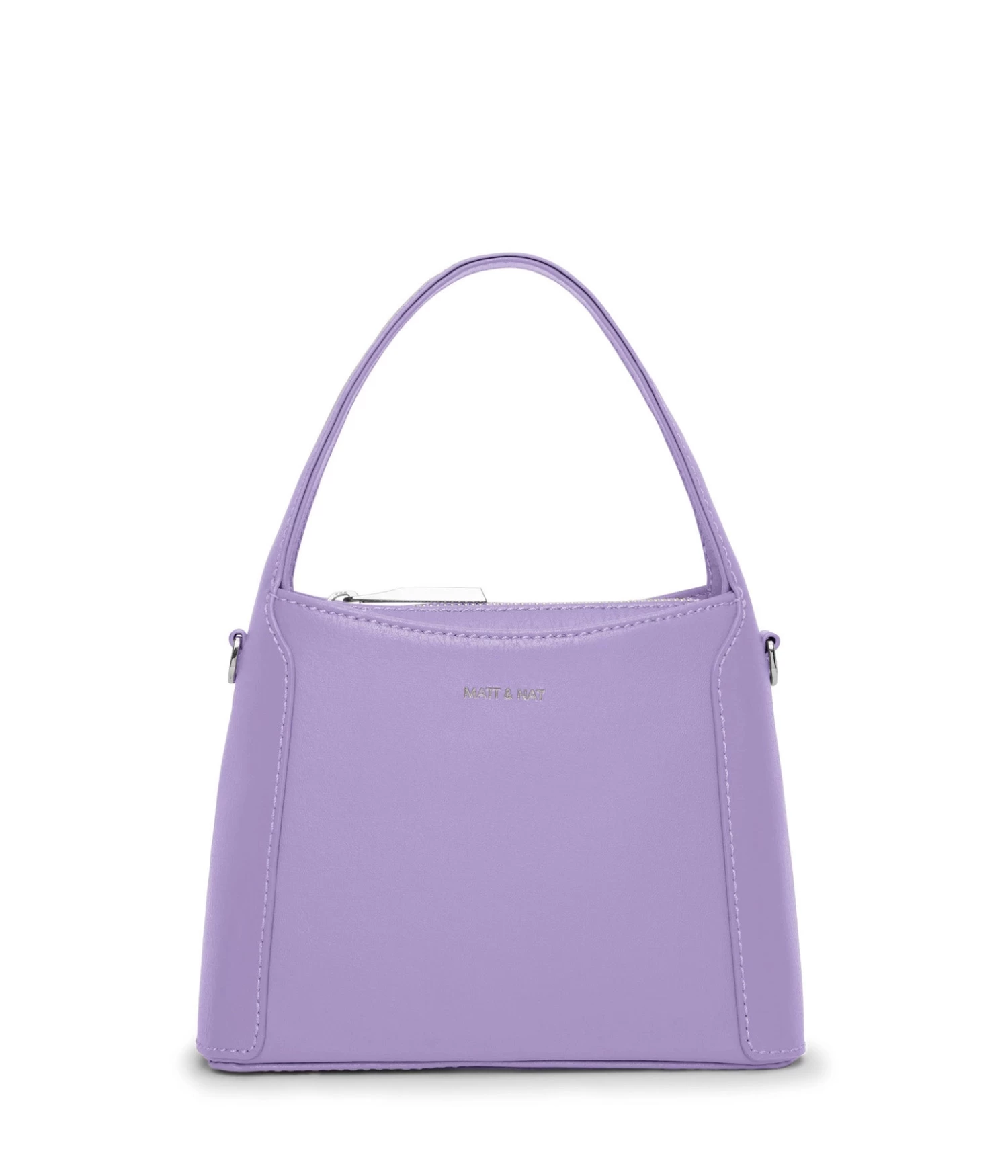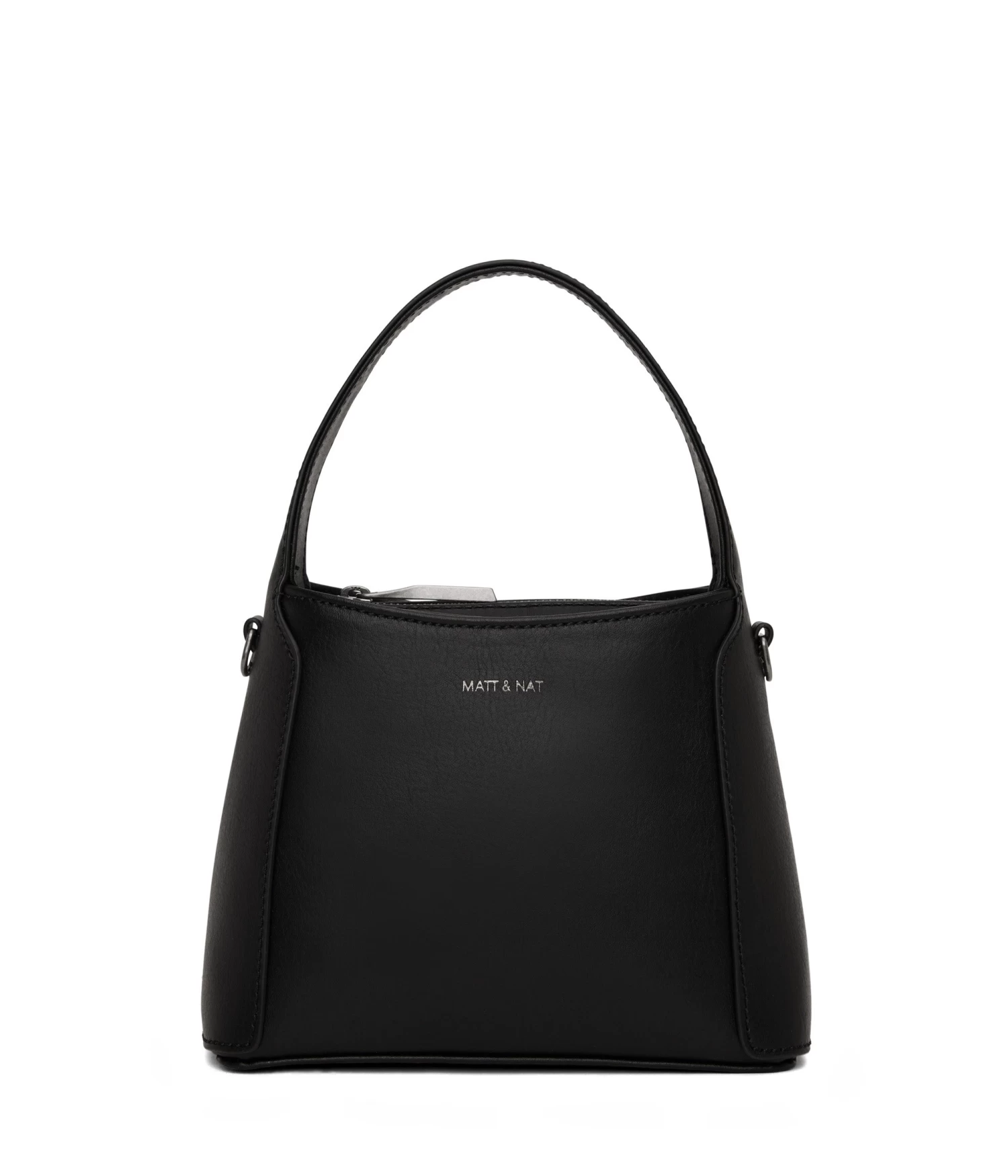 Small crossbody bag with a top handle and zippered compartment. Comes with a detachable and adjustable crossbody strap.