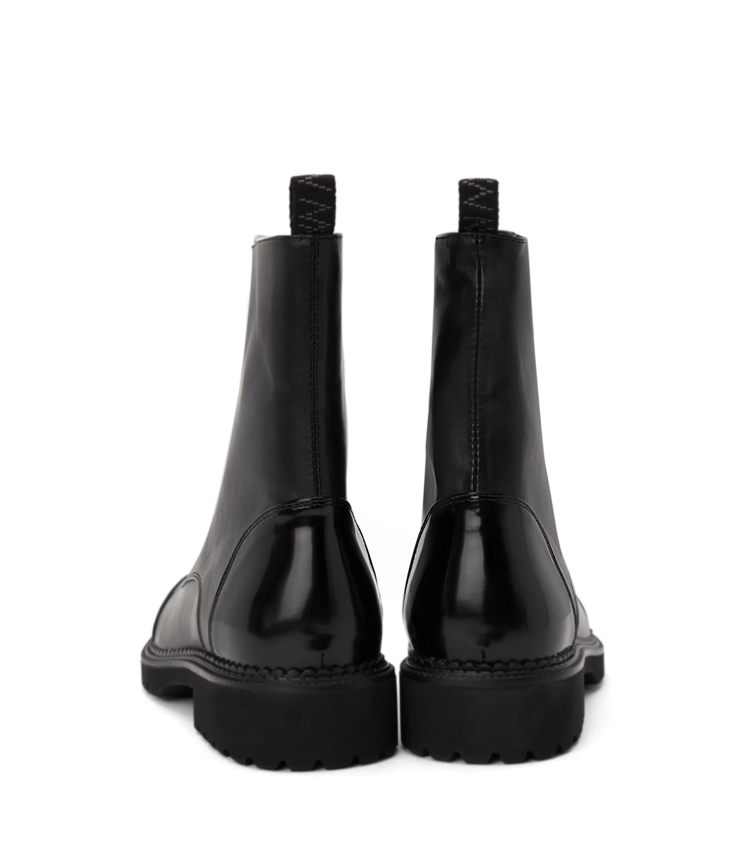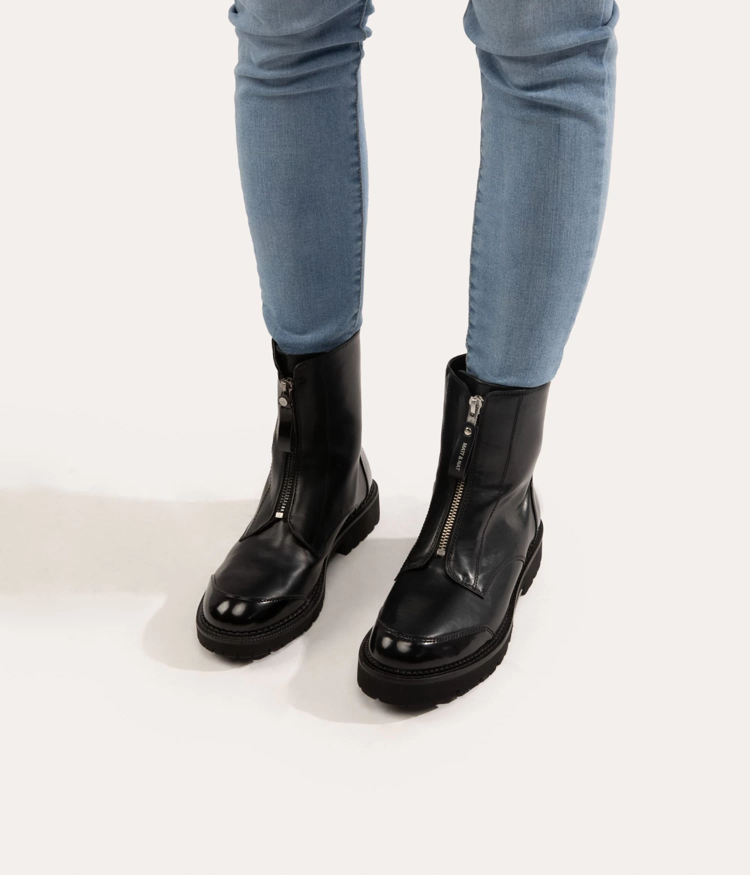 Women’s combat boot with YKK zipper main opening function and logo detail tab.
