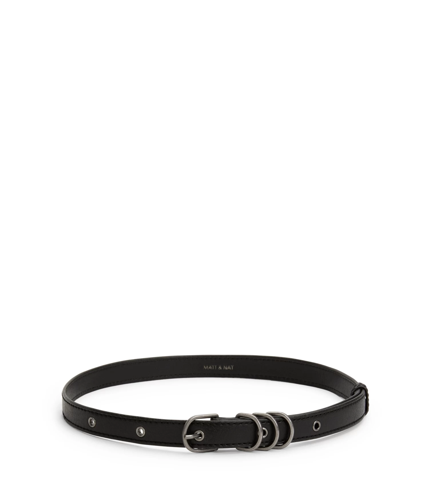 Skinny, regular waist belt with metal D-ring hardware and embossed logo at belt end.