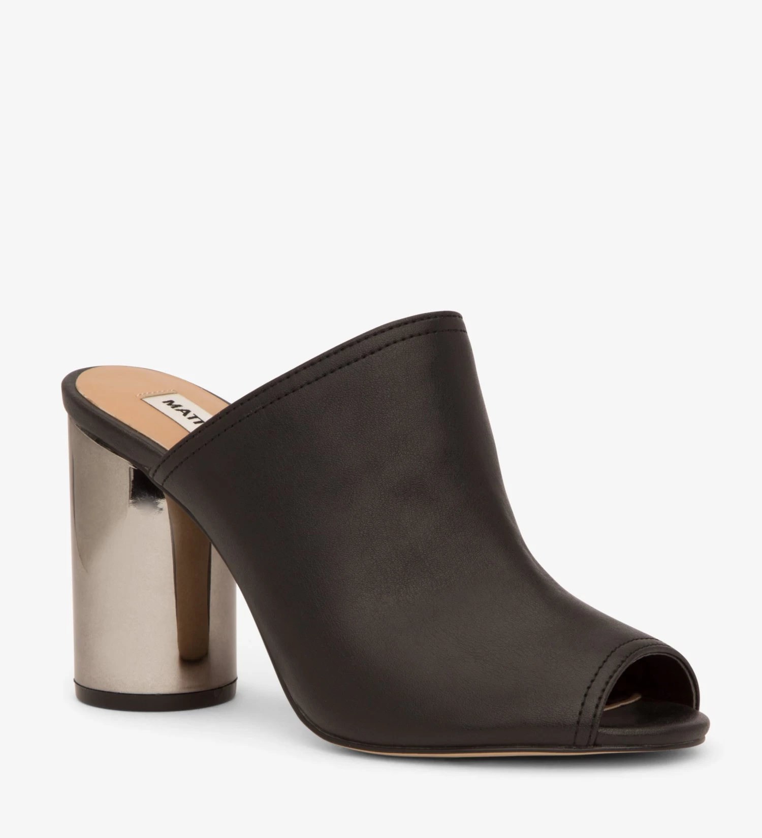 High heeled mule offered in smooth grain vegan leather and suede with a metallic wood, or shiny cylindrical heel finish.