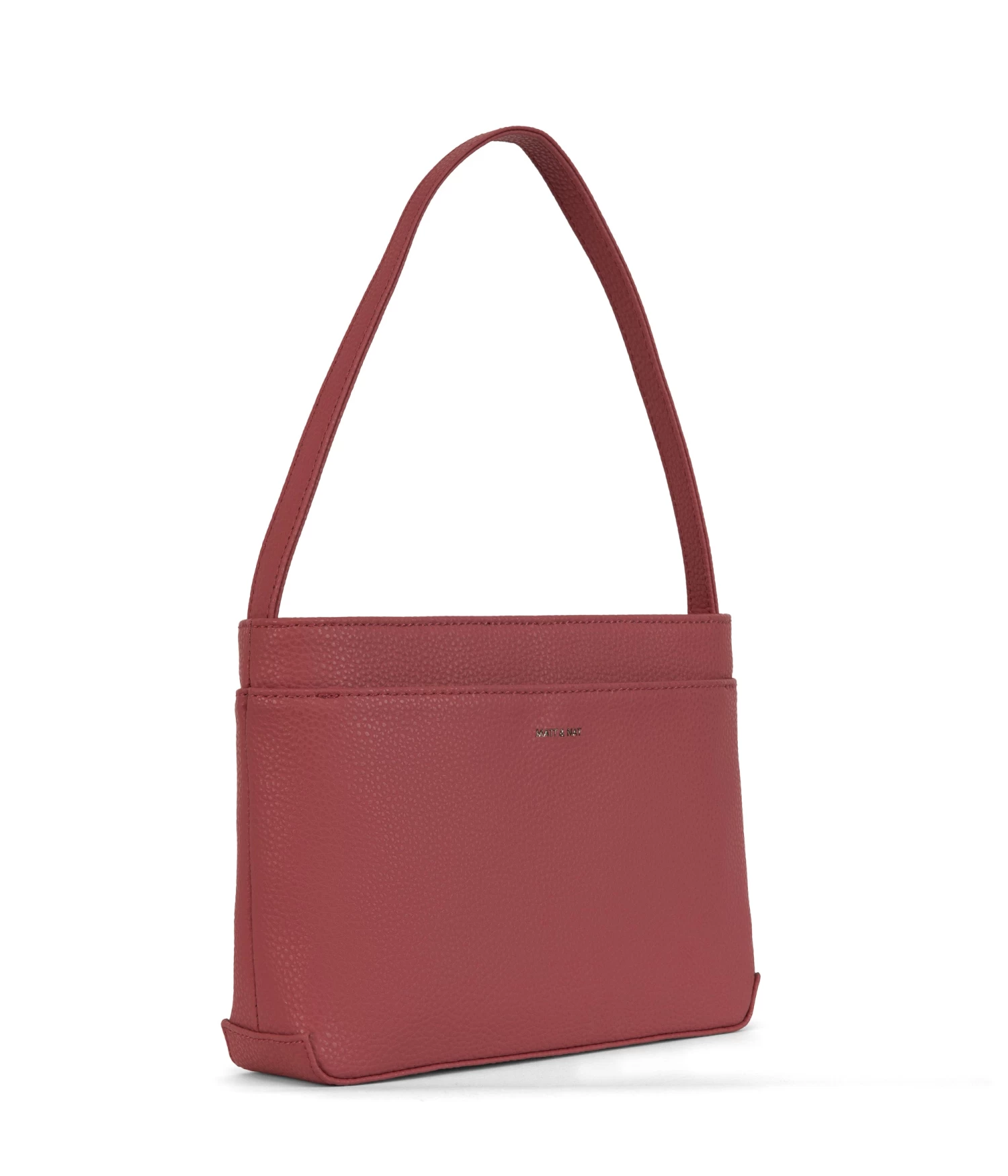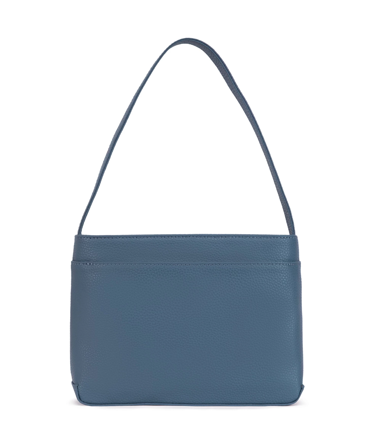 Shoulder bag with a zipper closure at main compartment and exterior slip pockets at front and back with snap button closures.