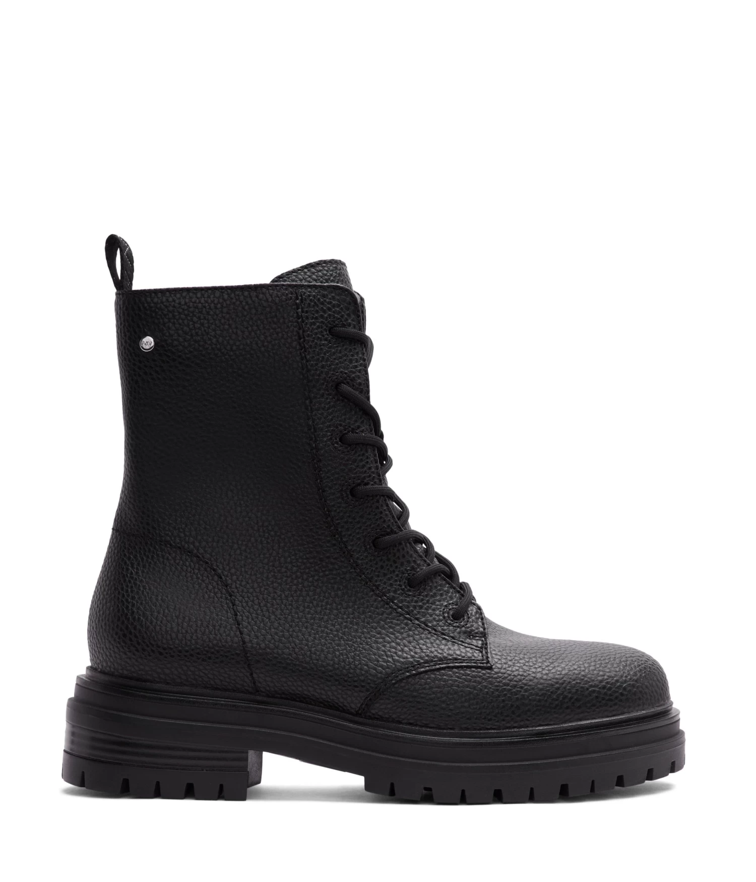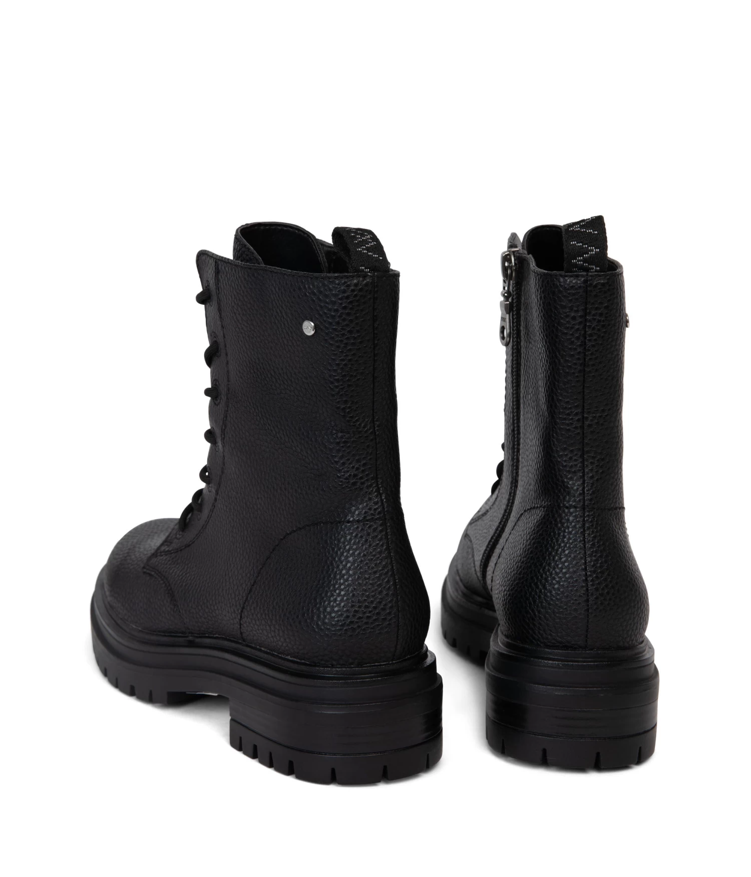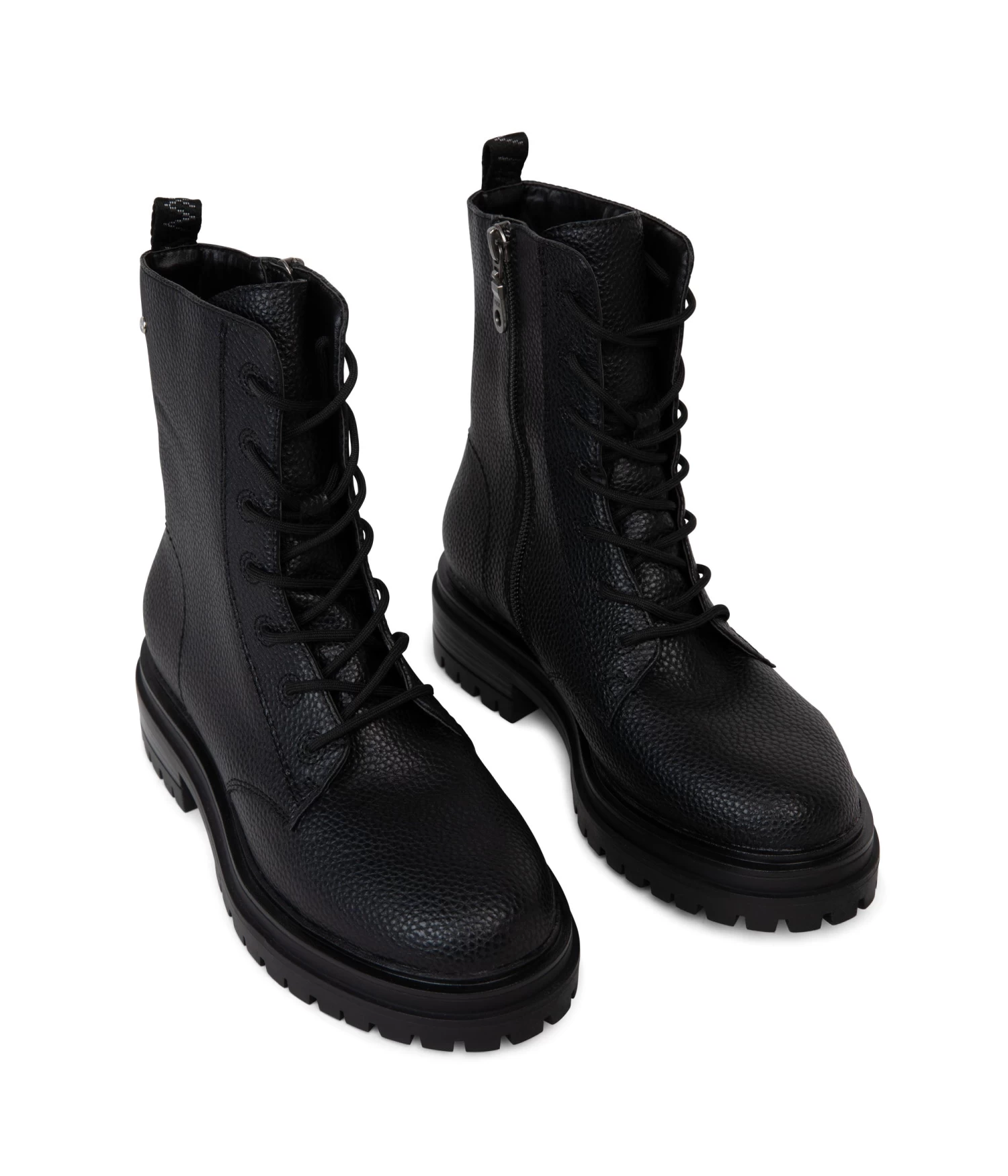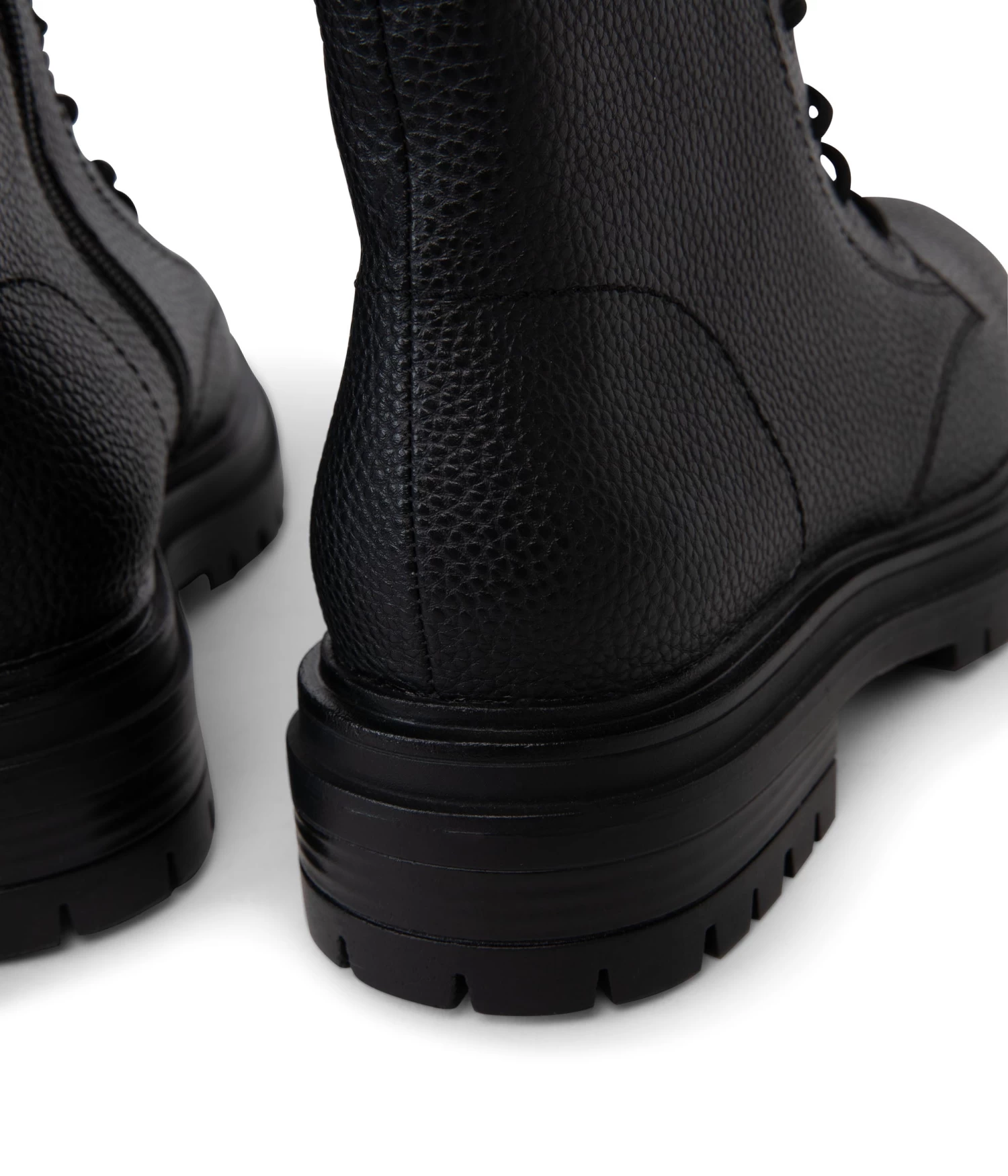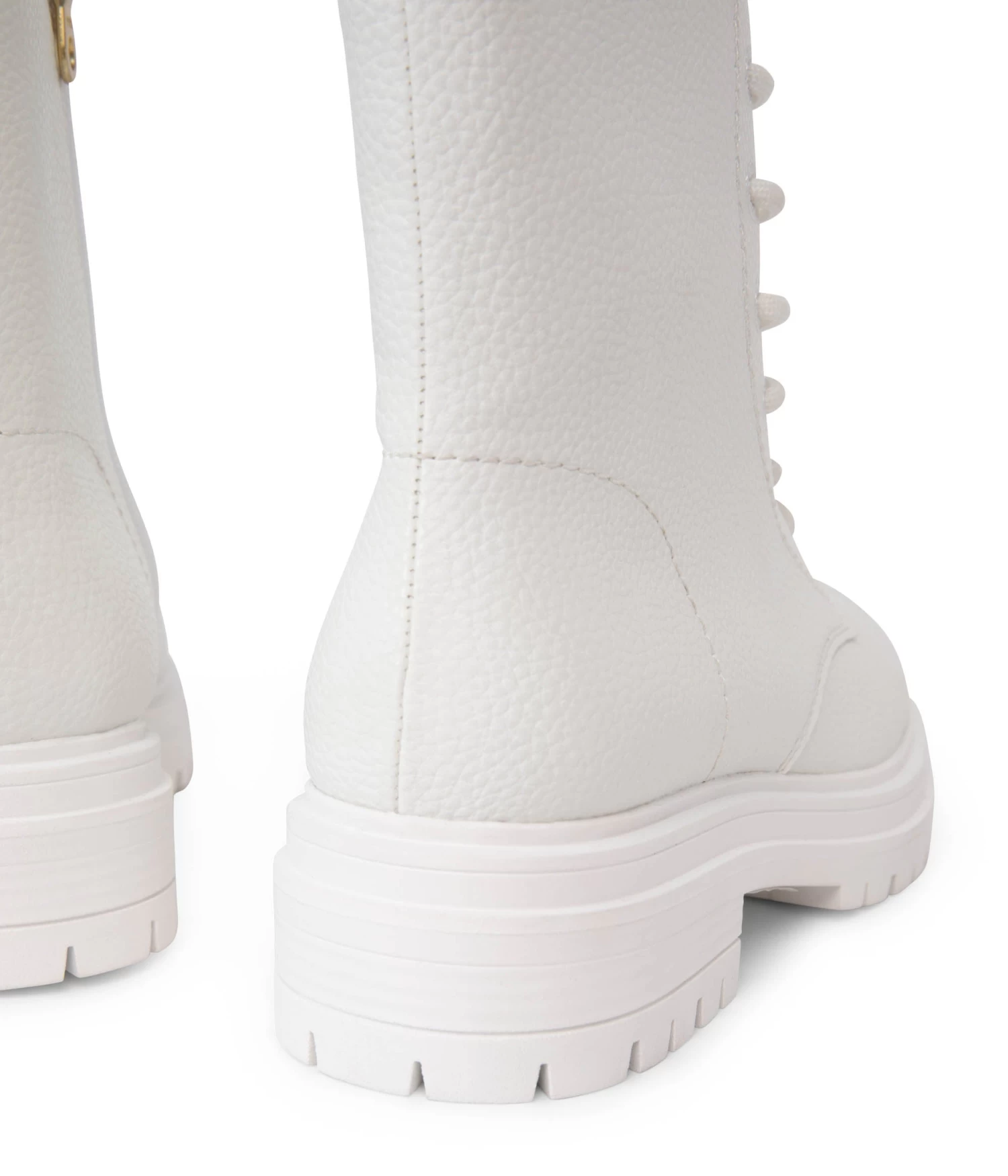 Women’s tall lace-up combat boot with YKK zipper function and chunky matching outsole.