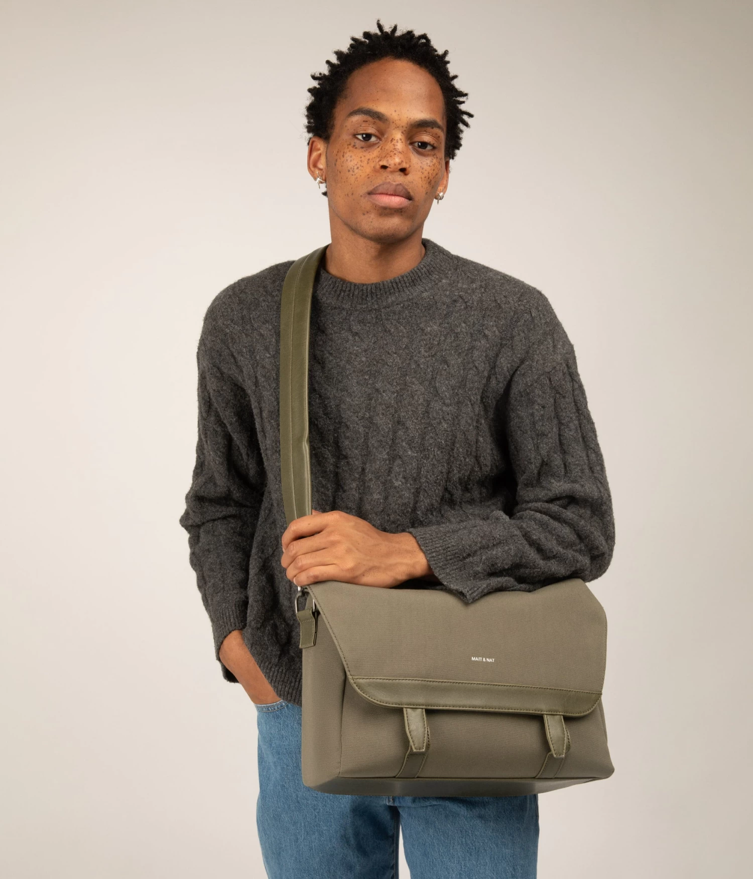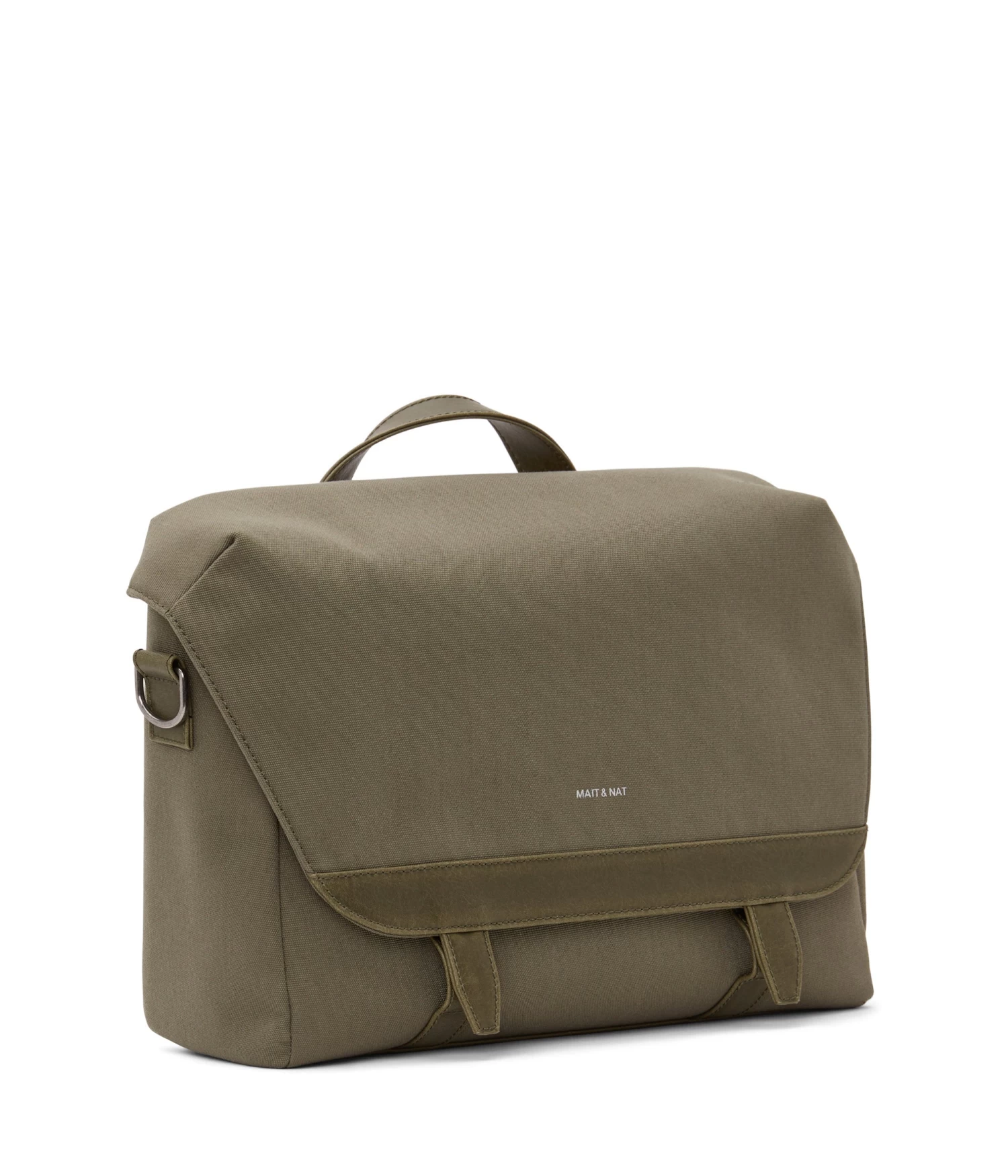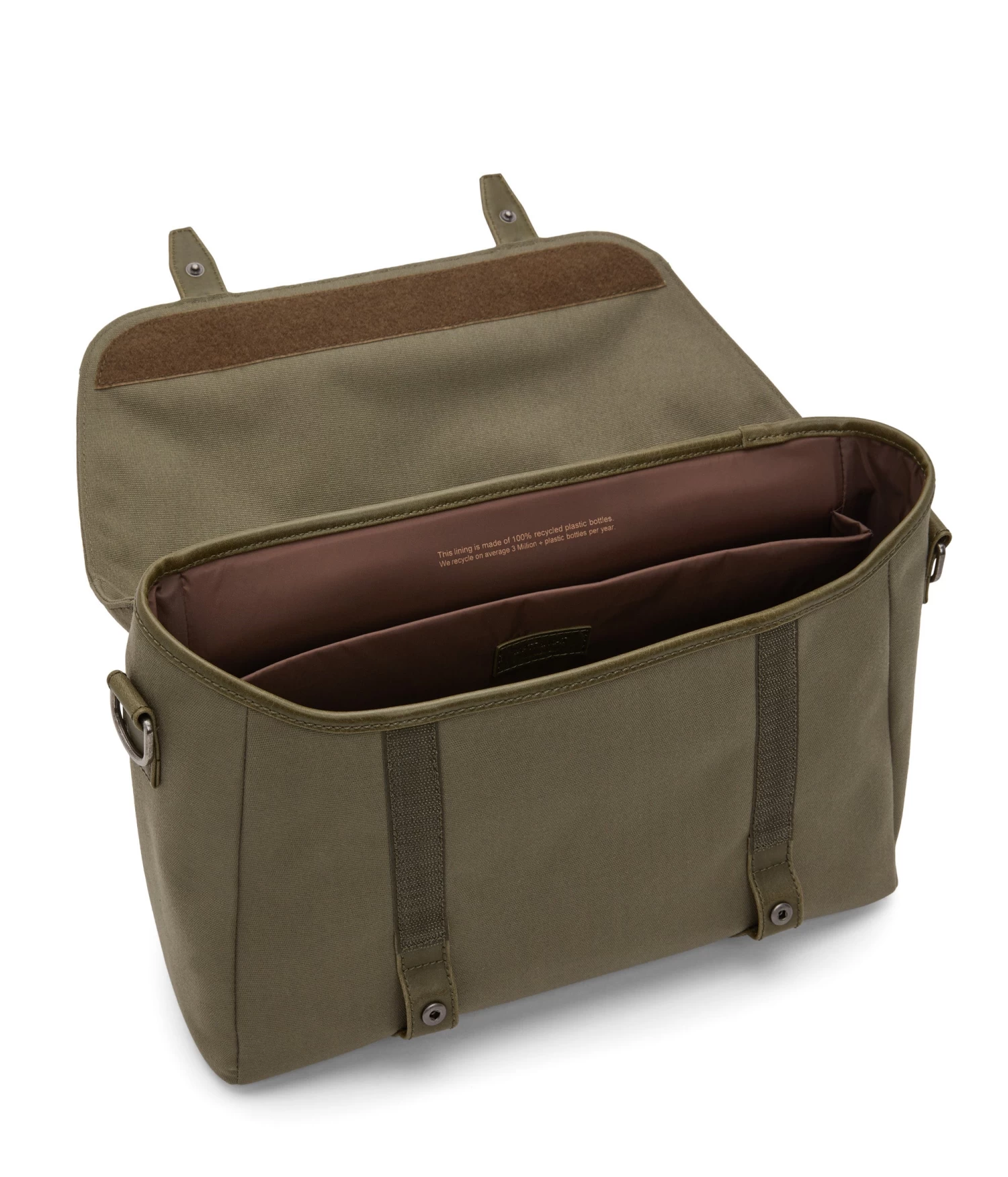 Messenger bag with adjustable shoulder strap. Front ?ap with snap and velcro closure. Fits a 13” laptop.