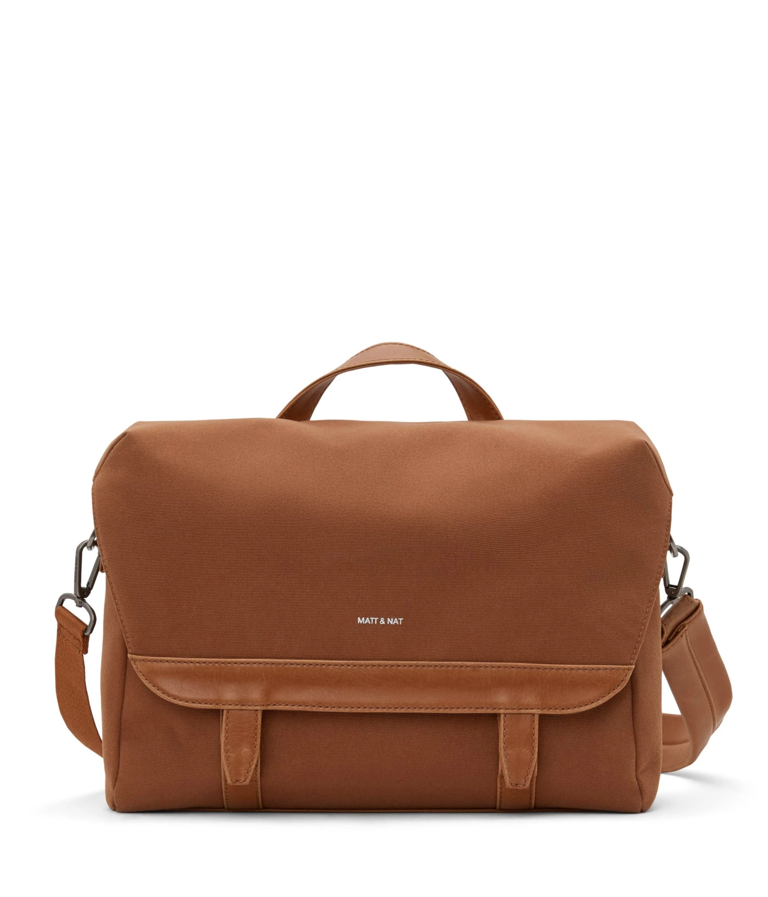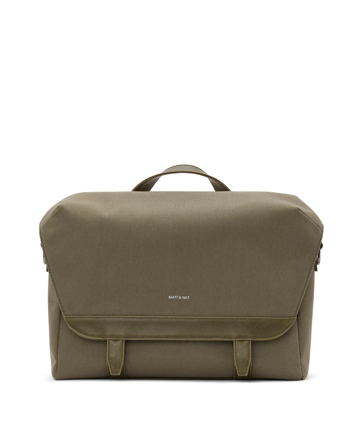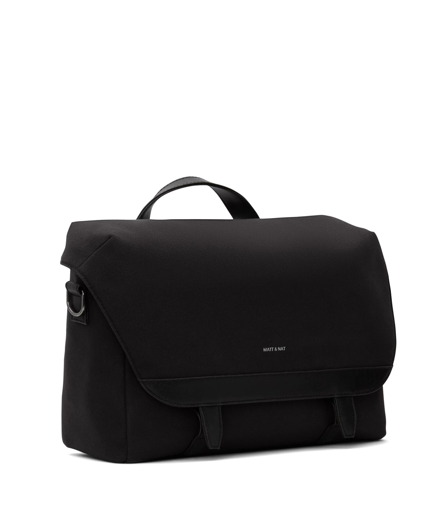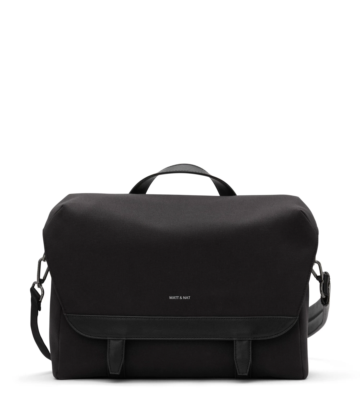 Messenger bag with adjustable shoulder strap. Front ?ap with snap and velcro closure. Fits a 13” laptop.