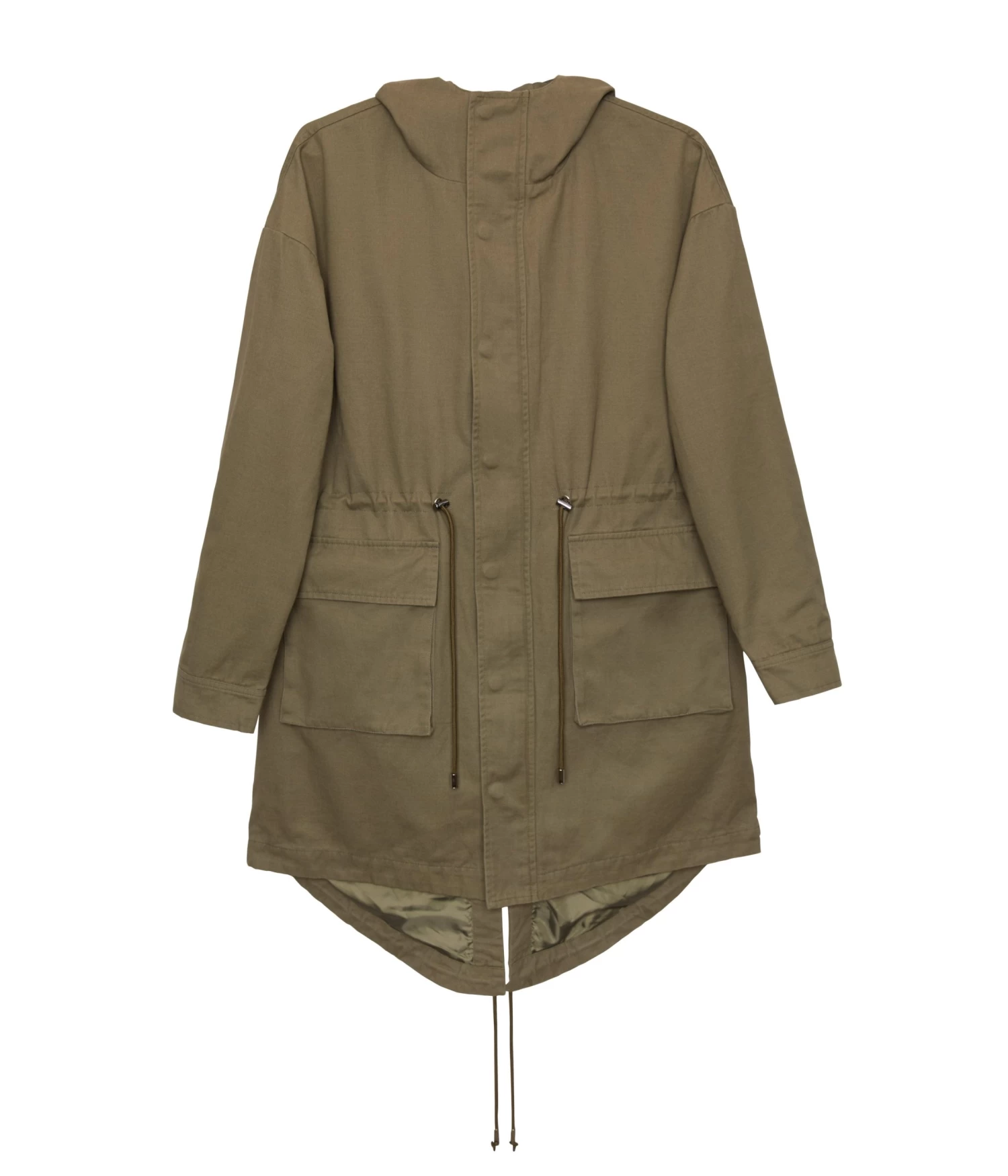 Long sleeve utility jacket with drawstring waist, concealed center front zipper closure with hidden press snaps, large patch pockets with flap, cuff tabs with hidden press snaps, oversized hood, and center back slit with drawstring detail.
