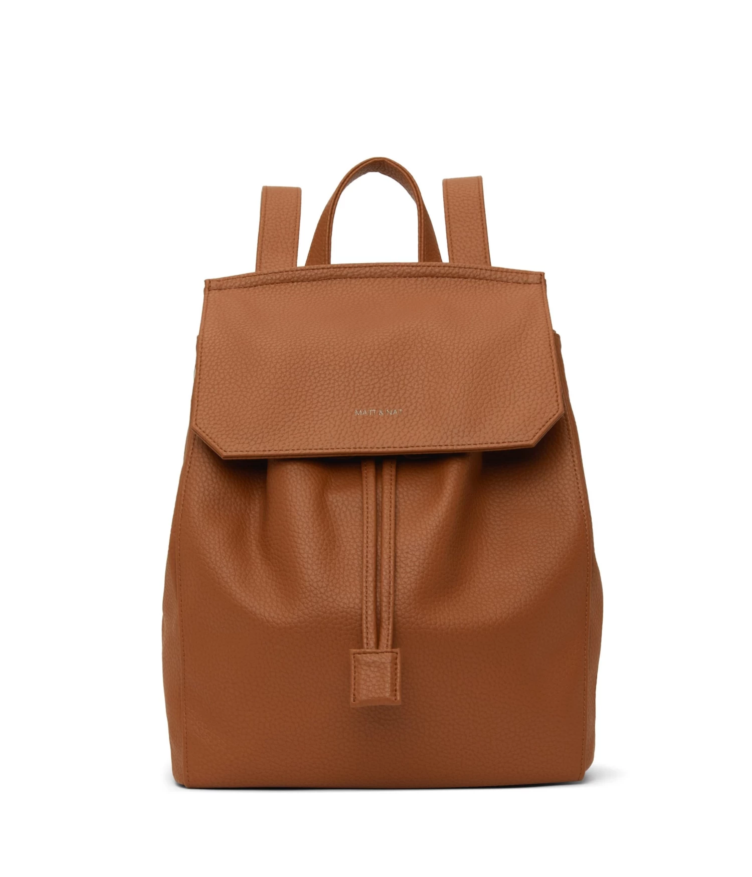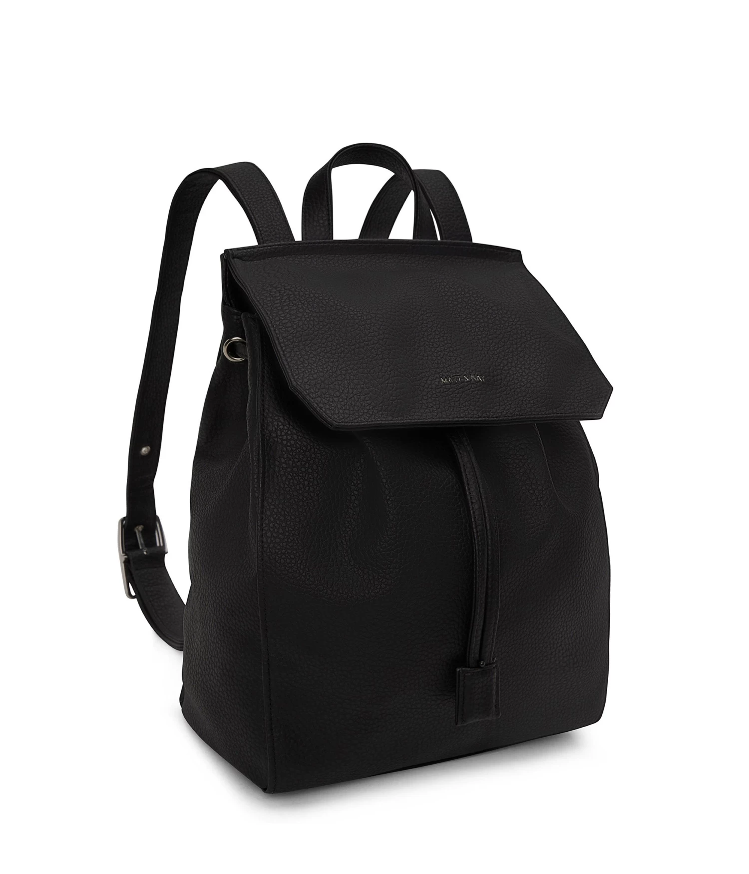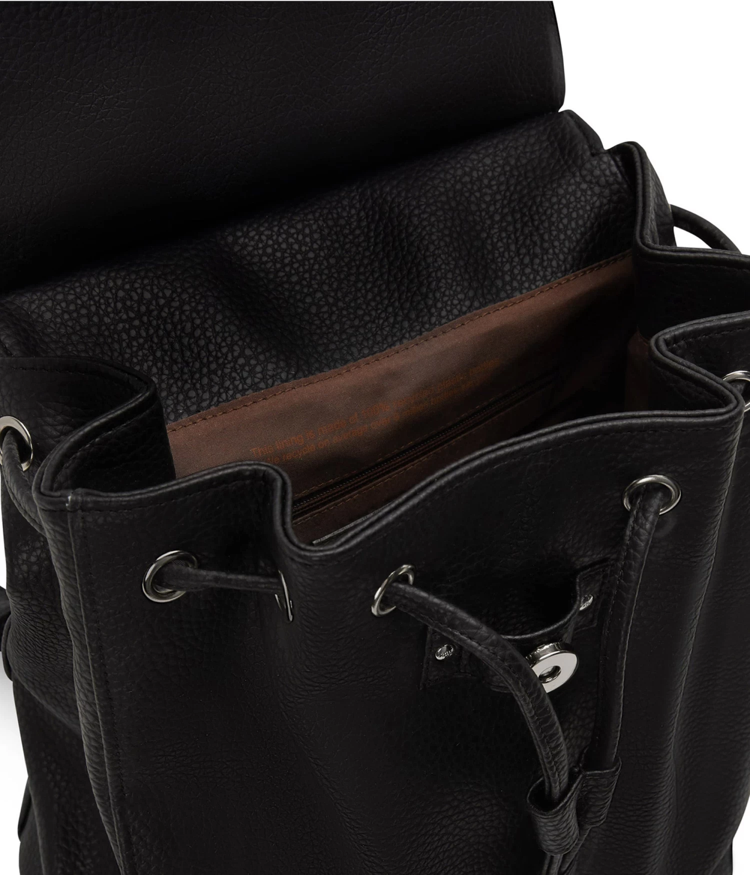 Backpack with adjustable straps, drawstring closure with a hidden tab under the flap to secure drawstrings.