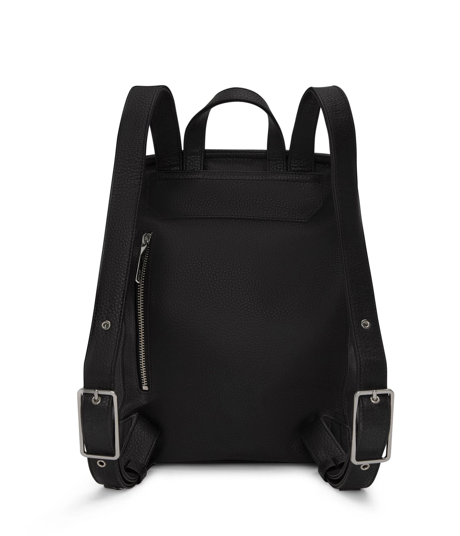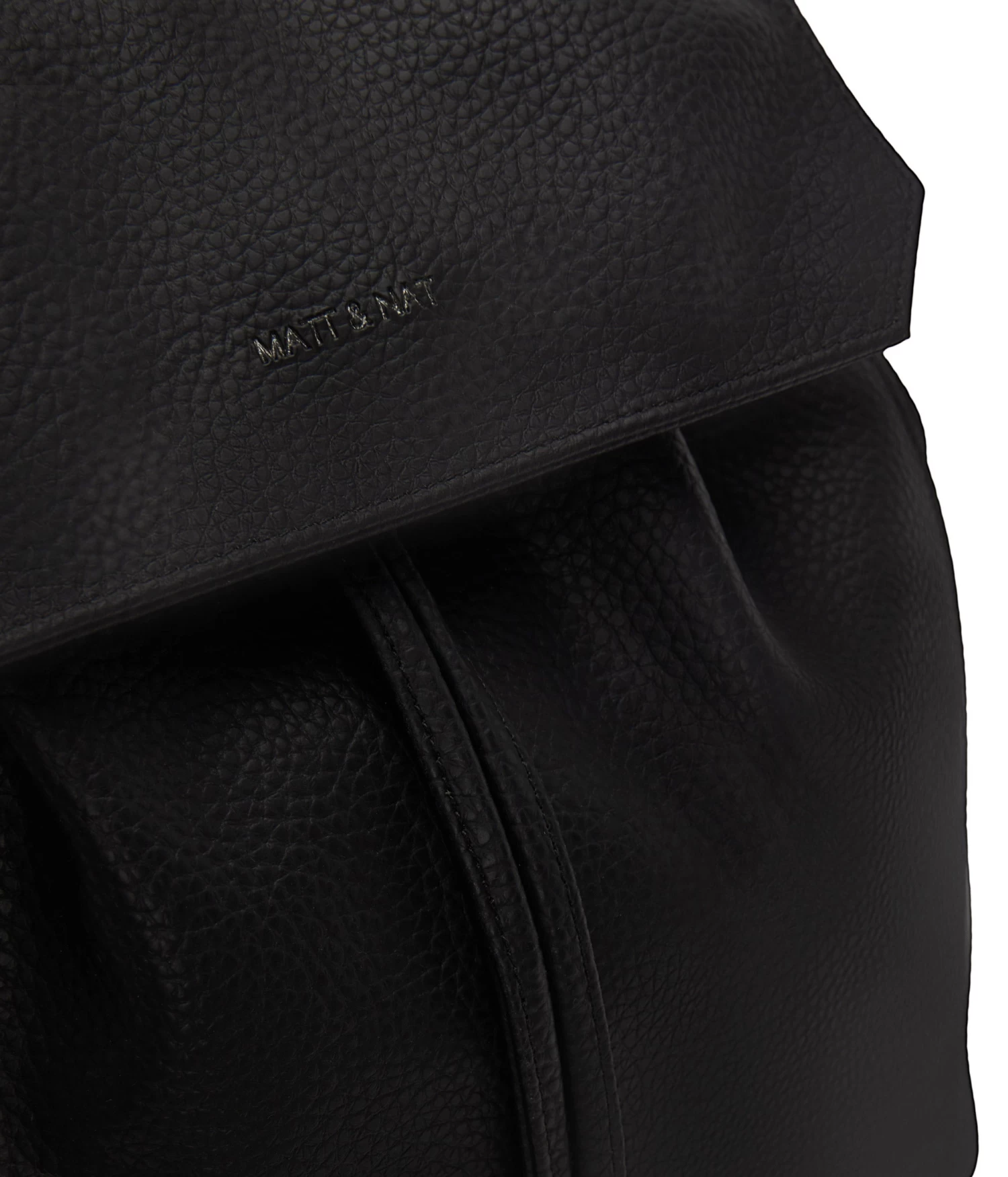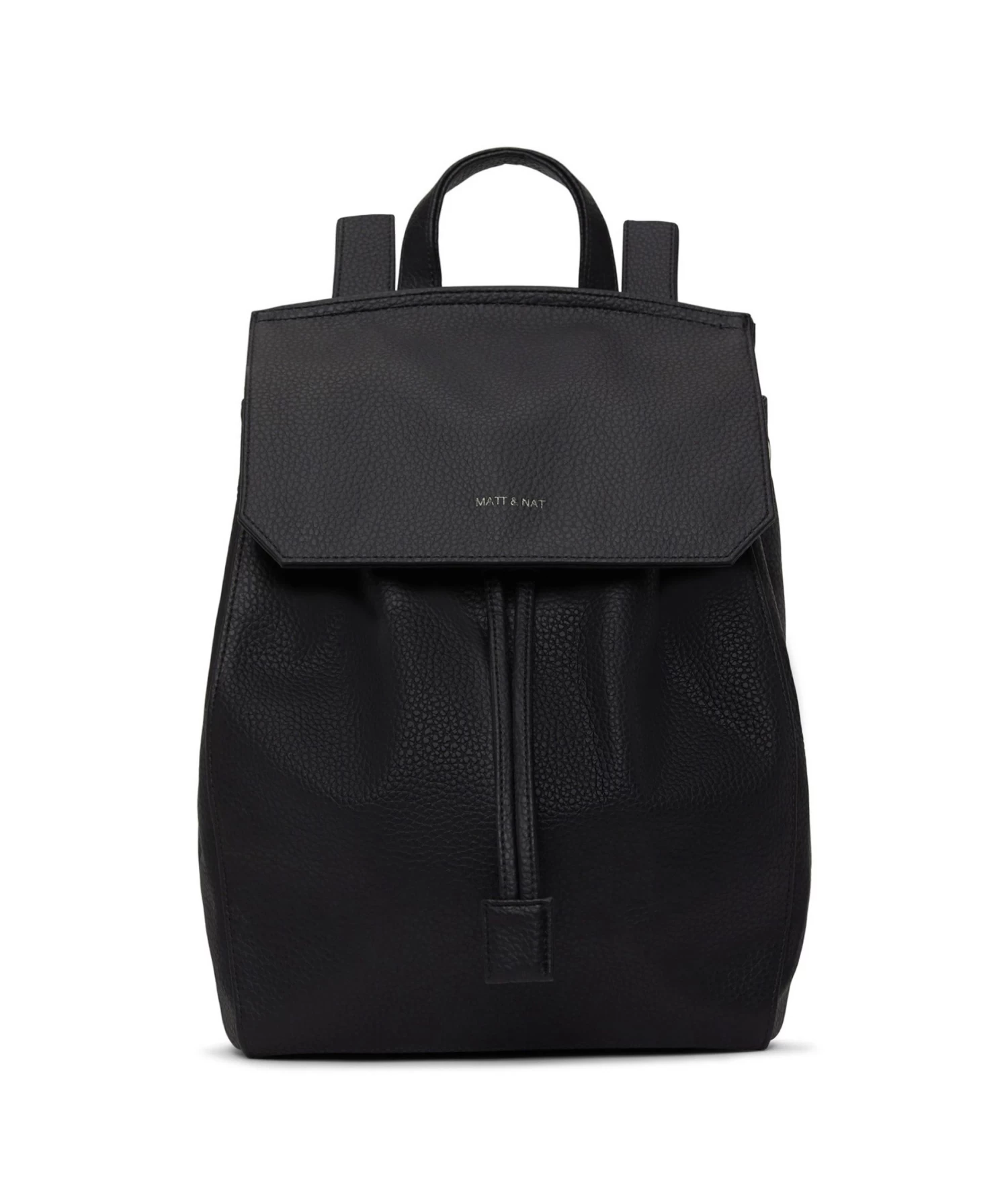 Backpack with adjustable straps, drawstring closure with a hidden tab under the flap to secure drawstrings.