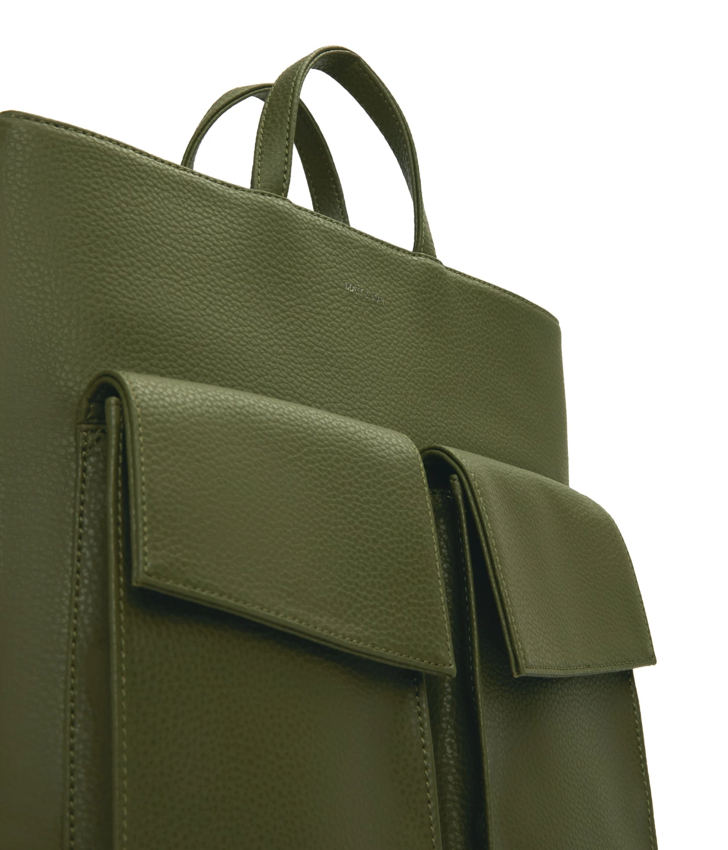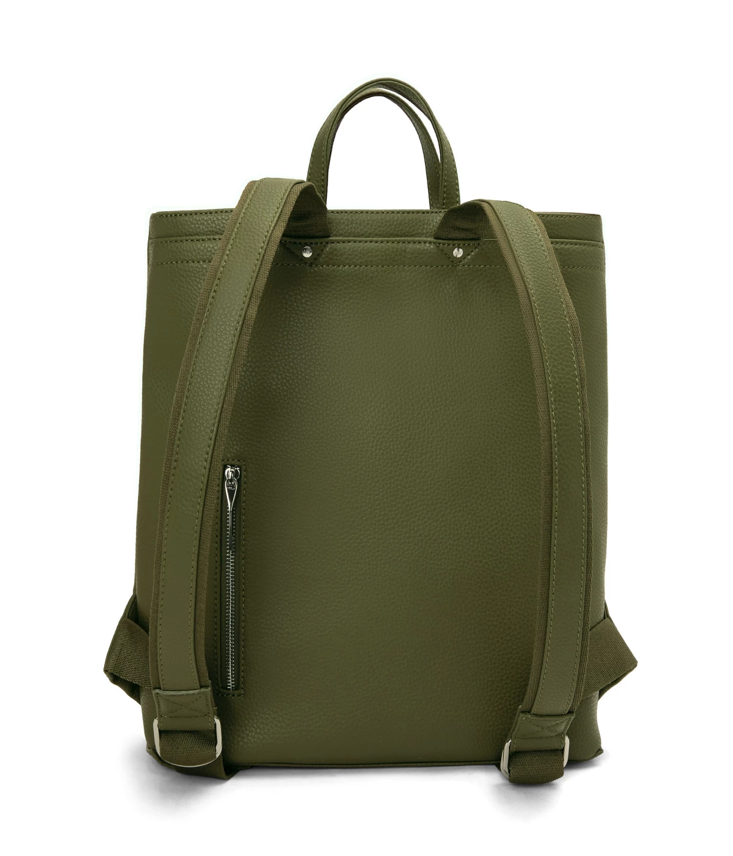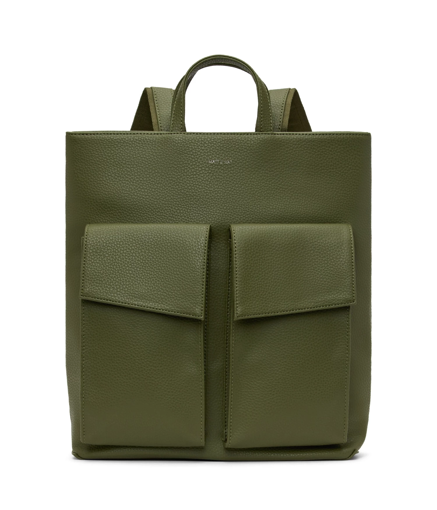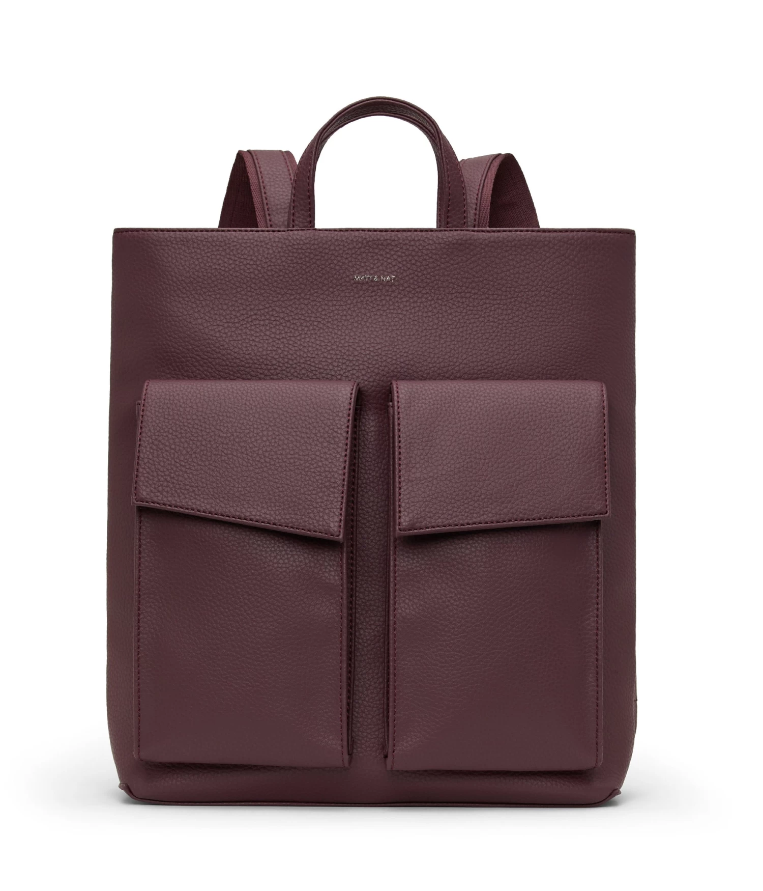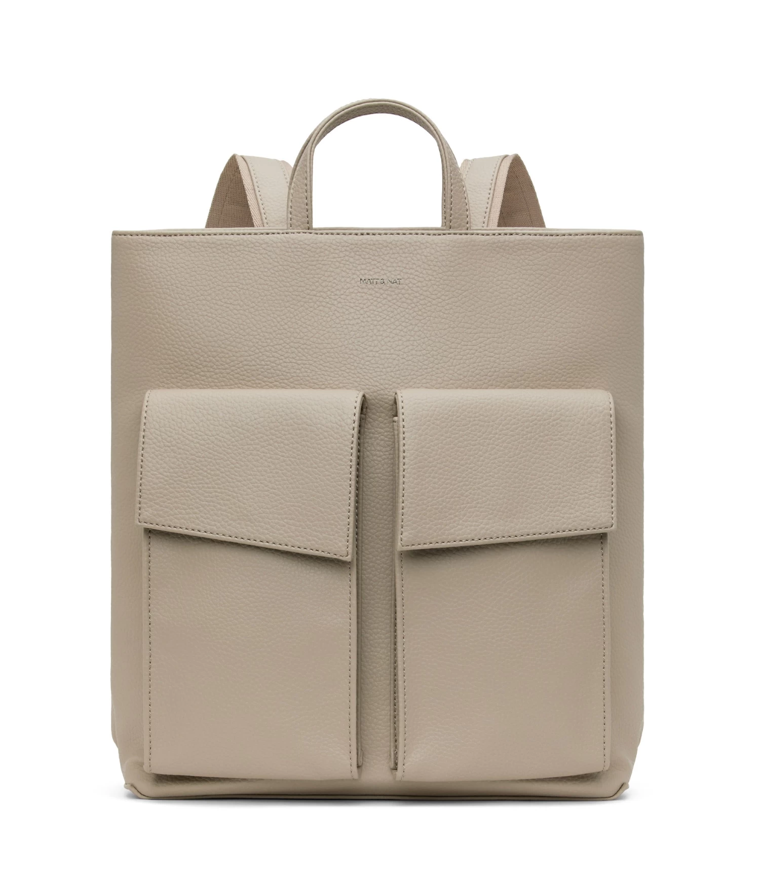 Backpack with adjustable straps, 2 handles to hand-carry, main compartment with top zipper closure, 2 large front pockets with asymmetric flap, and exterior back zipper pocket. Fits a 13” laptop.