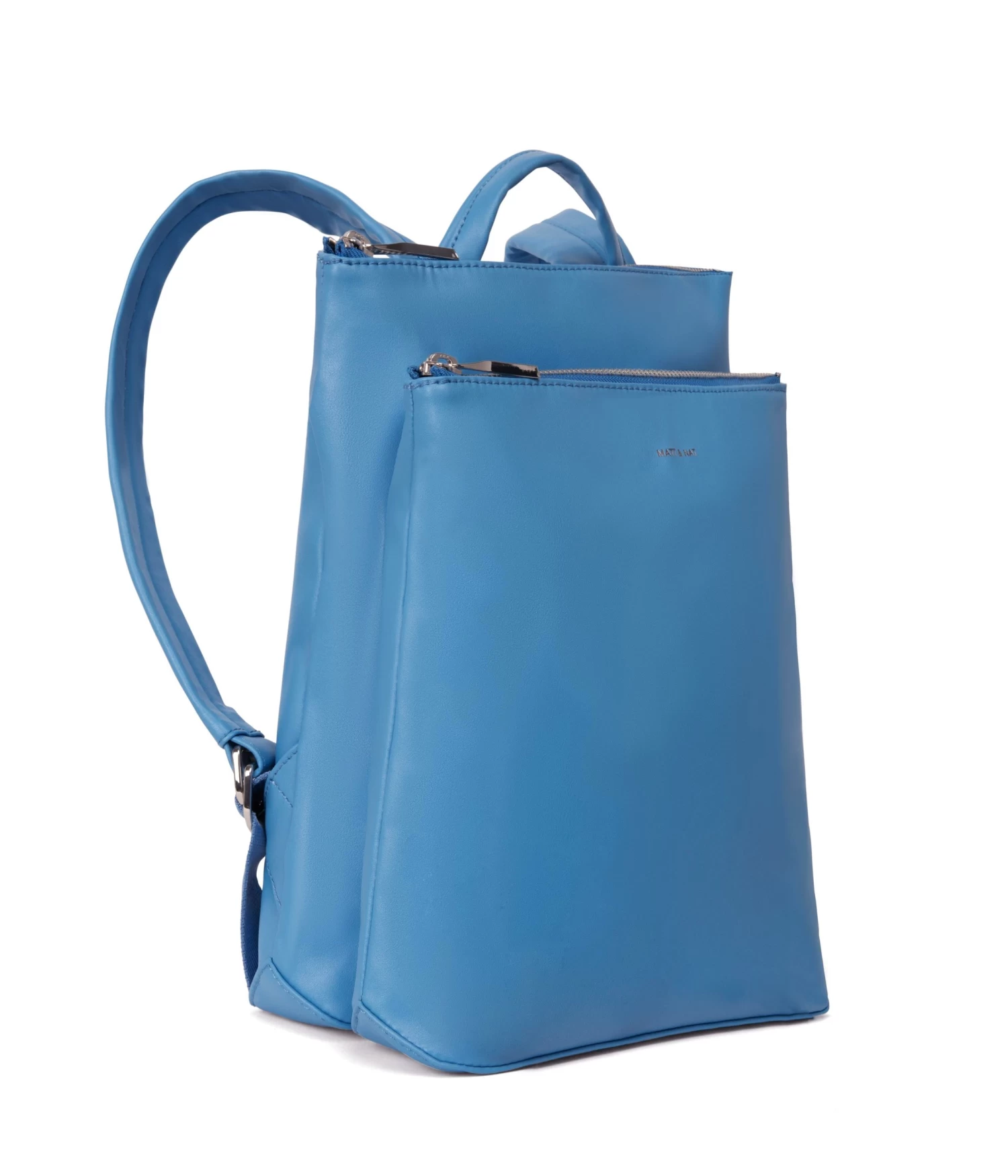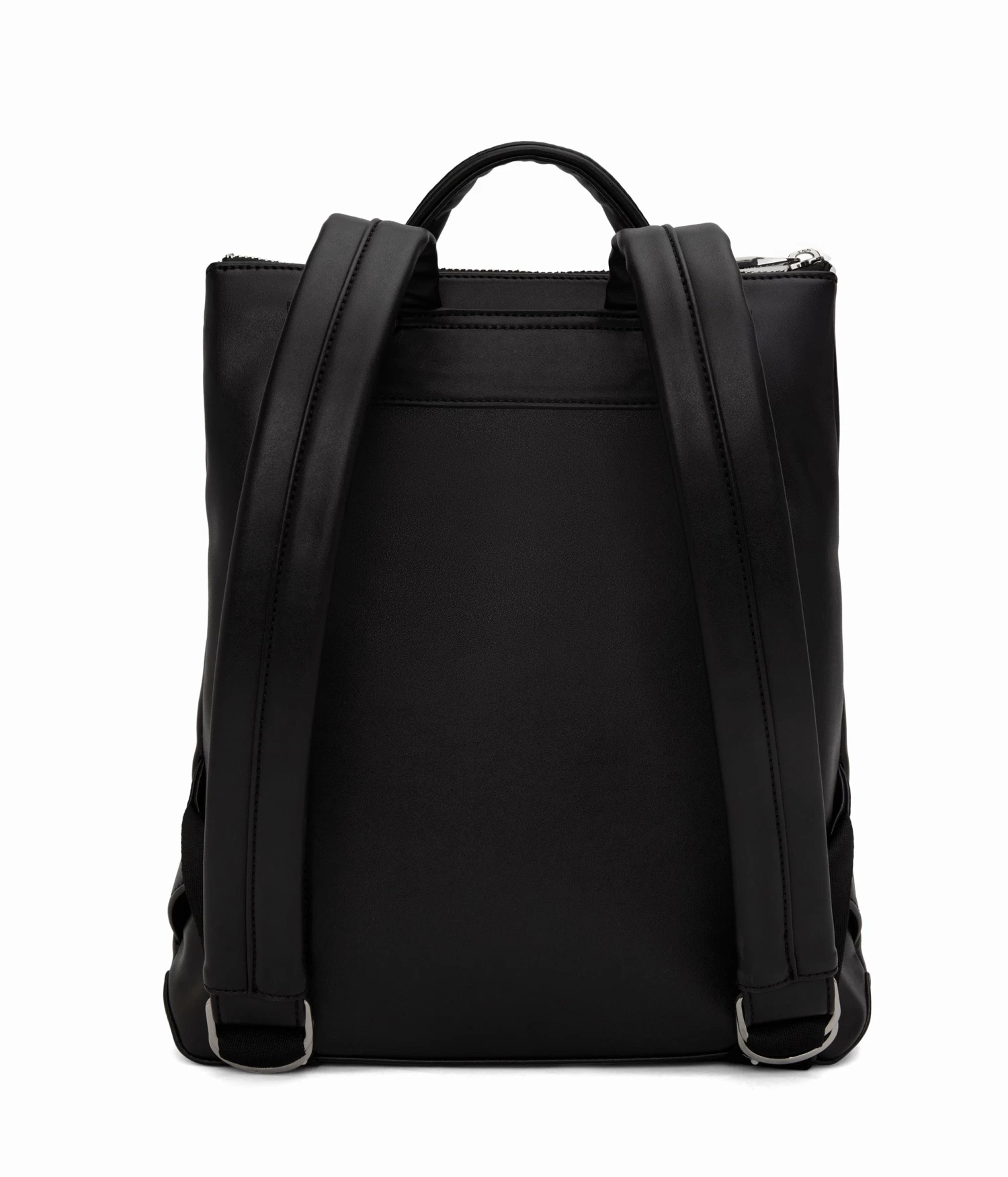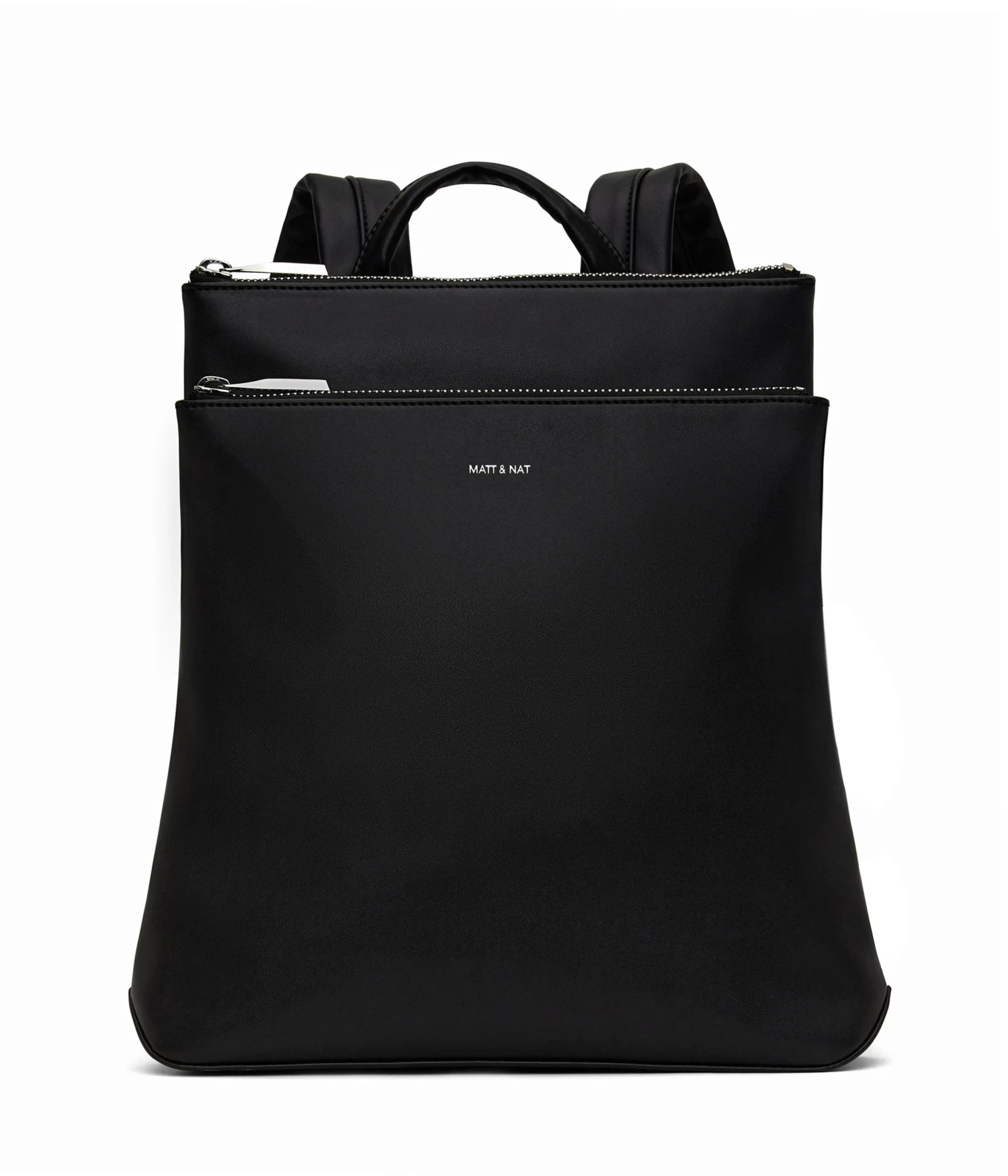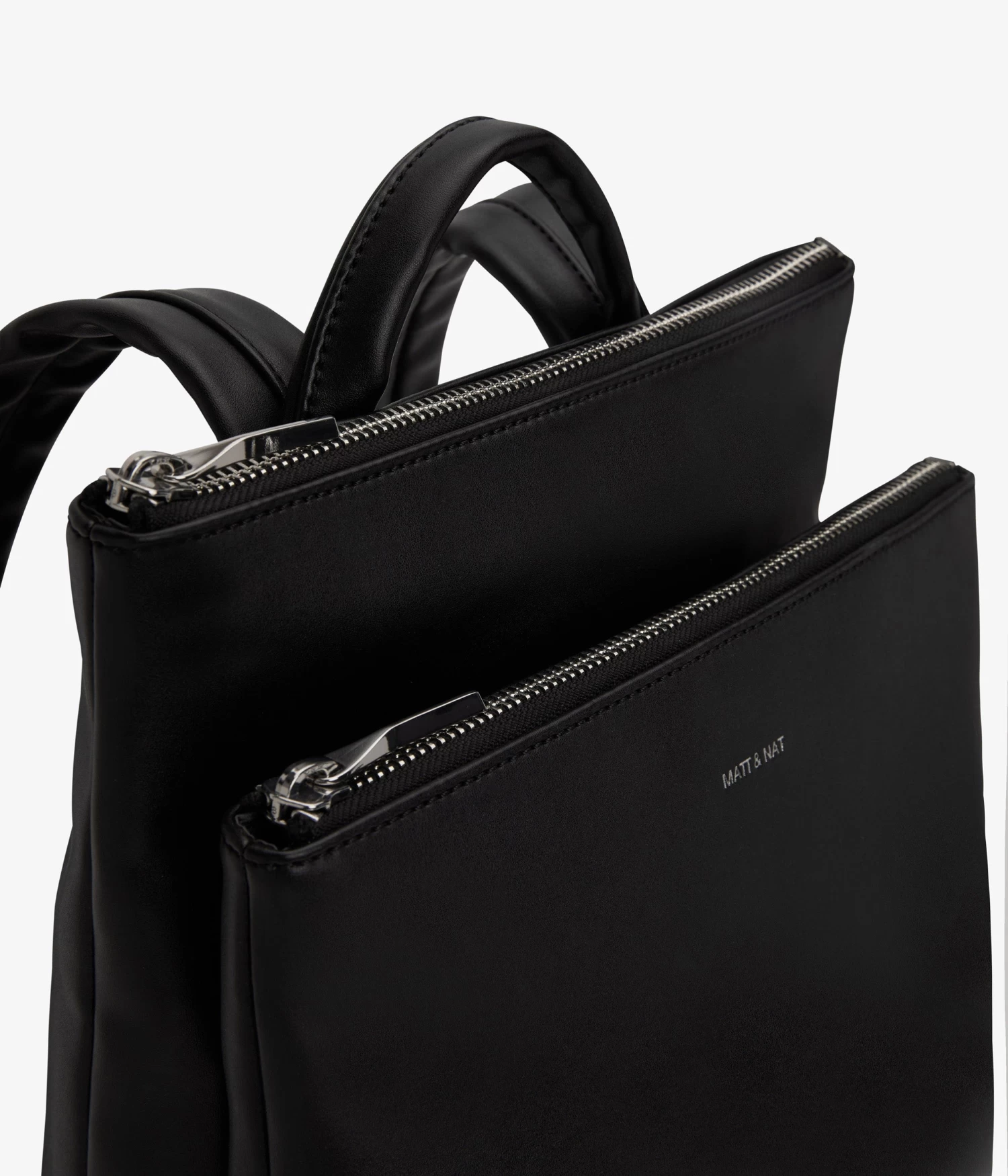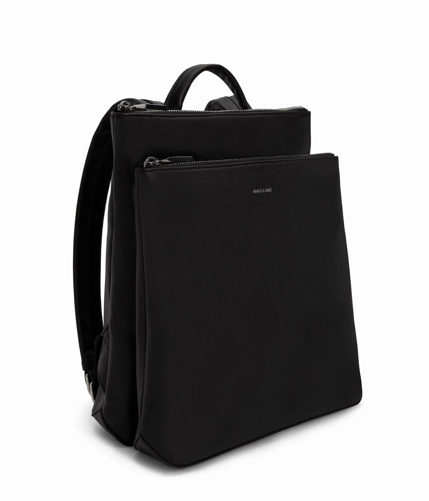 Backpack with adjustable padded straps, top handle to hand-carry, and 2 zippered compartments.