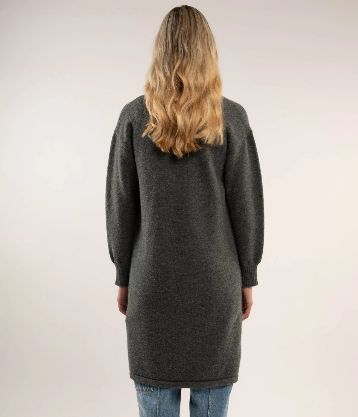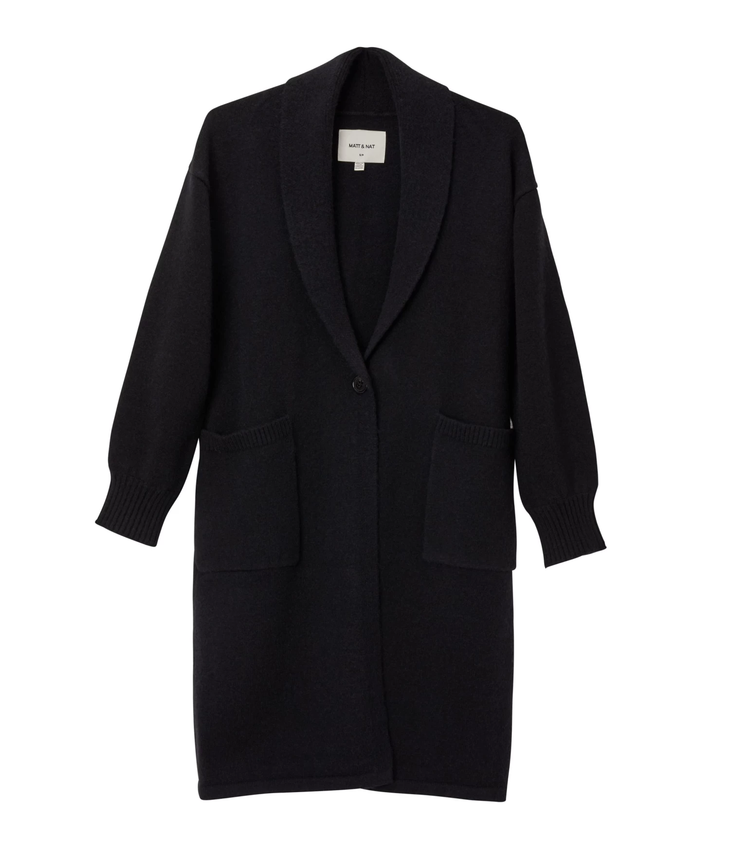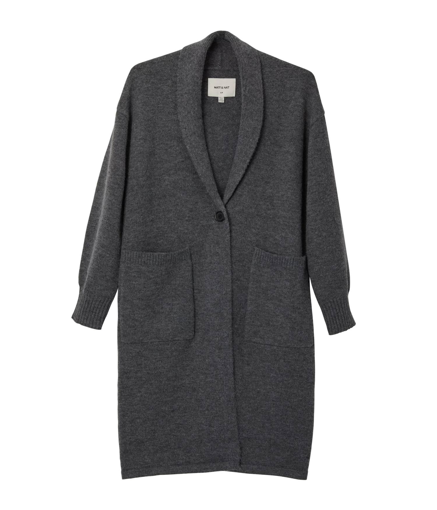 Long sleeve knee-length cardigan with single-button closure, shawl collar, large patch pockets, and rib finish at cuffs and pockets.