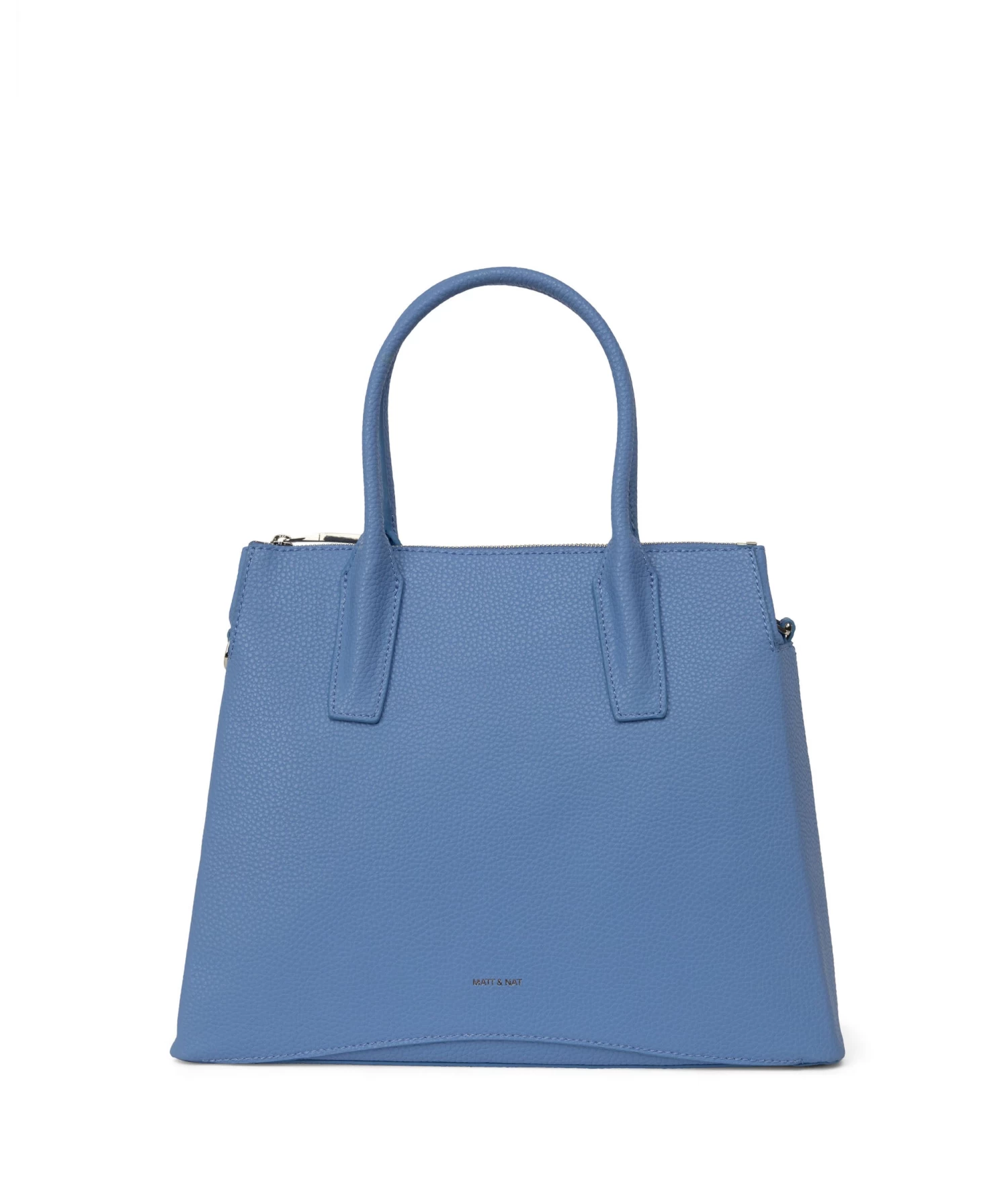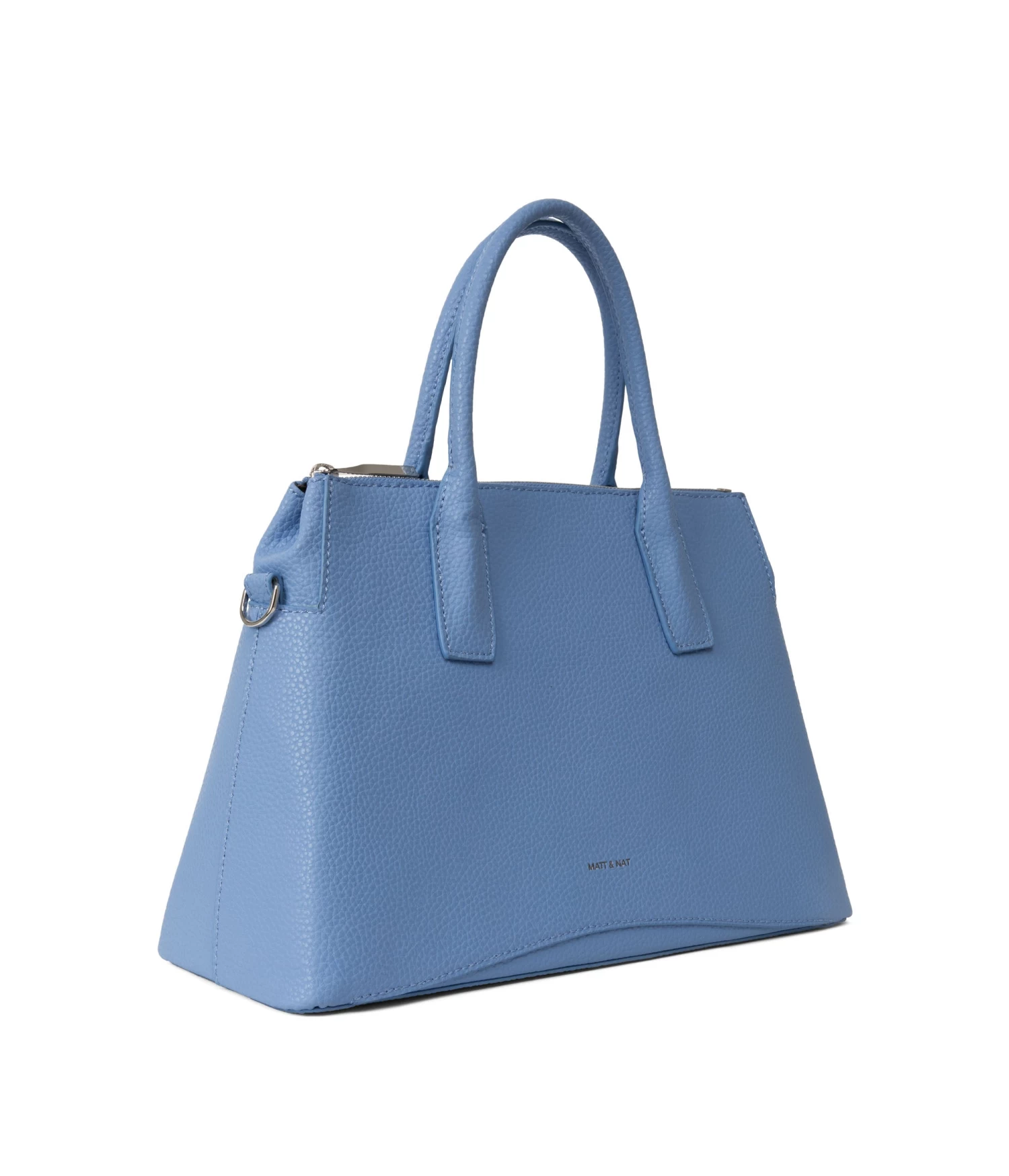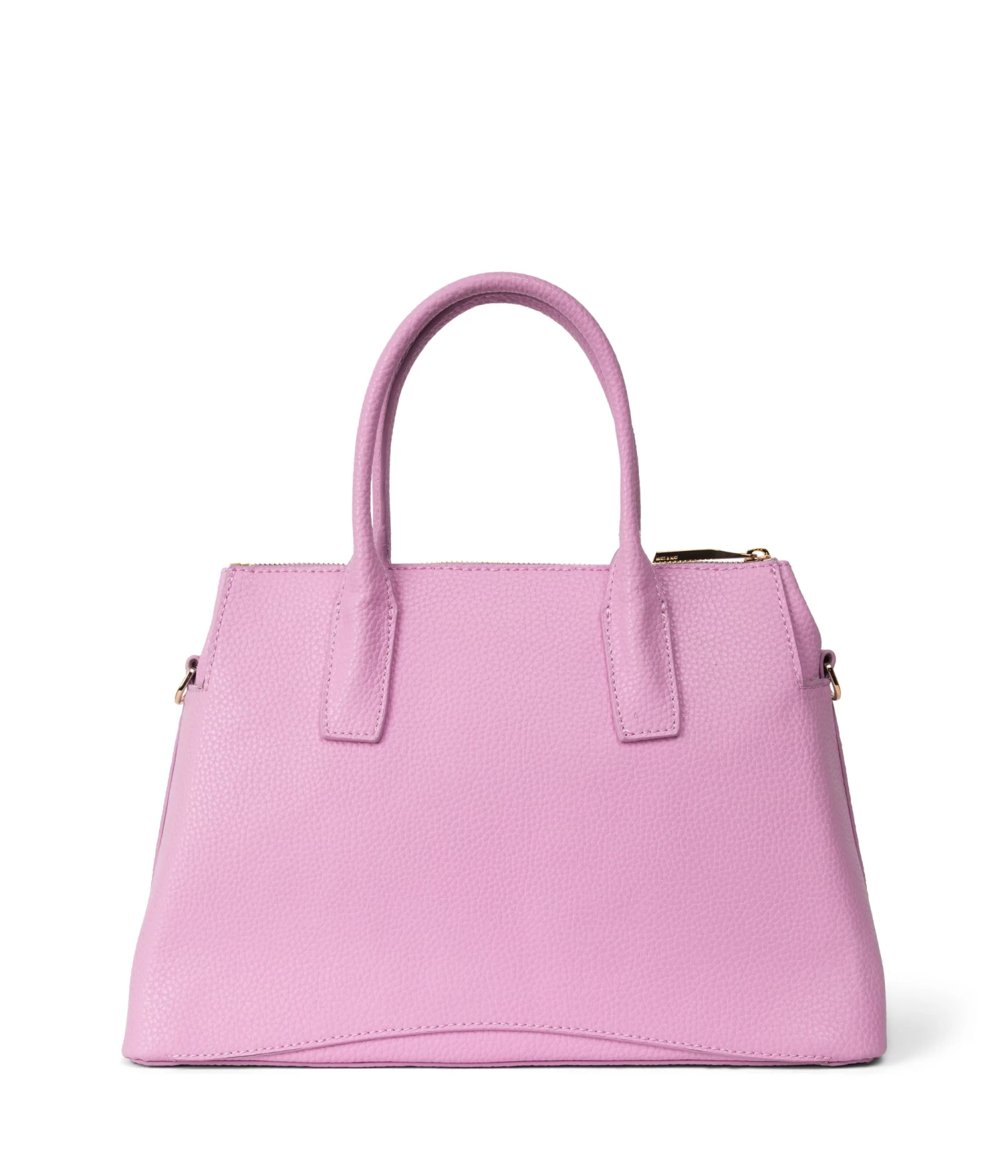 Satchel with a top zipper closure and handles to hand-carry. Comes with a detachable and adjustable crossbody strap.