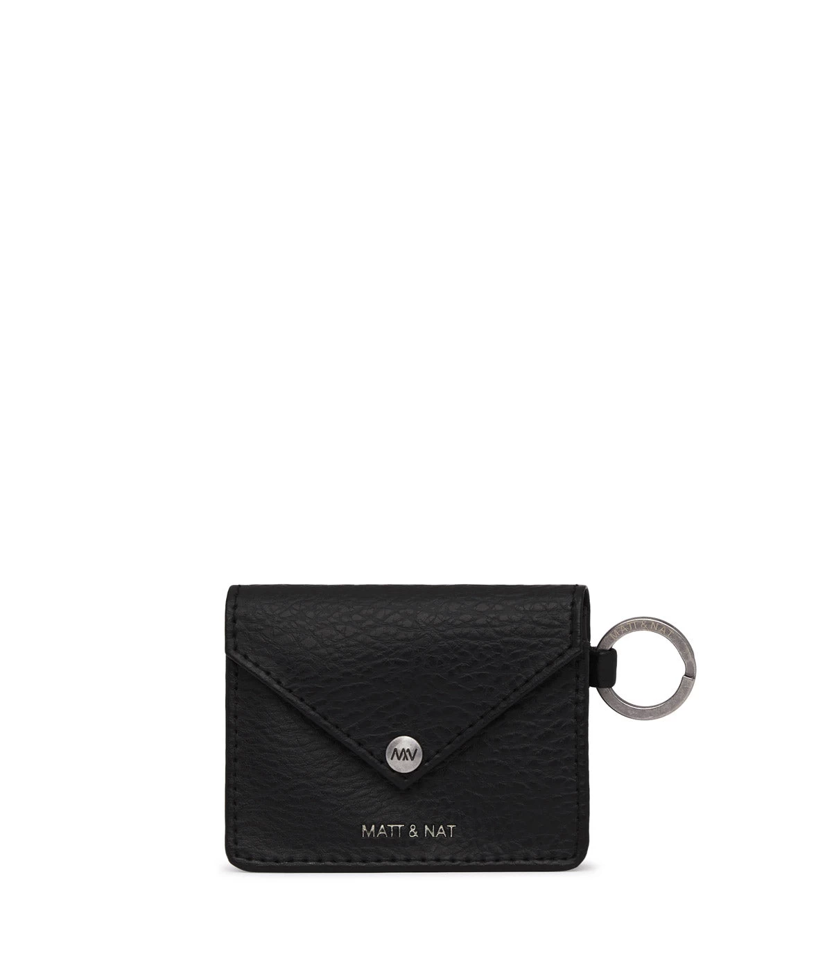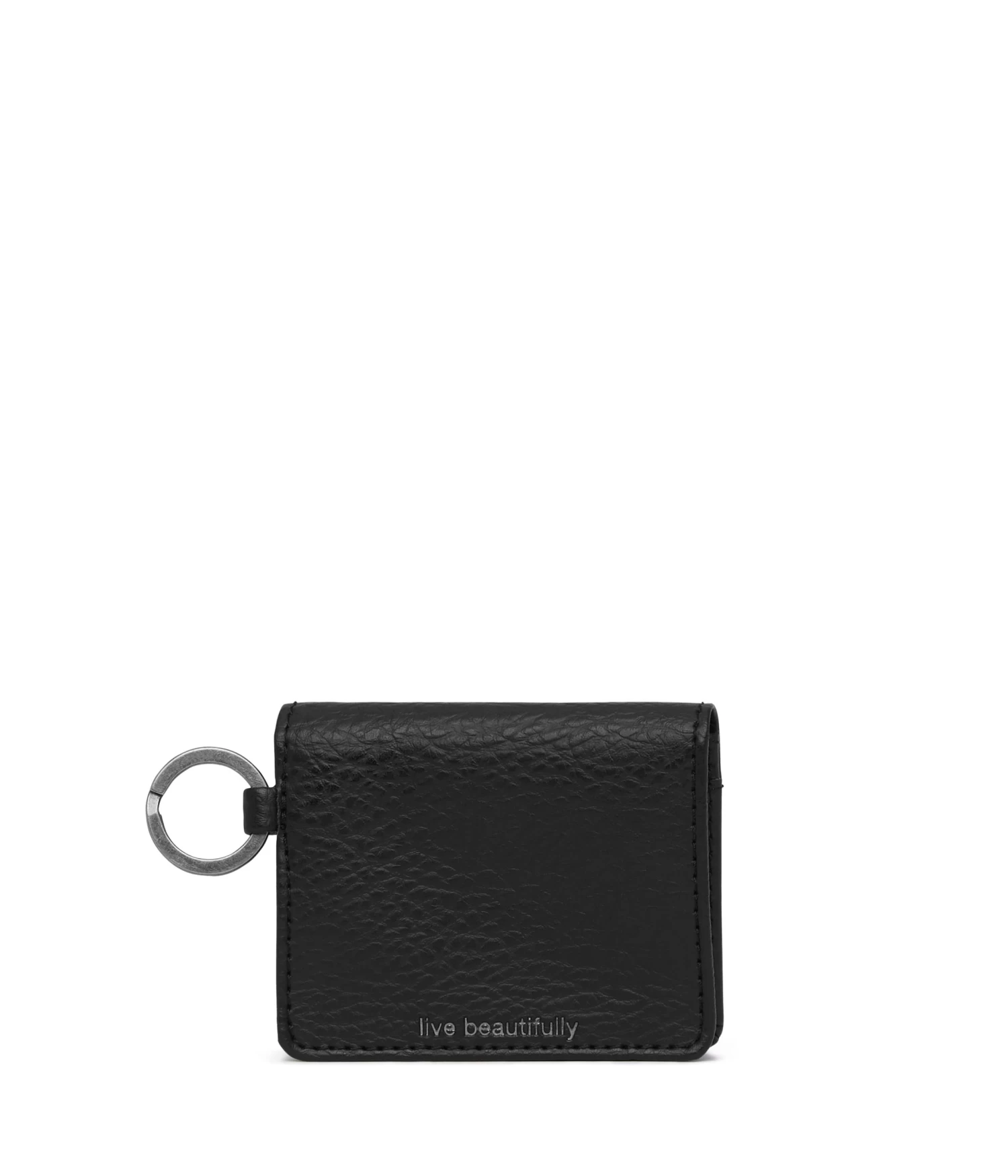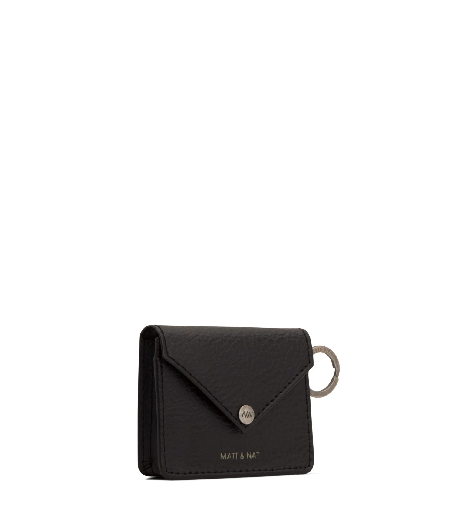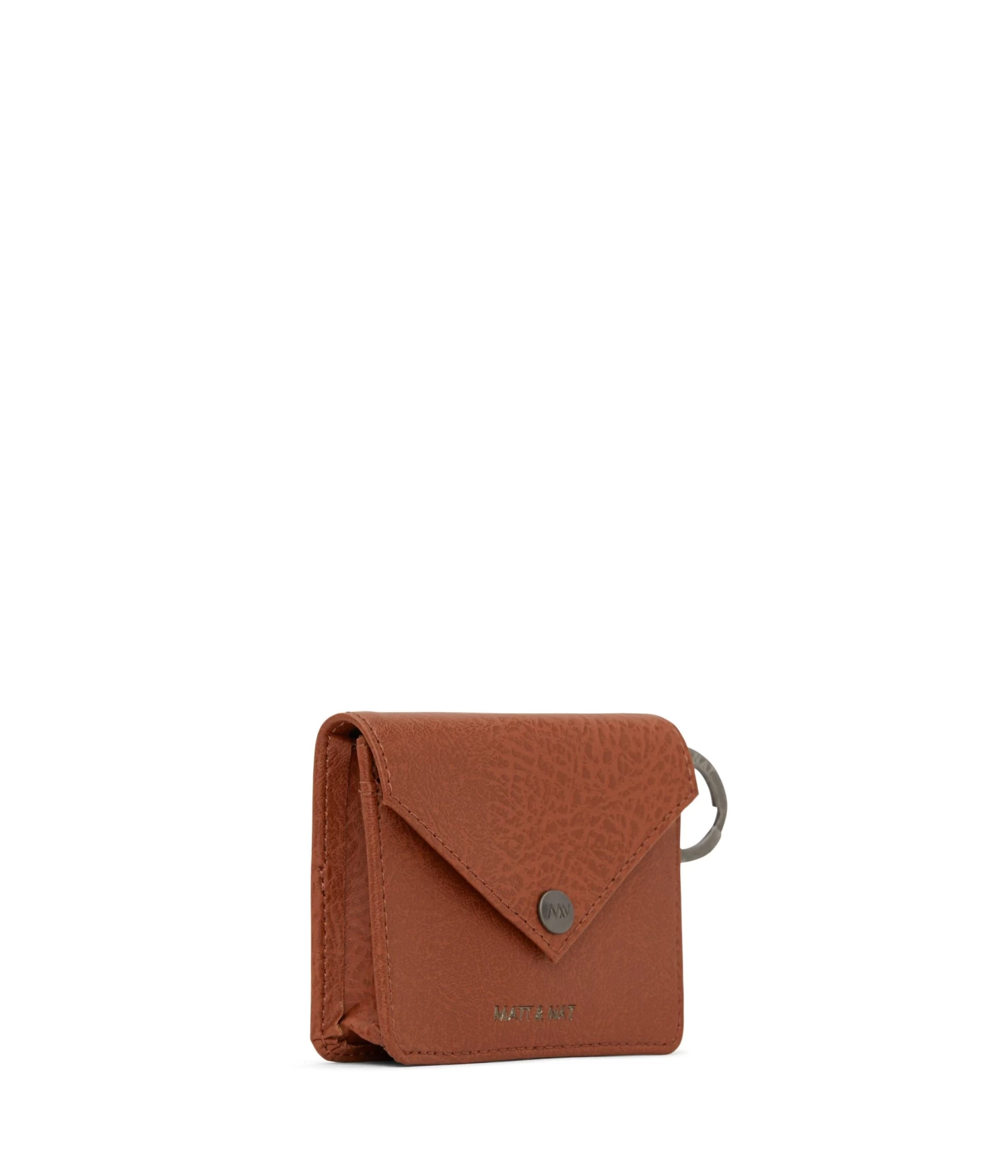 Coin purse/credit card holder with round keyring logo detail and center snap flap closure.