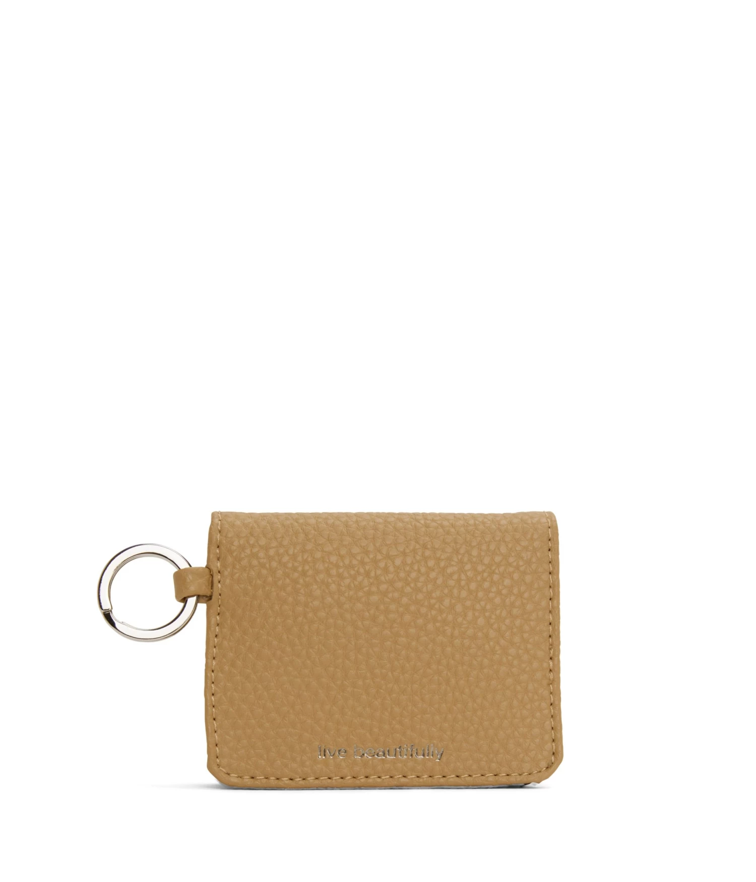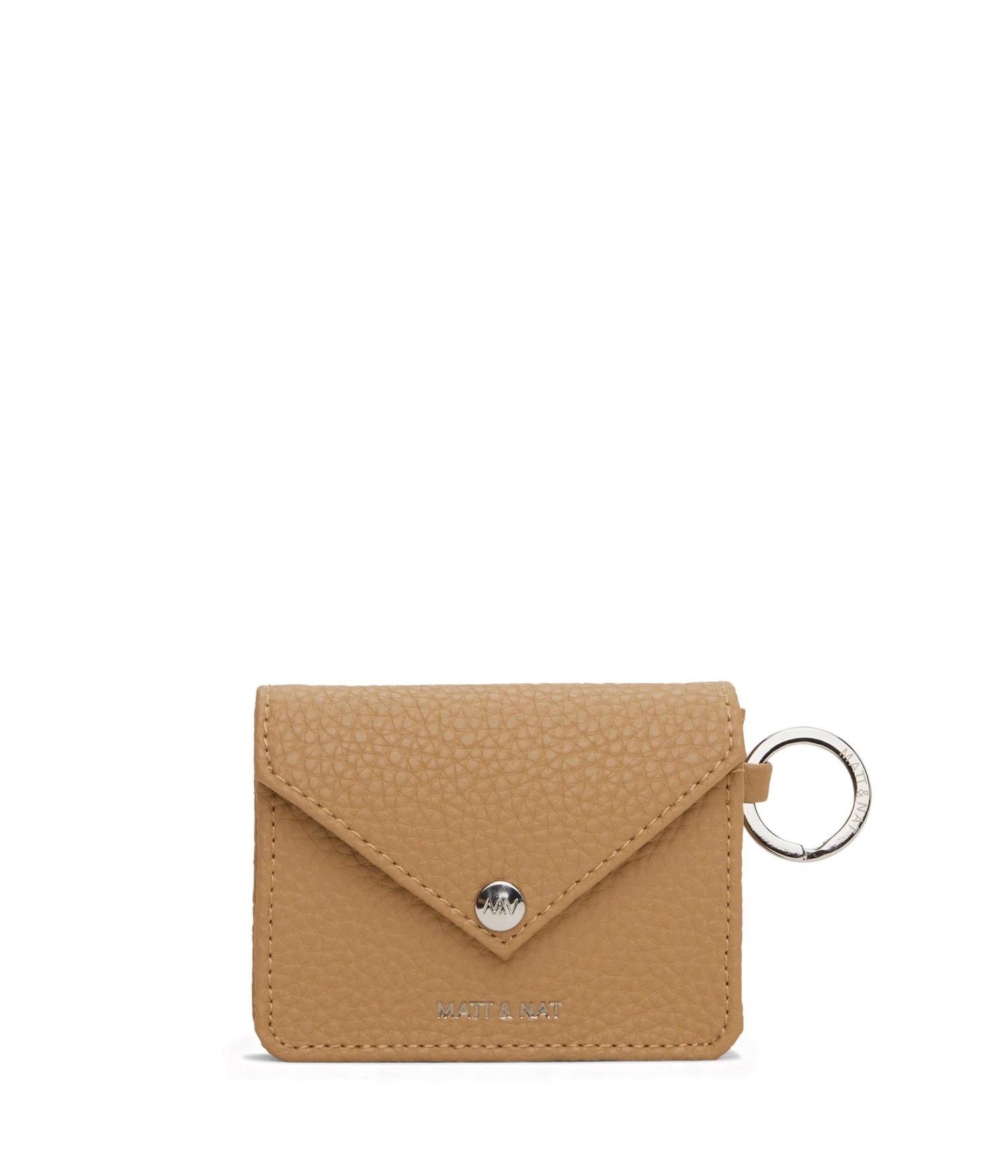 Coin purse/credit card holder with round keyring logo detail and center snap flap closure.