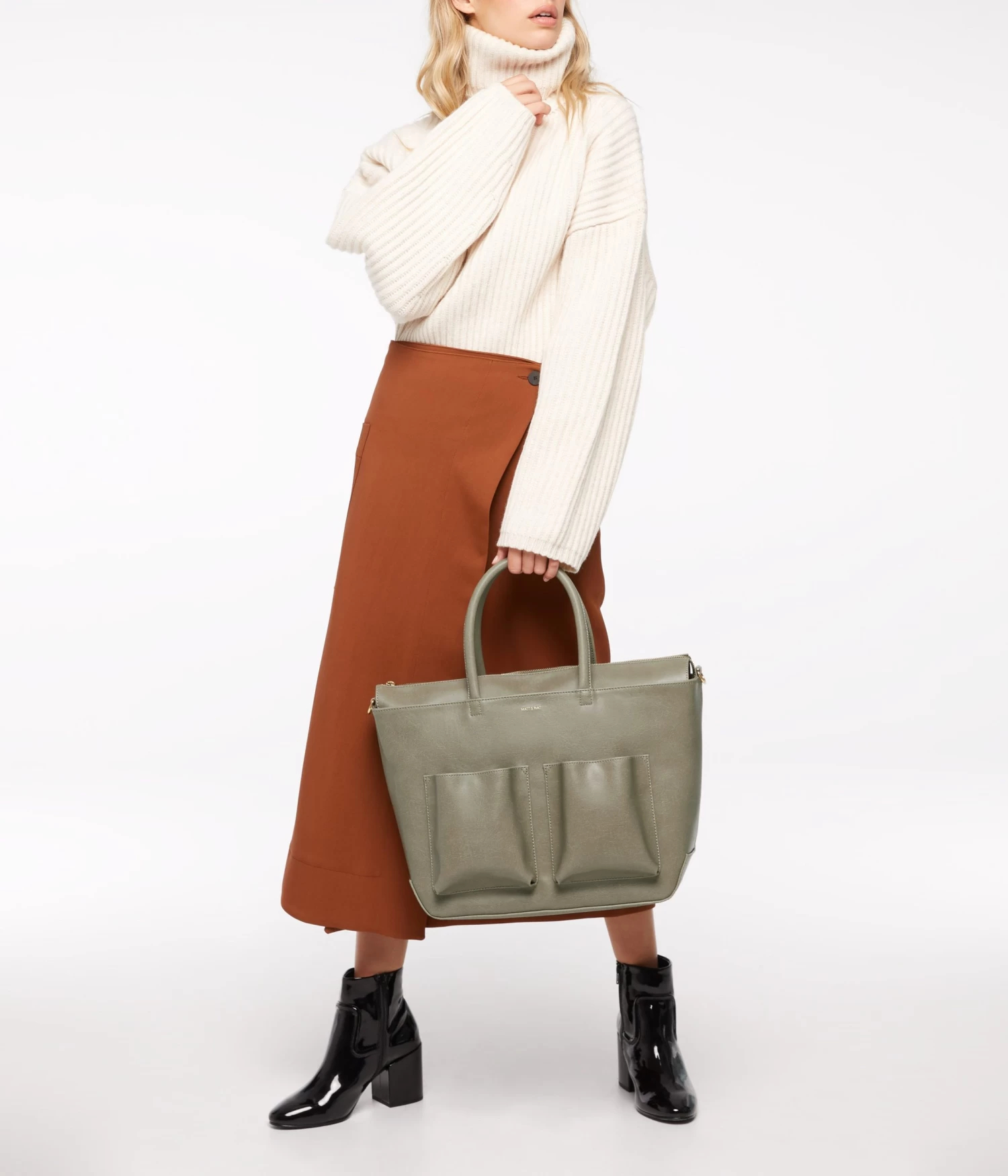 Diaper bag with adjustable and removable strap. Two front patch pockets with magnetic snap closure.