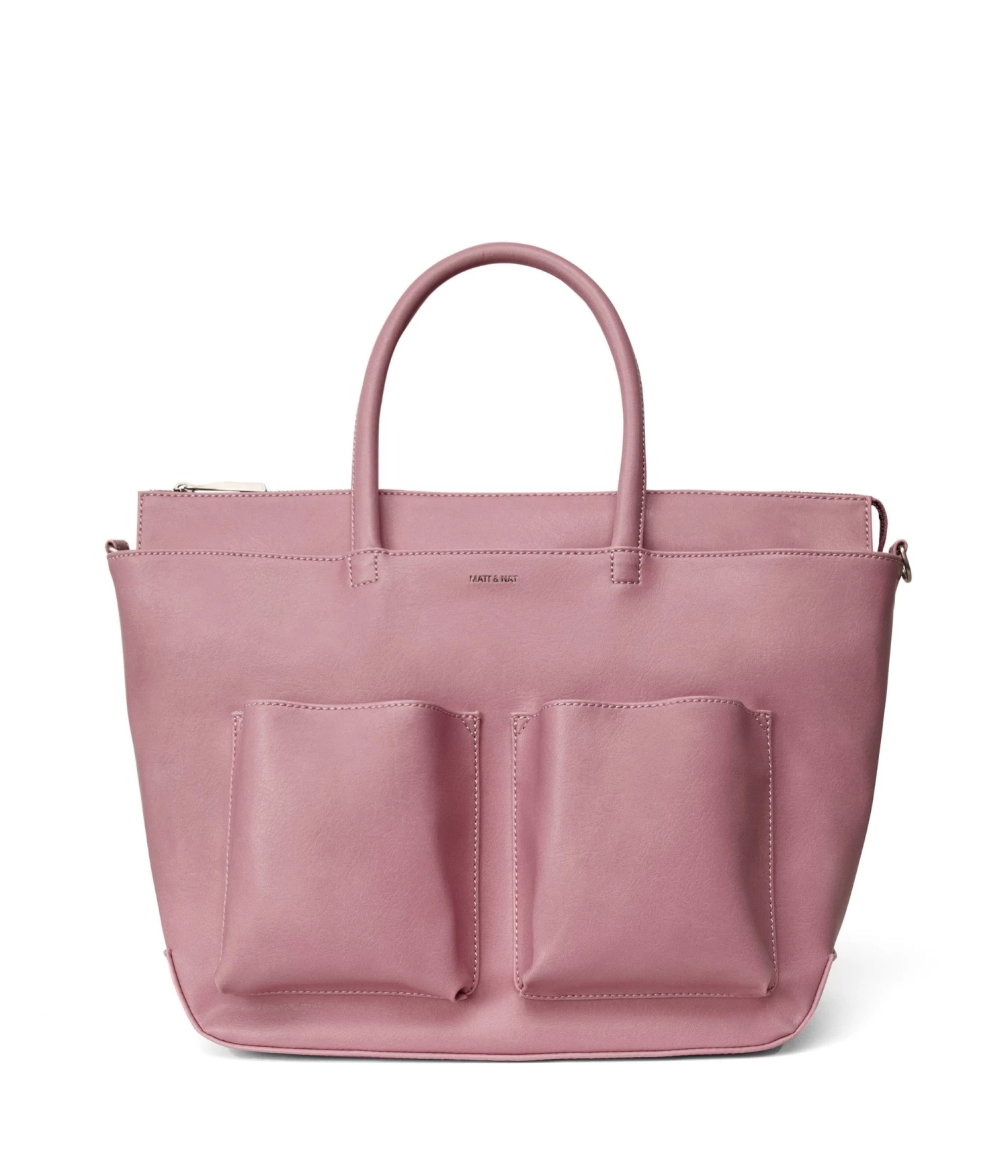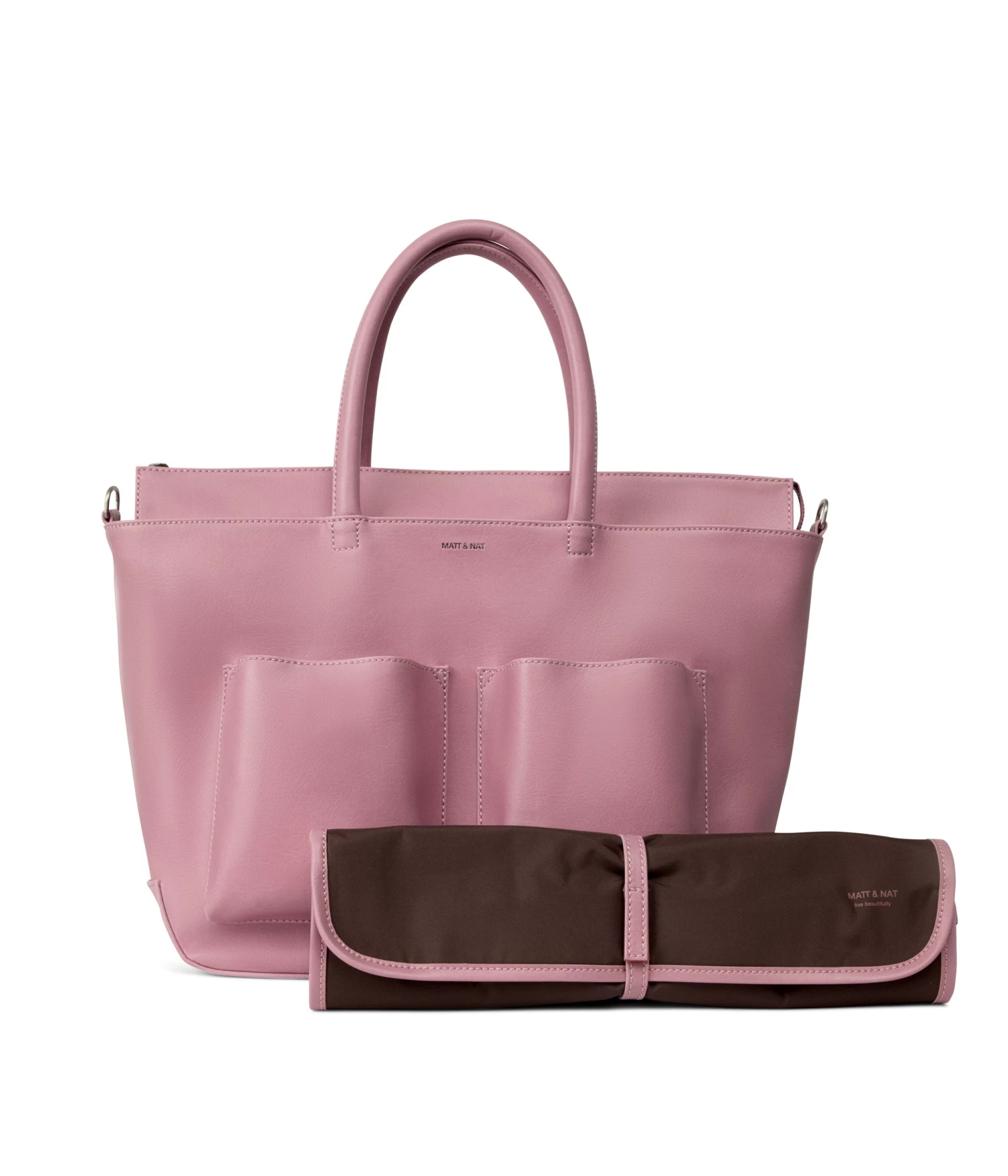 Large pockets along front and back of bag. Top zipper closure. Changing pad included.Can fit a 13” laptop.