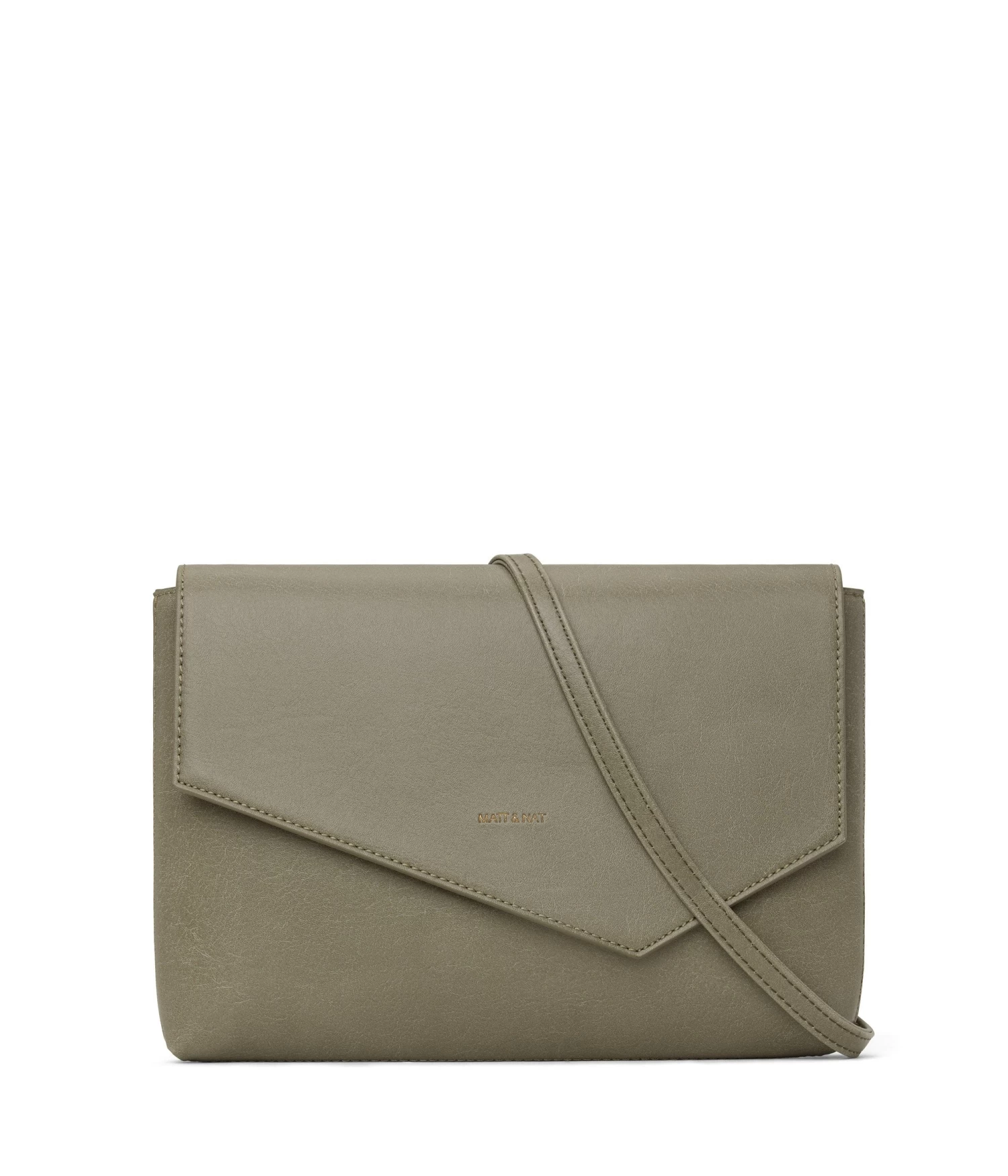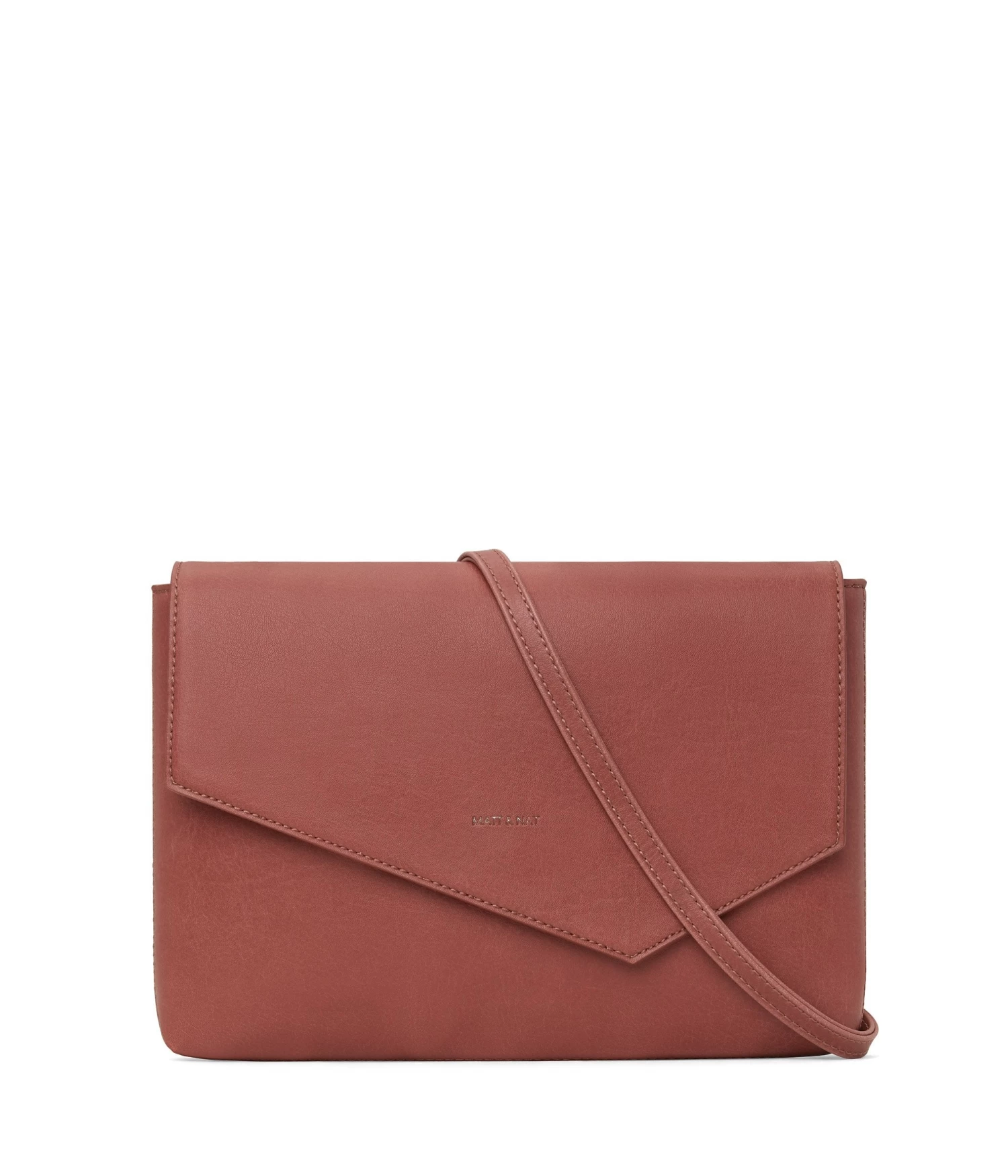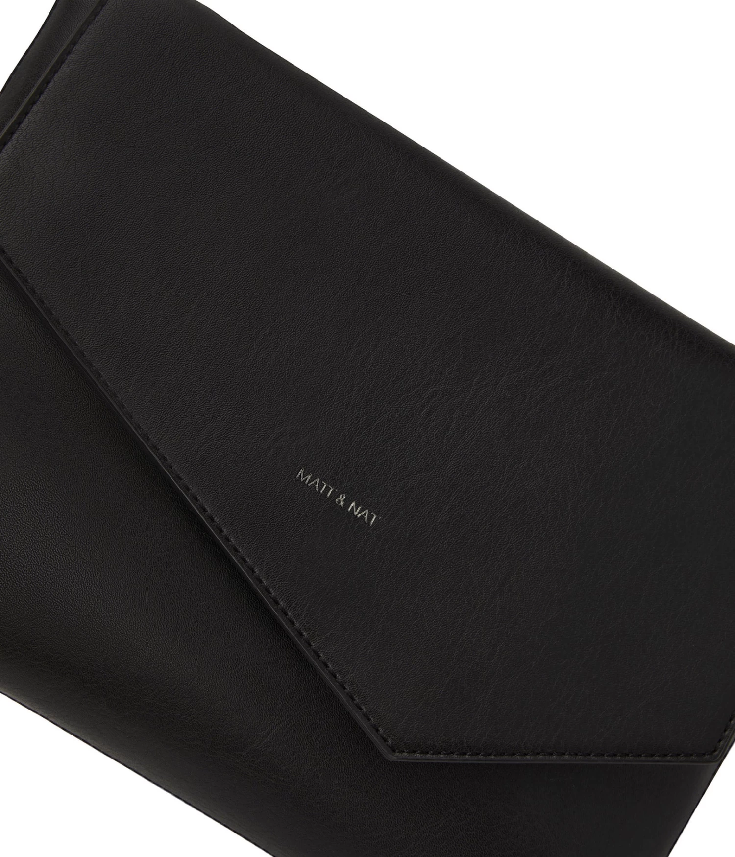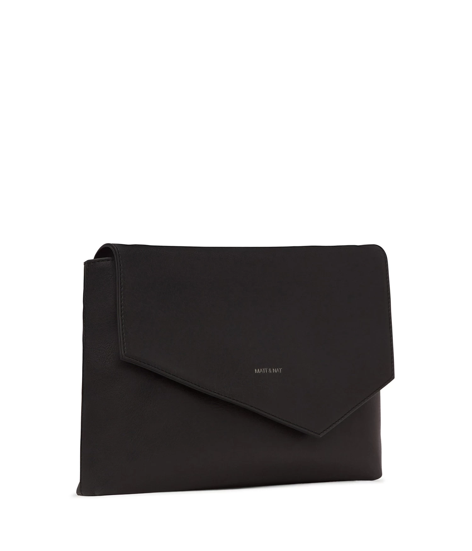 Clutch with asymmetrical flap and main compartment zipper closure for security. Comes with a shoulder strap that is removable and adjustable with snaps.
