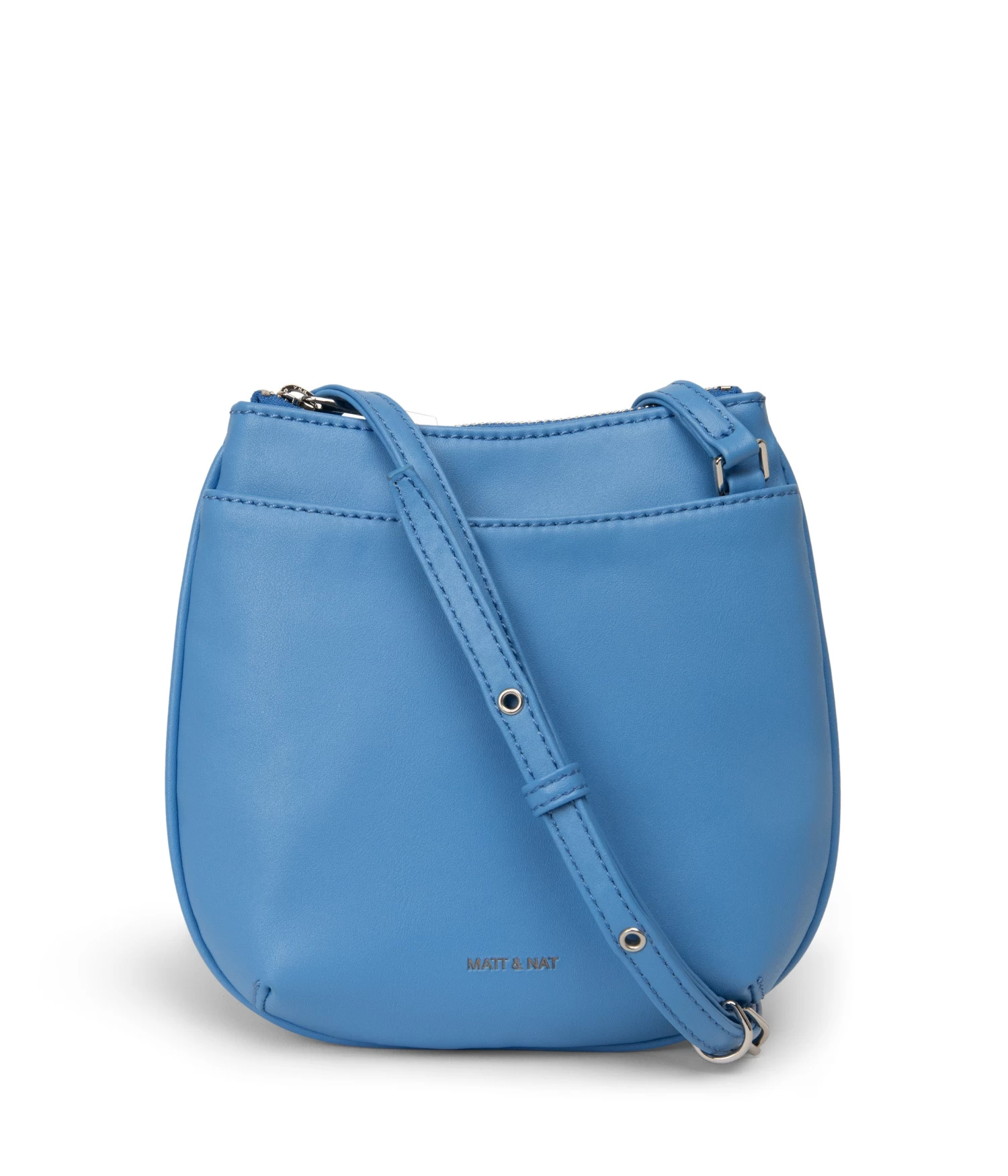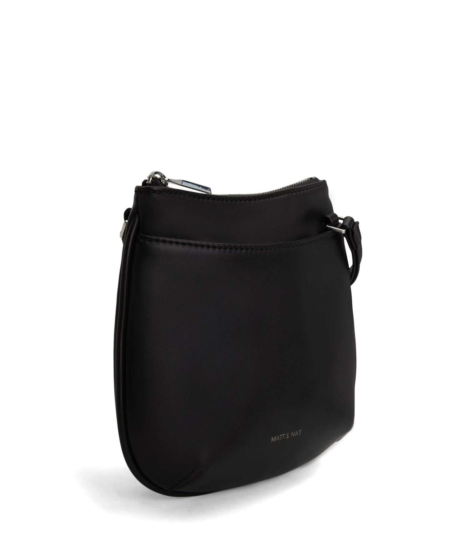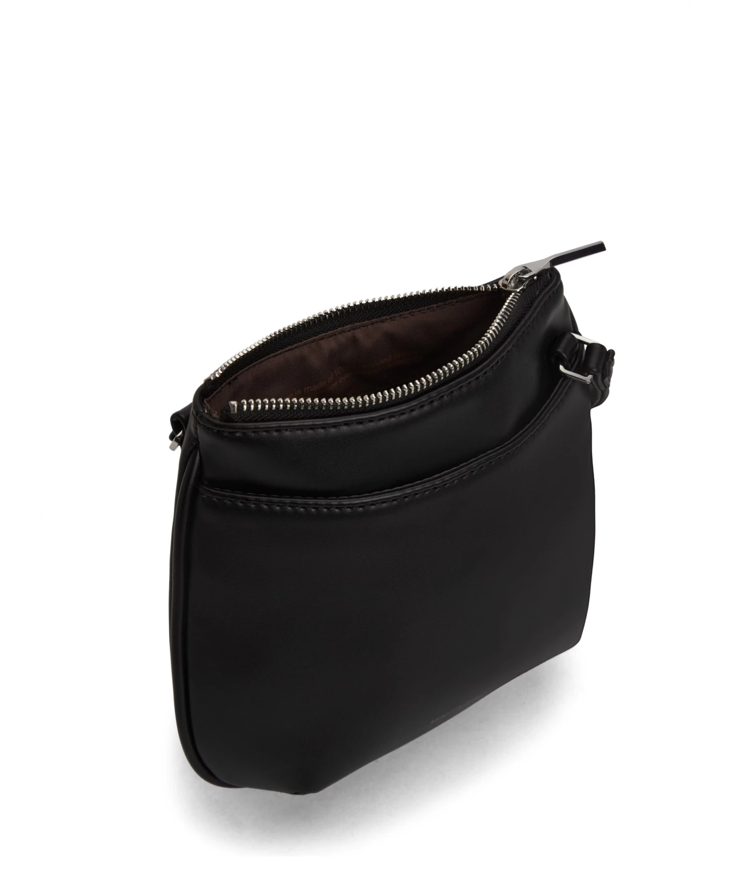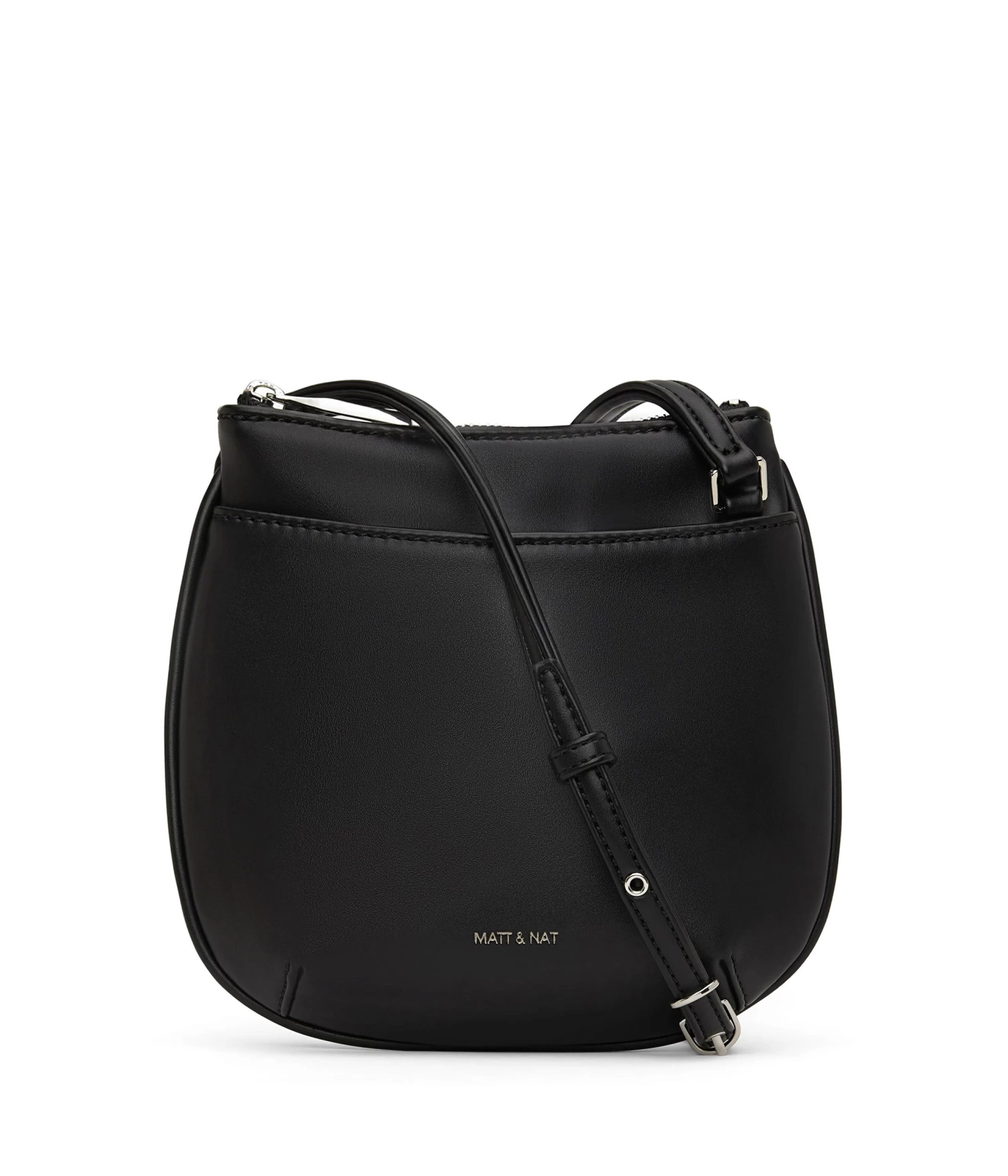 Small crossbody bag with an adjustable strap, top zipper closure, and front slip pocket with magnetic snap.