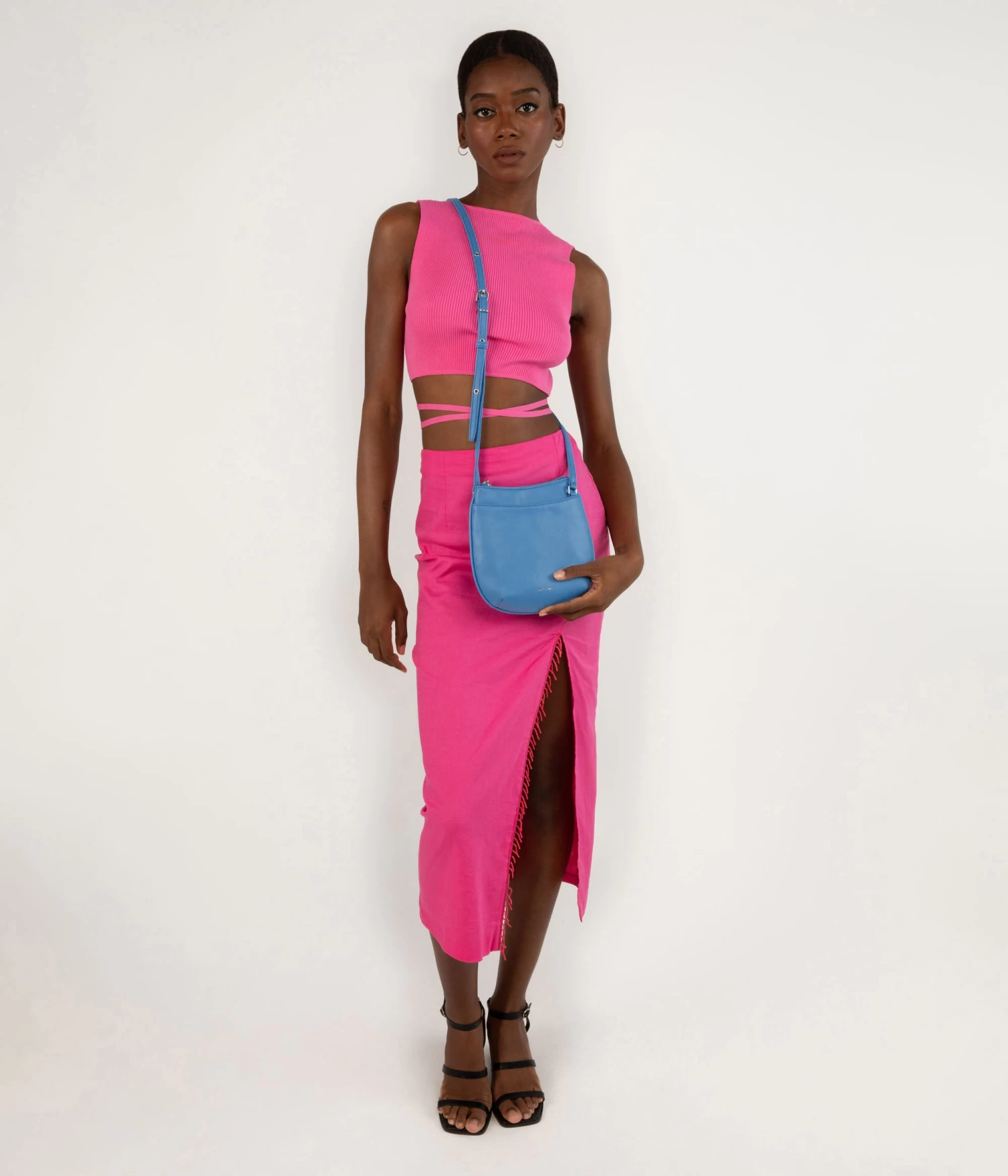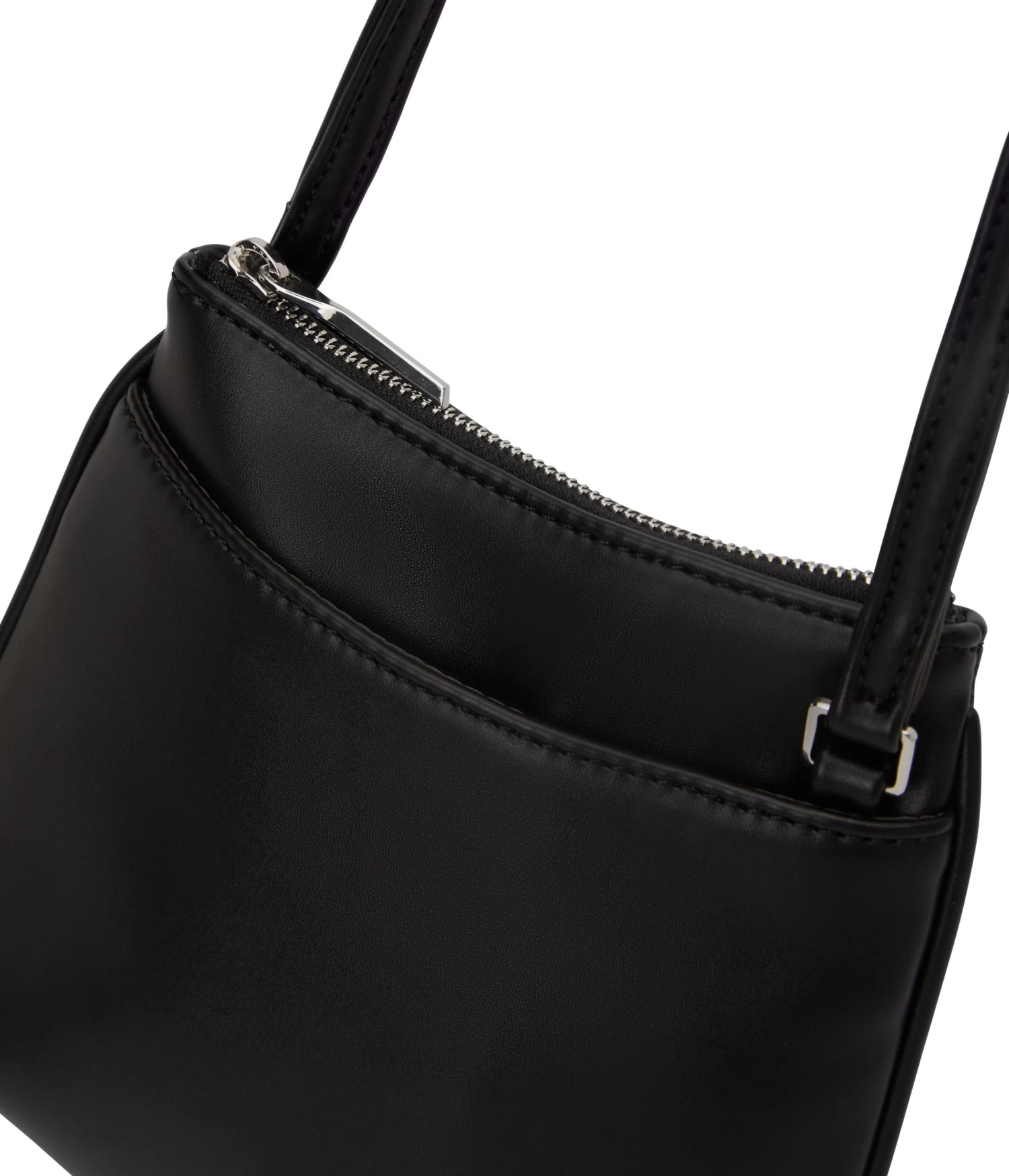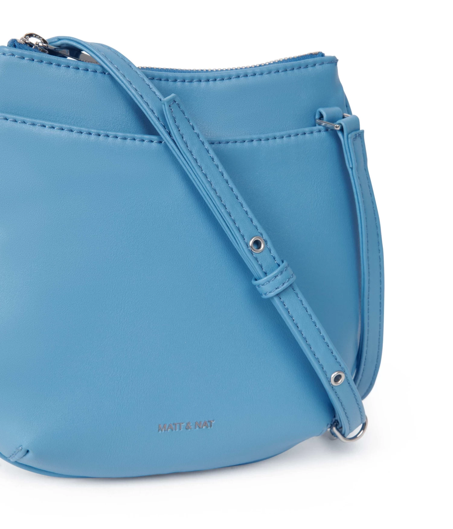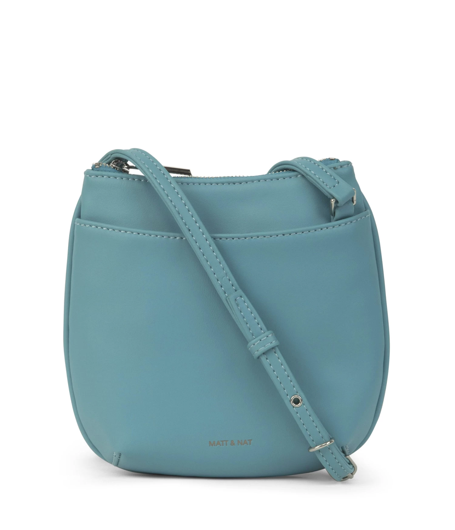 Small crossbody bag with an adjustable strap, top zipper closure, and front slip pocket with magnetic snap.