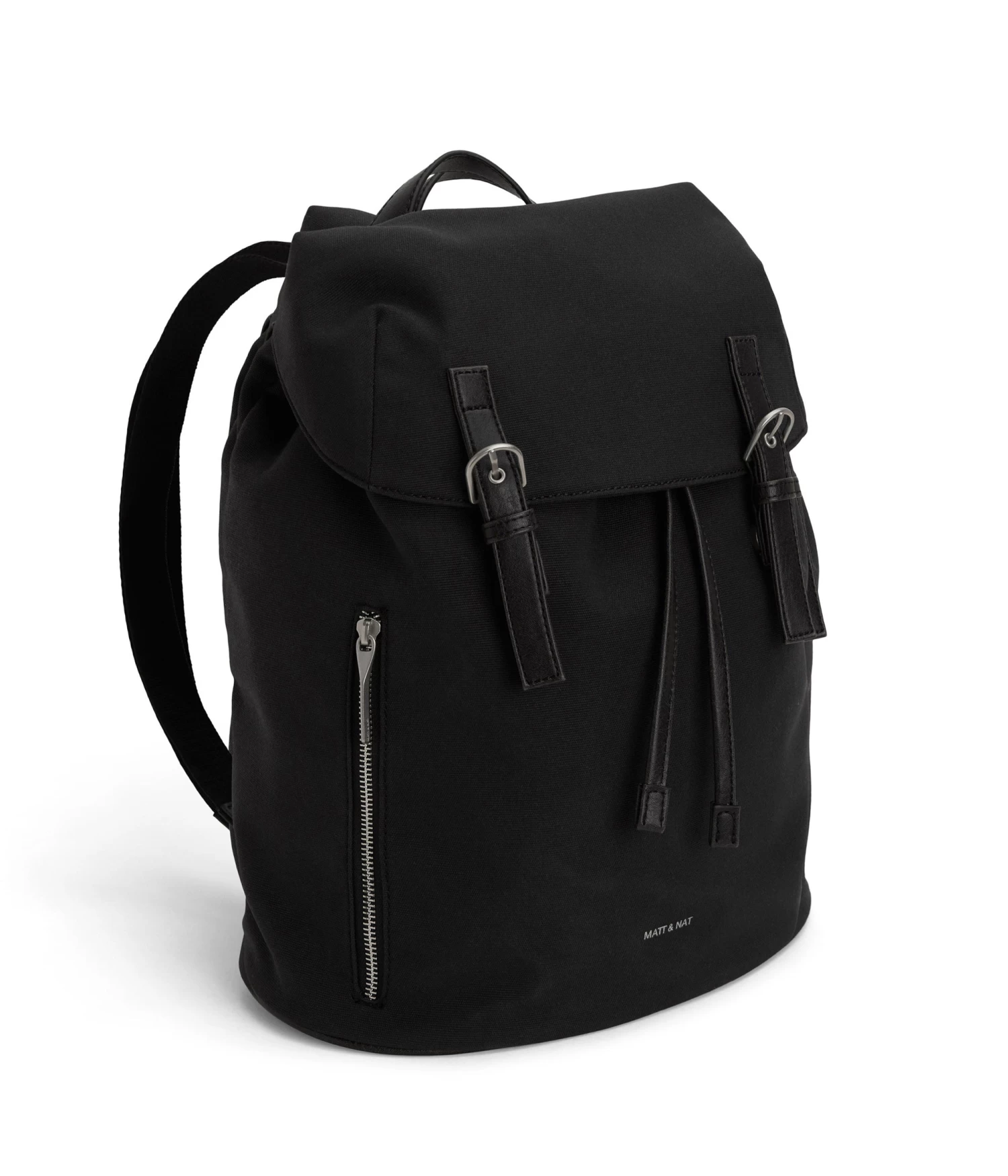 Backpack with drawstring and double magnetic snap flap closure, adjustable webbing straps, top handle, and a front zippered pocket.