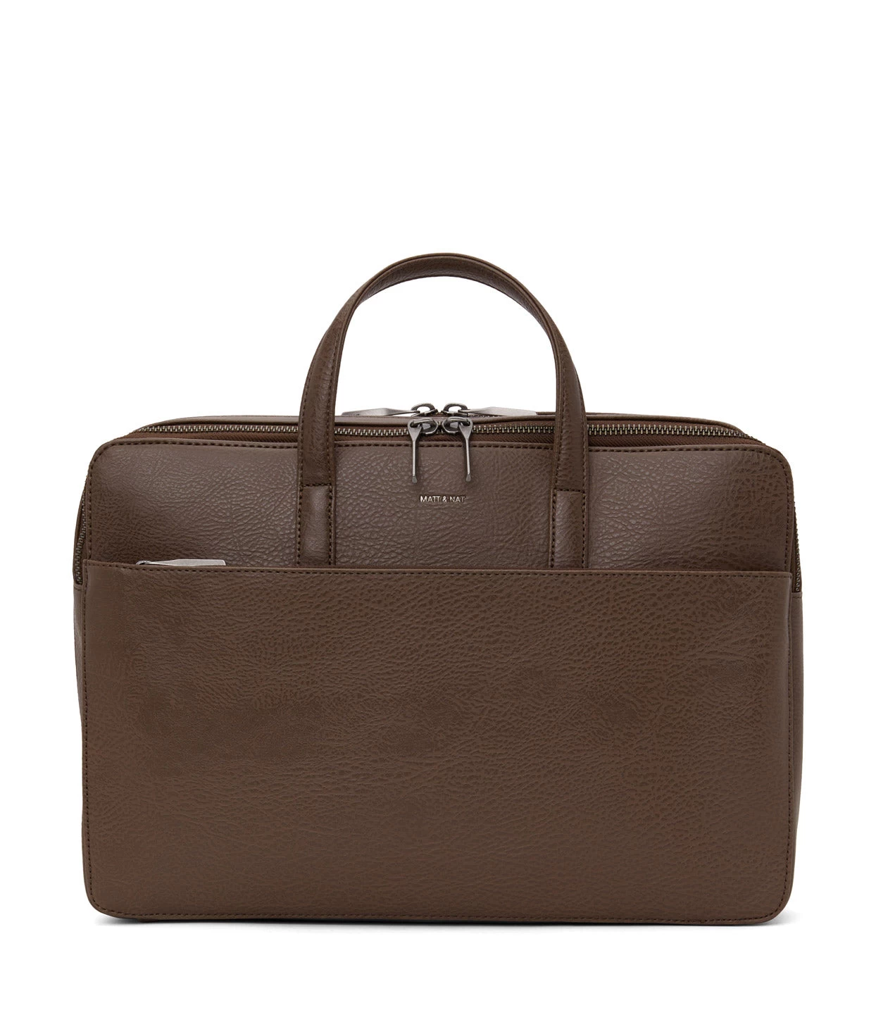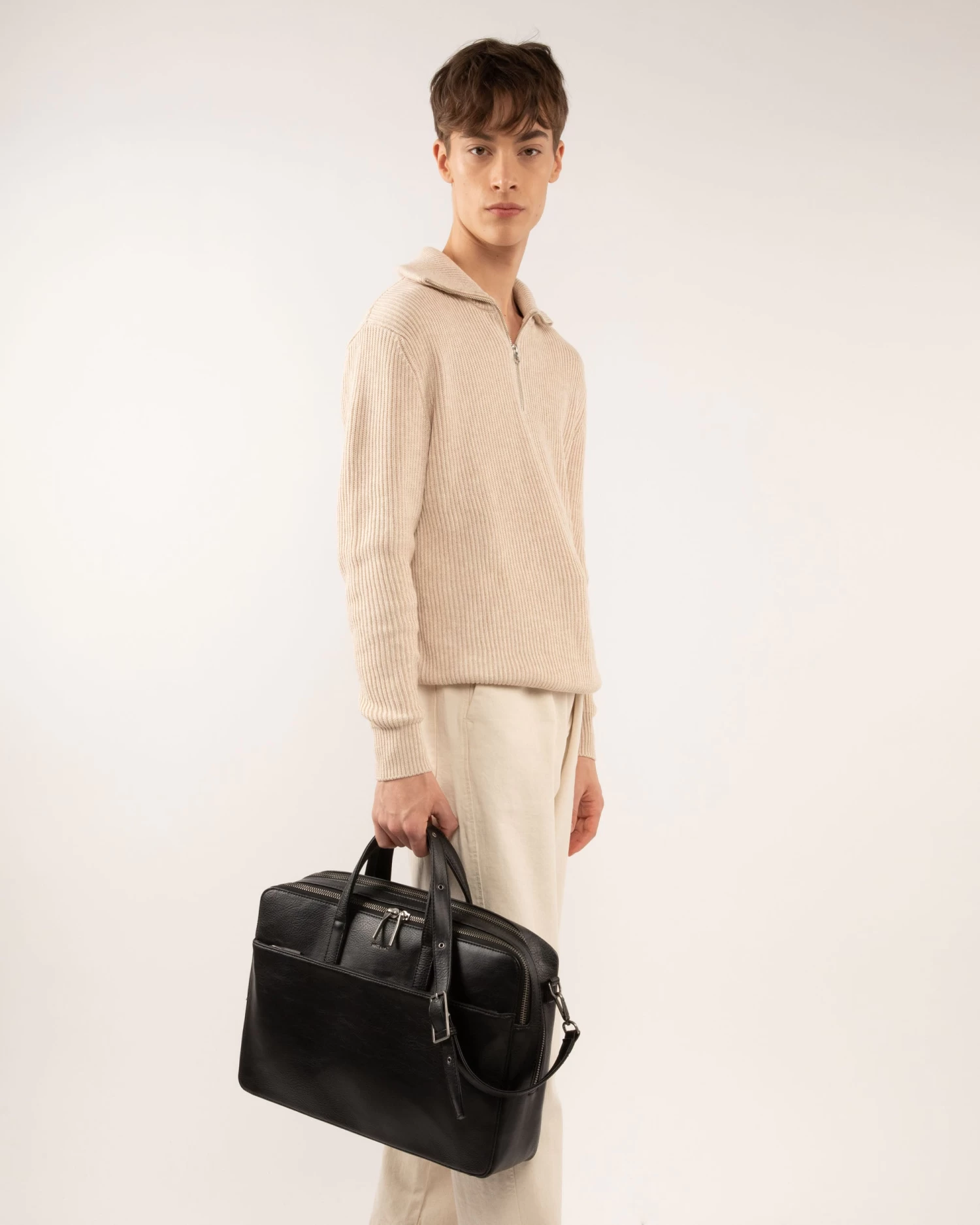 Briefcase with adjustable and removable strap. Two compartments with top zipper closures and a large front zipper pocket.