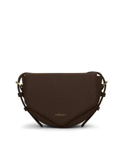 Saddle crossbody bag with flap closure, adjustable strap, and a card slot at the exterior back.