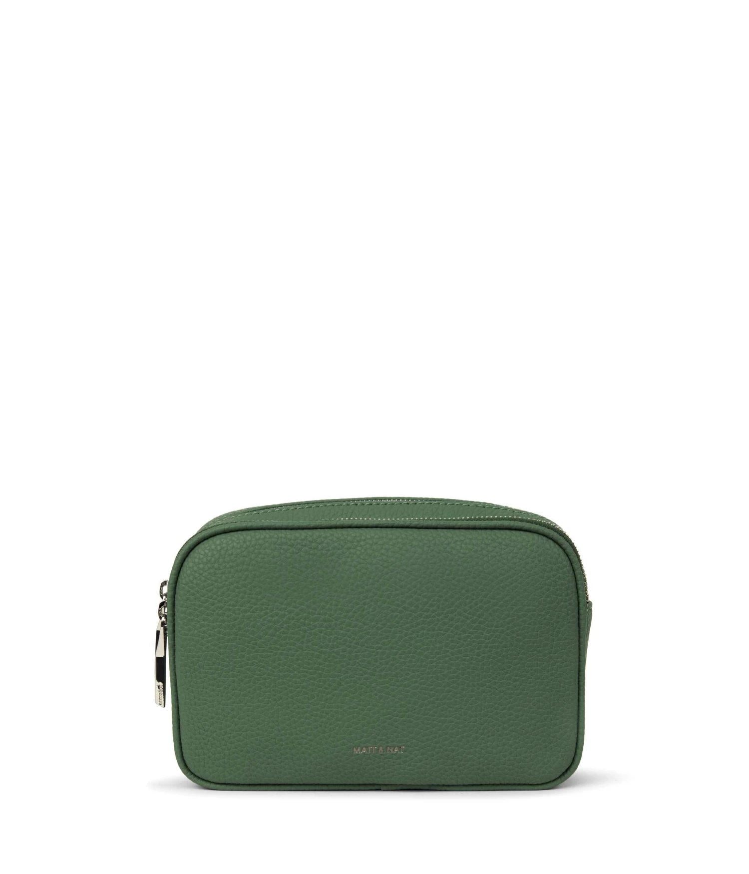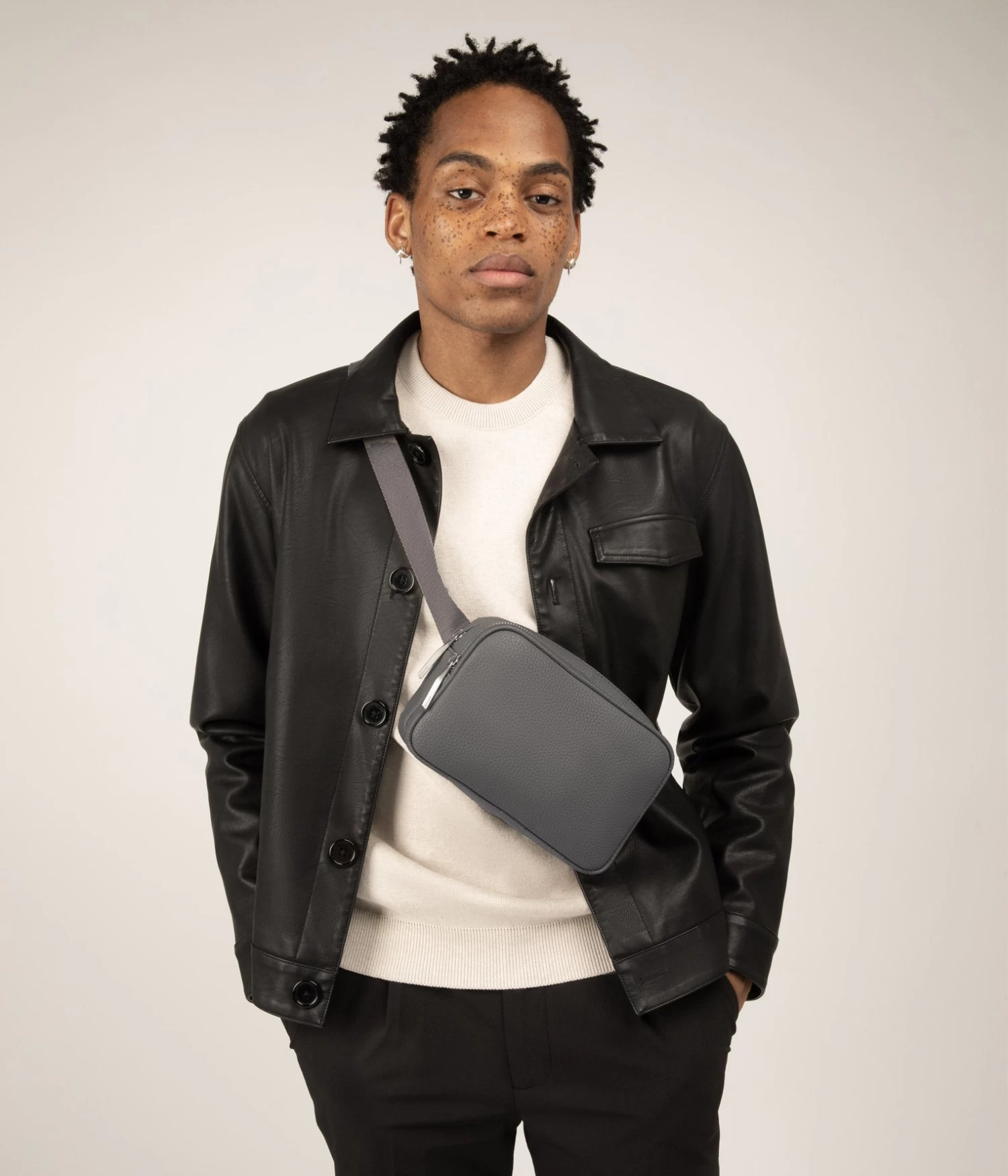 Belt bag with two zippered compartments, a flat pocket with snap closure and a single card slot at the exterior back. Adjustable belt strap for comfortable wear around the waist or across the chest.