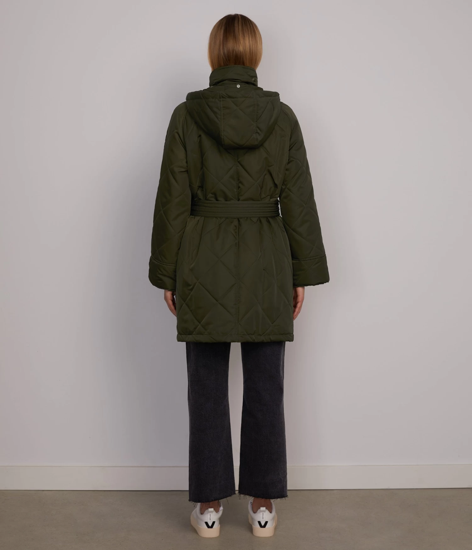 Raglan sleeve jacket with self-belt, large cargo pockets, zippered pocket at chest, removable snap-off hood, and concealed front zipper closure.